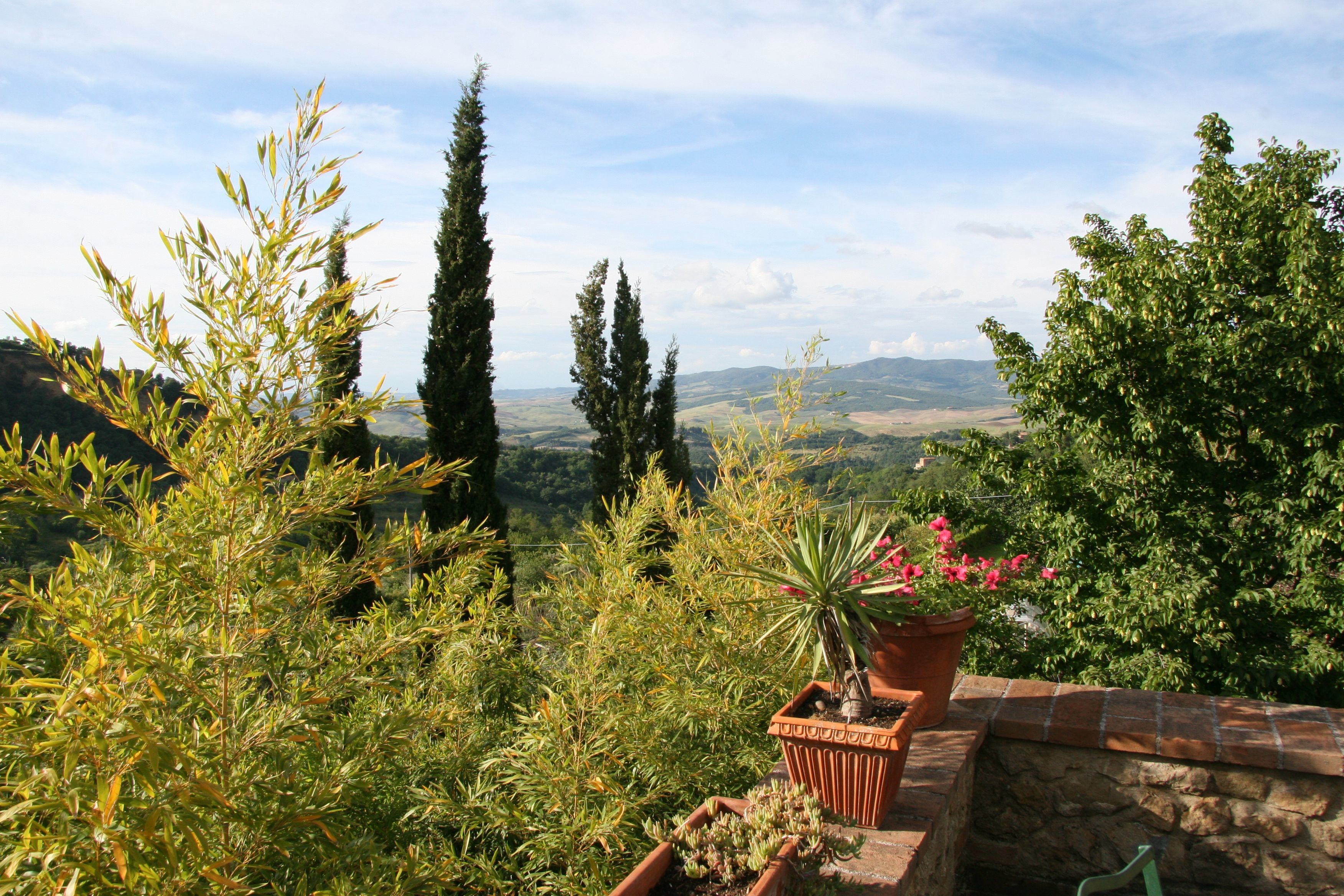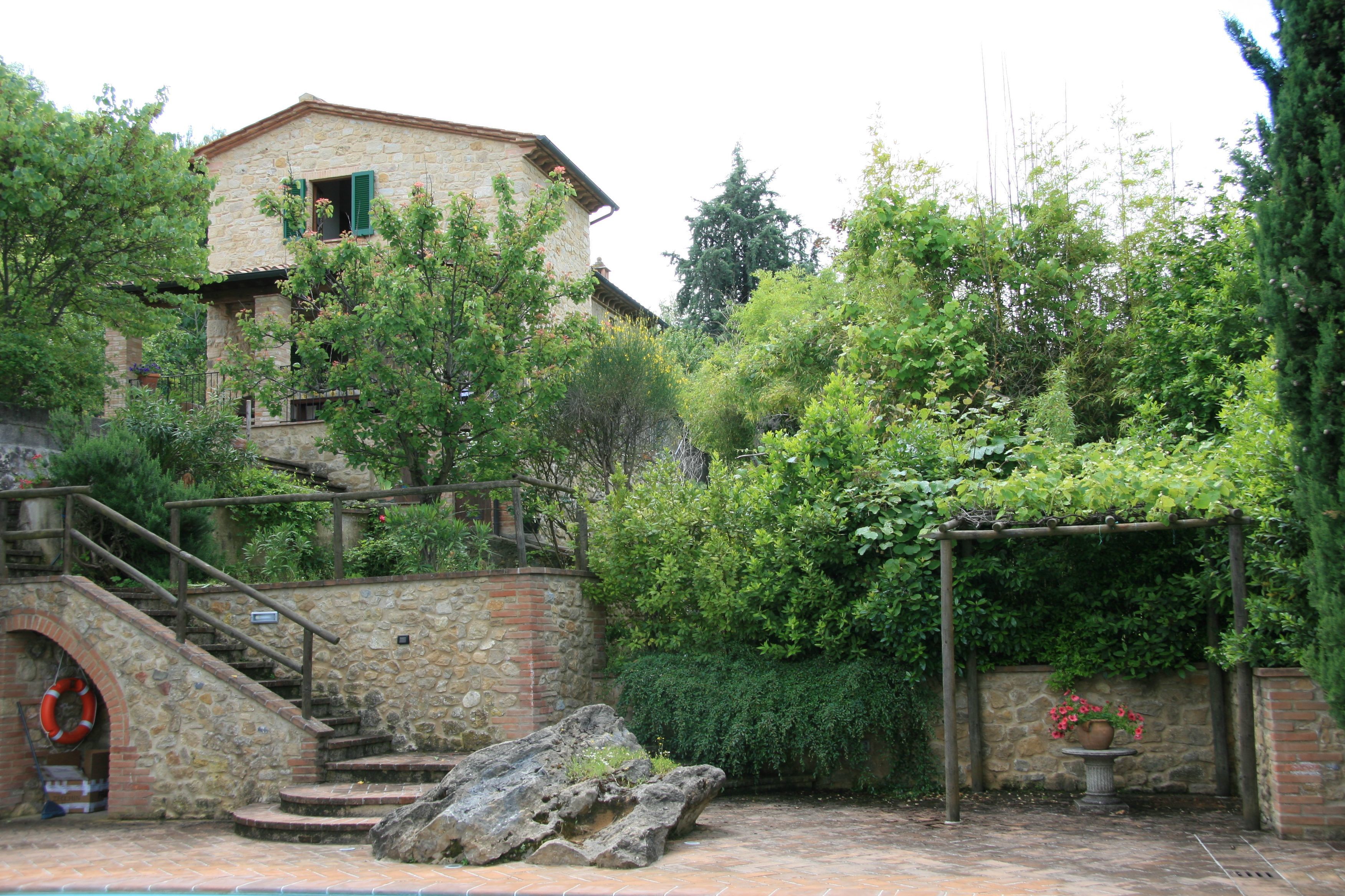 I agree with other reviewers that the photos on the website don't do Le Pergole justice. I've posted additional photos to give a better sense of the beautiful grounds and the amazing views. The location is private and serene, with its own olive grove, cherry trees and two small fish ponds. The view of the Chiesa in Volterra at sunset is spectacular, and goes well with a nice bottle of wine. The spacious, beautiful pool area is set below the level of the house and surrounded on 3 sides by walls, stones and tall trees, combining a real sense of seclusion with a spectacular view of the valley below.