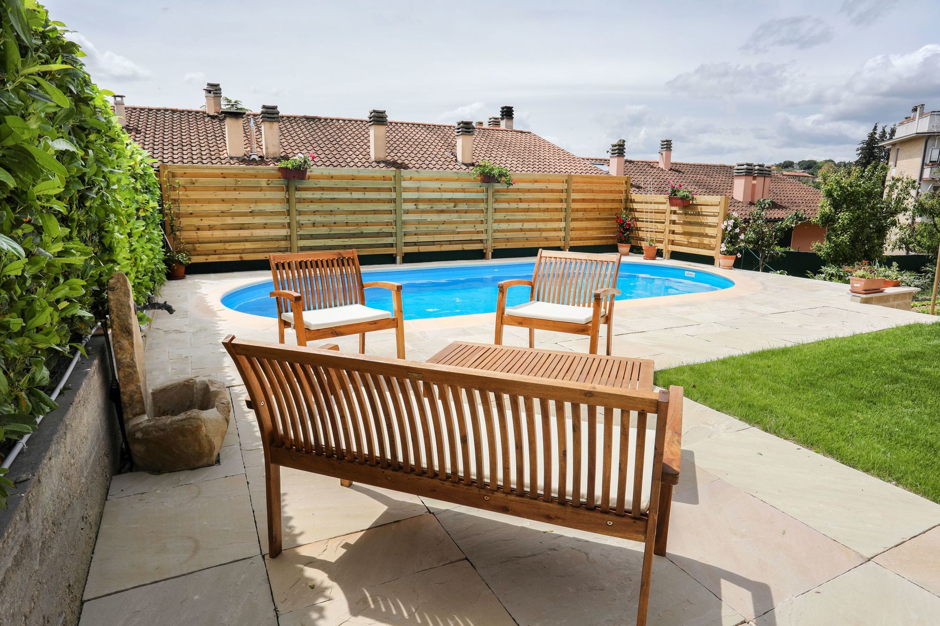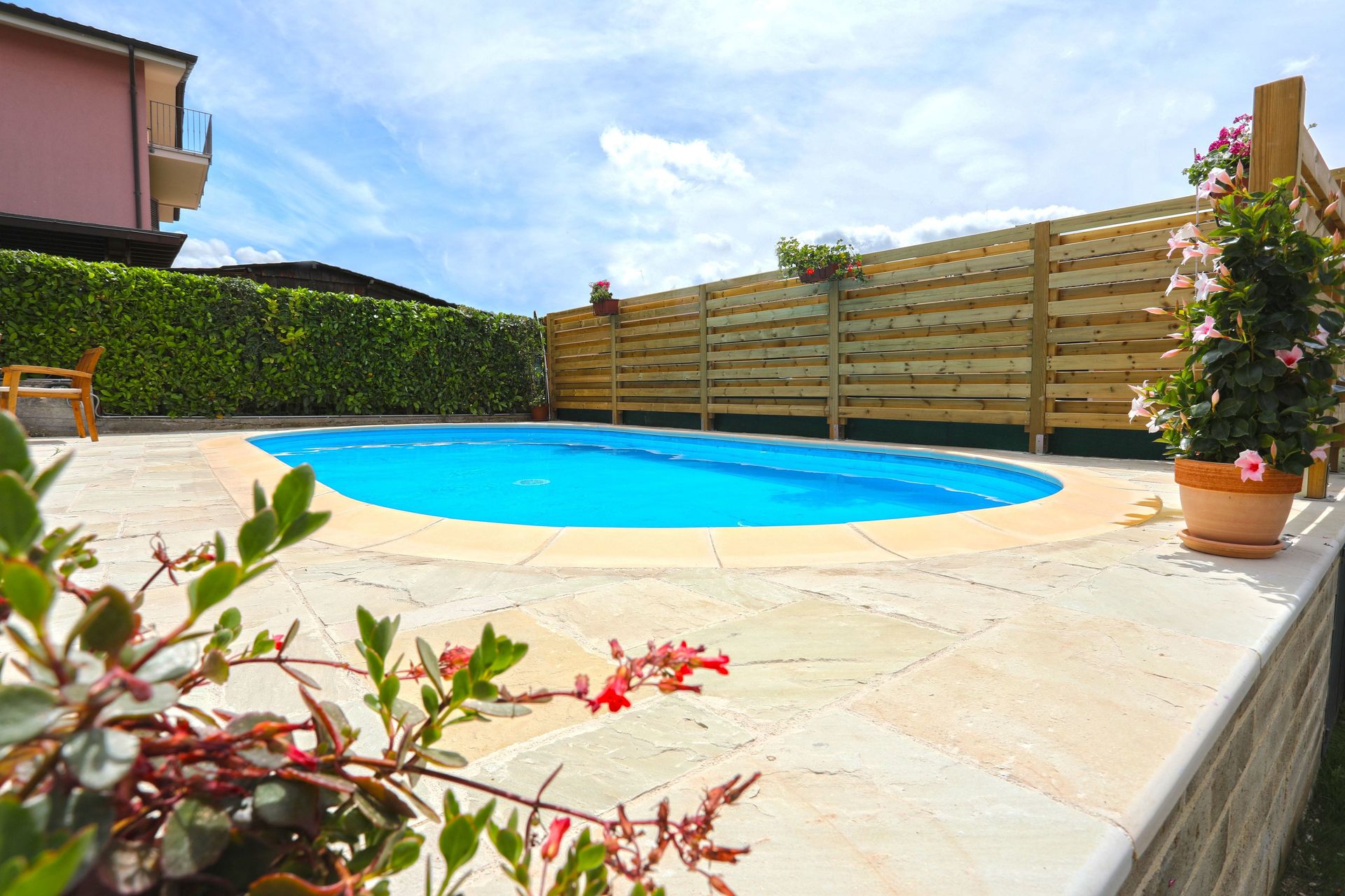 Tuin: zwembad (privé, breedte: 3.5m, lengte: 8.3m, diepte: 1.3m, buiten), barbecue, barbecue, eettafel (personen: 6), tuinmeubilair, omheind.