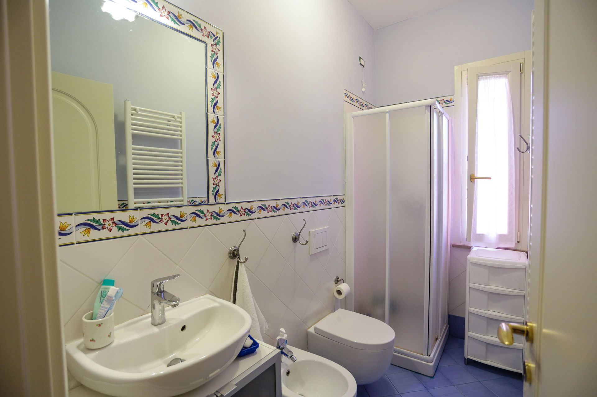 Badkamer: wastafel, toilet , bidet, douche, haardroger.