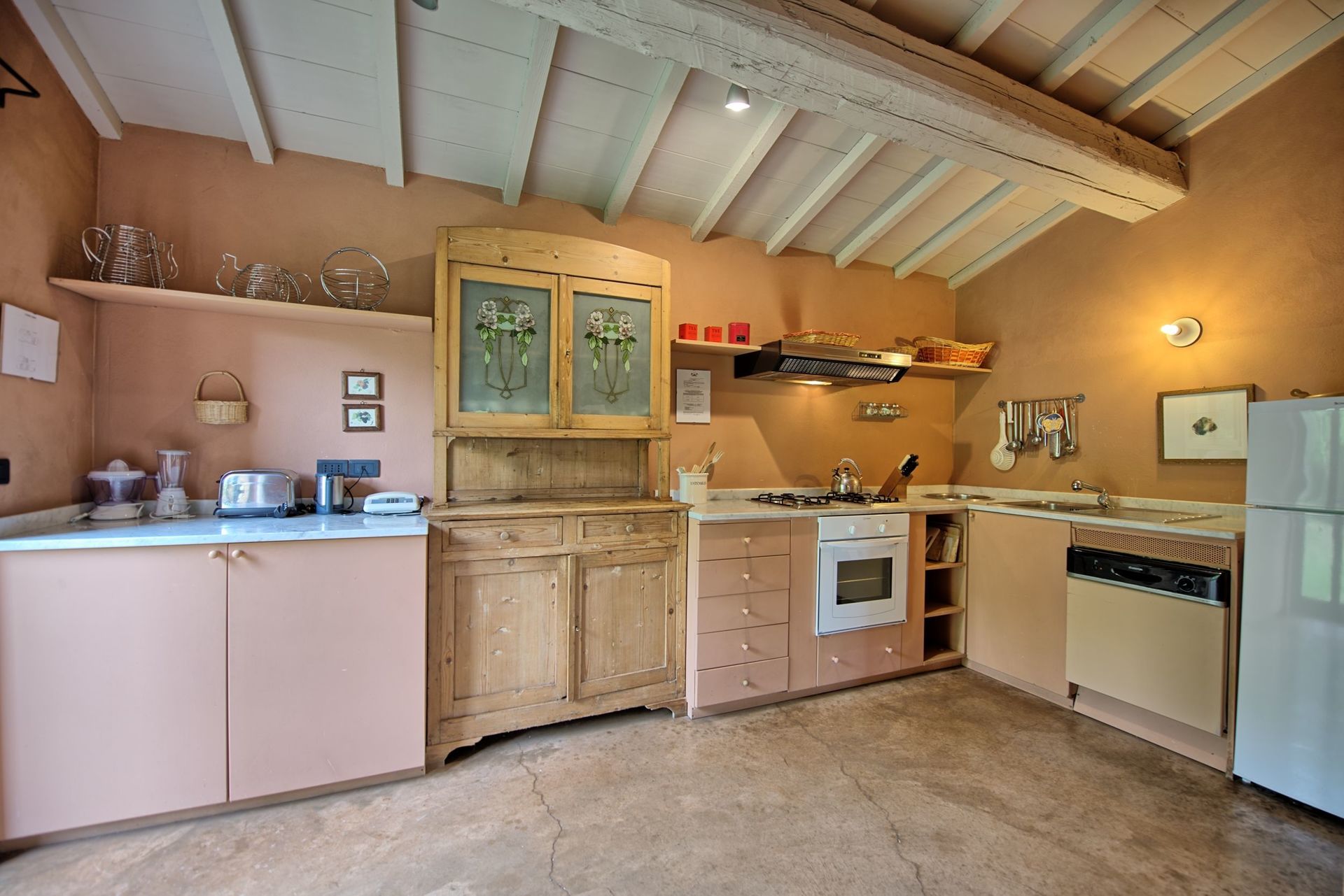 1 step up: dining room with a direct access to the garden, fully equipped kitchen with oven, fridge with freezer, dishwasher, toaster, kettle, squeezer.