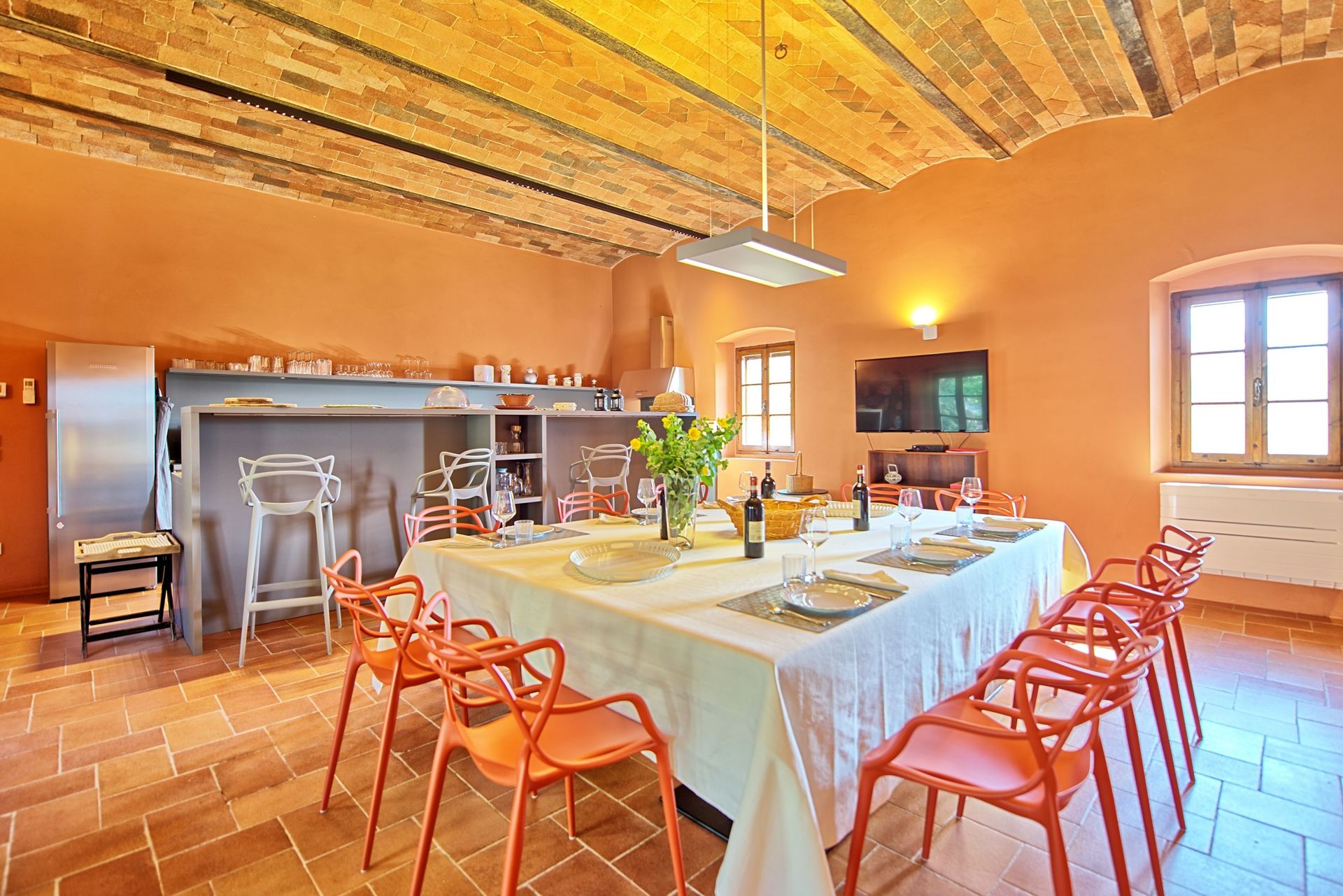 Ground Floor: Entrance leads into a large open space with dining and living and kitchen all into the same room, equipped with sofas big dining table that can accommodate more than 10 people, TV LCD satellite and fully equipped kitchen with electric stove (6 burns) two electric ovens, microwave, espresso machine, American coffee maker, toaster, kettle, dishwasher, fridge and freezer; behind the kitchen there is also a separate dining room with big wood table, from the living dining area a door take out to the external equipped area.