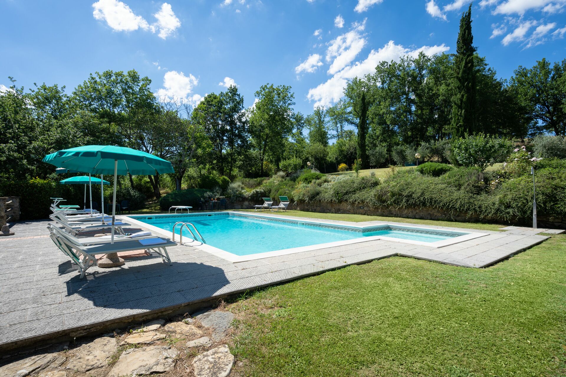Tuin (20000 m2): zwembad (breedte: 6m, lengte: 12m, max. diepte: 2.4m, min. diepte: 1.2m), WIFI internet, tuinmeubilair, omheind.