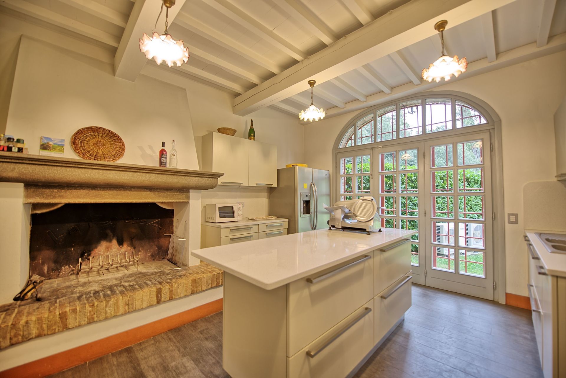 Begane grond: woonkamer met open haard en eetruimte en grote open kamer met grote ramen met direct uitzicht op de tuin, wc, keuken (magnetron, oven, koelkast met ijsmachine, espresso apparaat) met open haard en uitgang naar buiten.