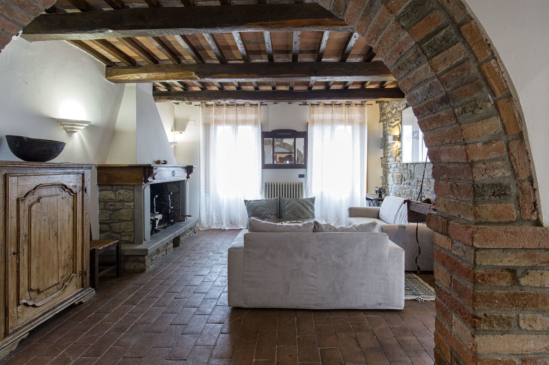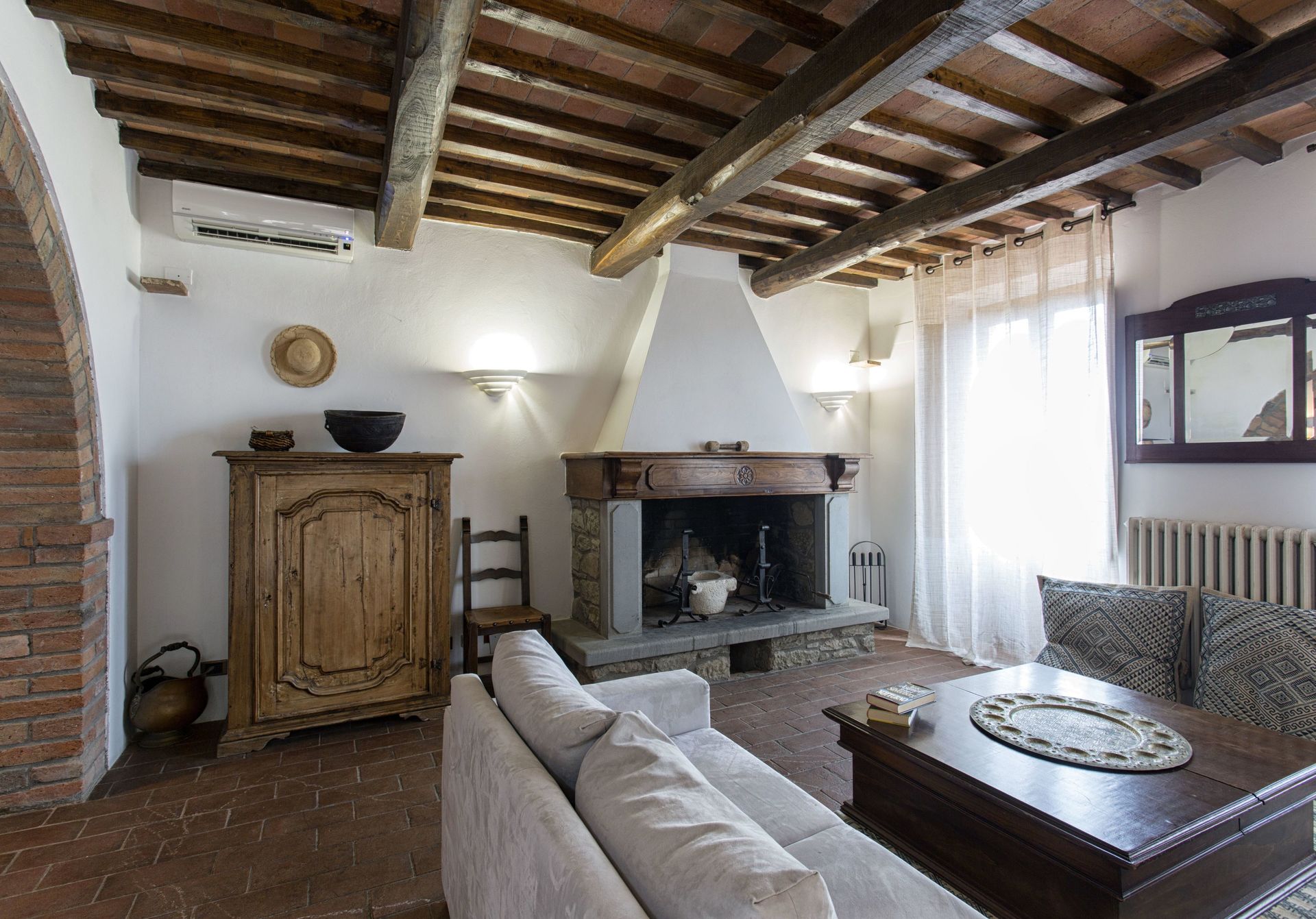 Woonkamer: bank (personen: 4), open haard, tweepersoons-slaapbank, airconditioning, uitgang naar het terras.
