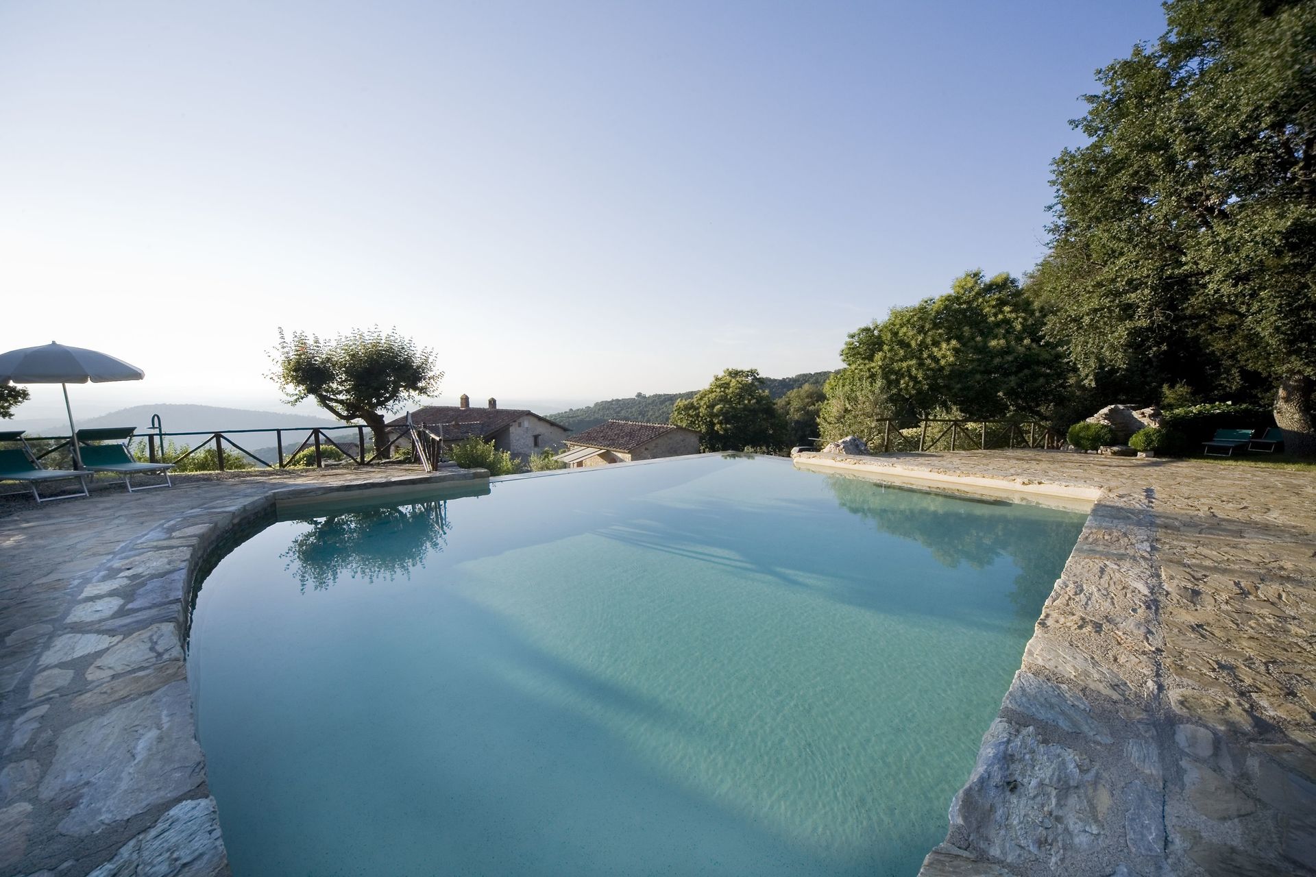 This Tuscany apartment with pool is both large and bright and is composed of a living room/kitchen, two double bedrooms and a bathroom. The living room is dominated by a traditional Tuscan fireplace and has a comfortable sofa bed, a table and chairs and an open space kitchen. The kitchen has everything necessary including a stovetop, oven, dishwasher, kettle, toaster, and refrigerator with freezer. Upon request we are happy to supply you with a microwave.