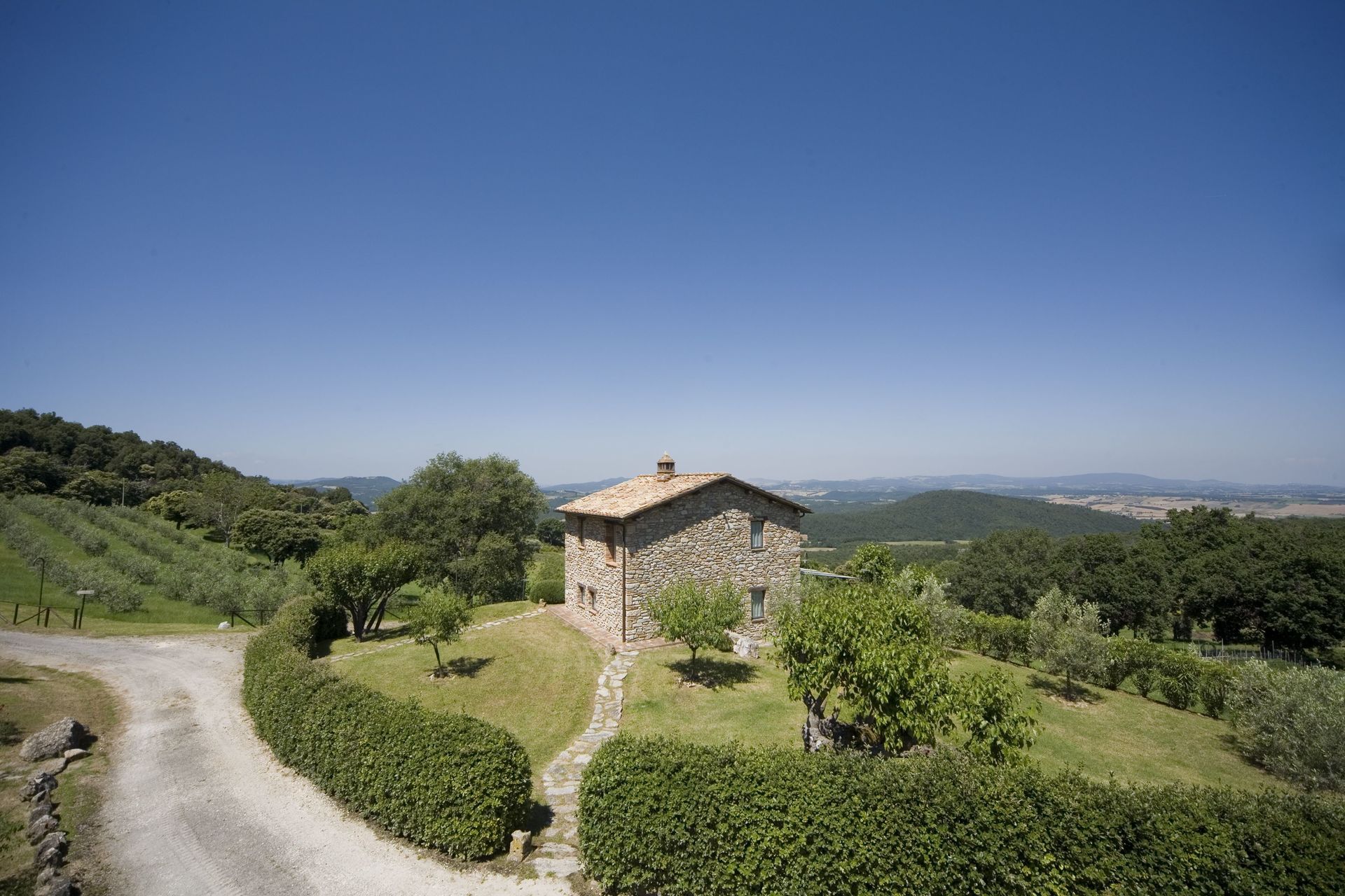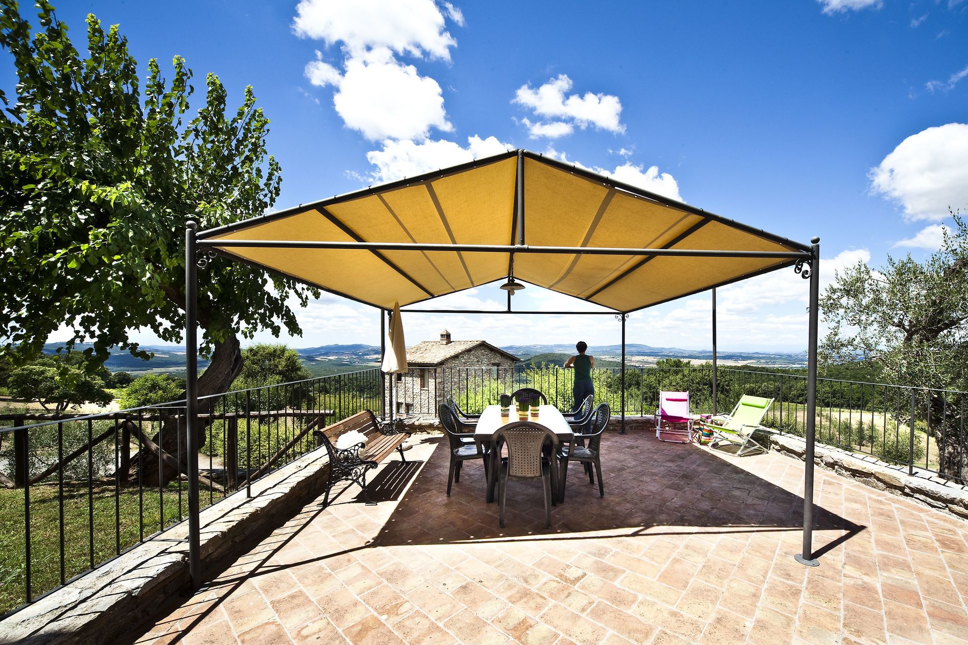 The apartment has two double bedrooms. The first bedroom is bright and has a panoramic view, while the second bedroom has exposed stone walls. Between the two rooms there is a bathroom with a shower and a window with views to the nearby woods. Casa Vecchia also has a back covered patio area that has a table, chairs, chaise lounges and a barbecue and offers the perfect area for relaxing and eating outside with family or friends.