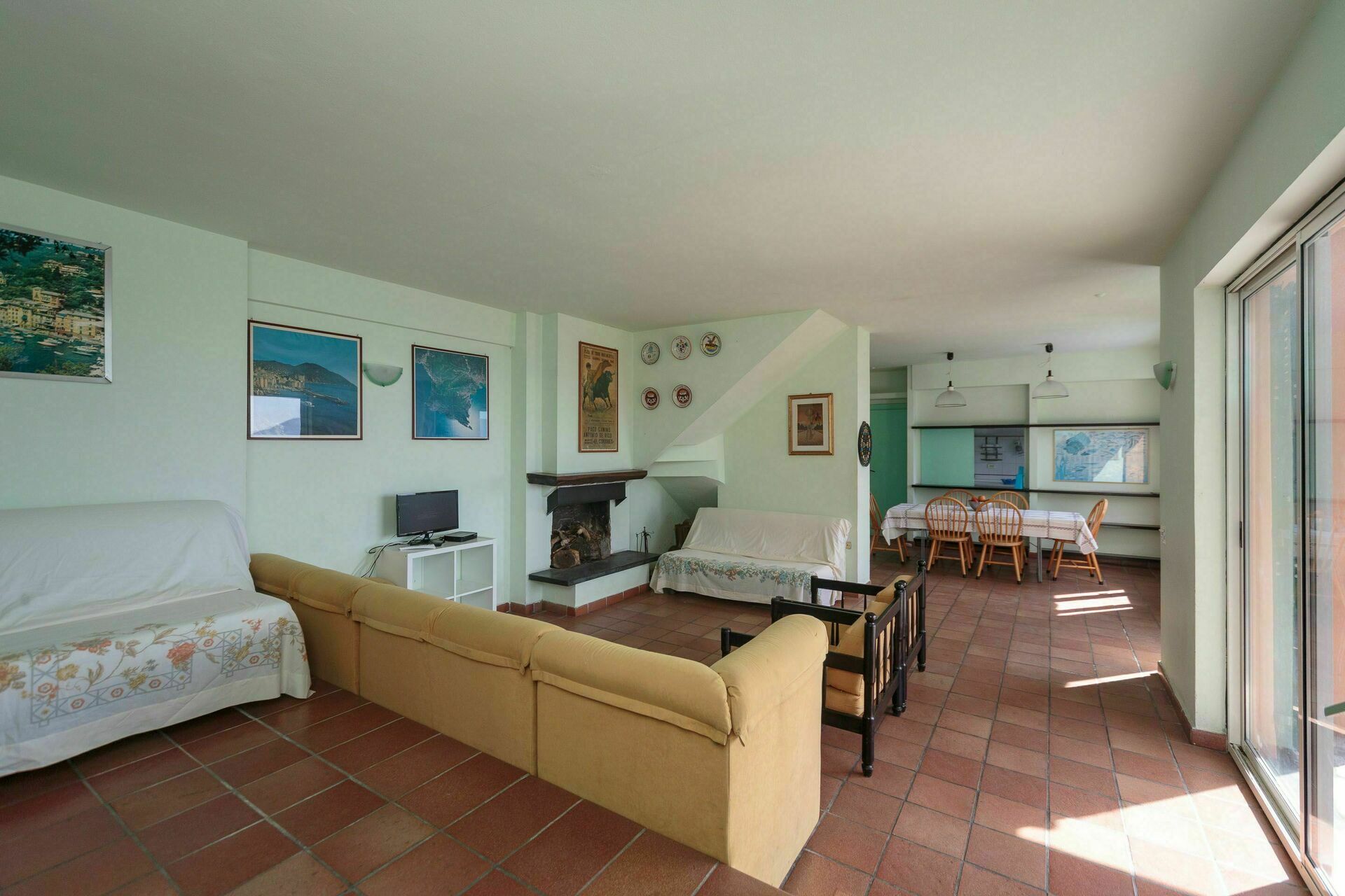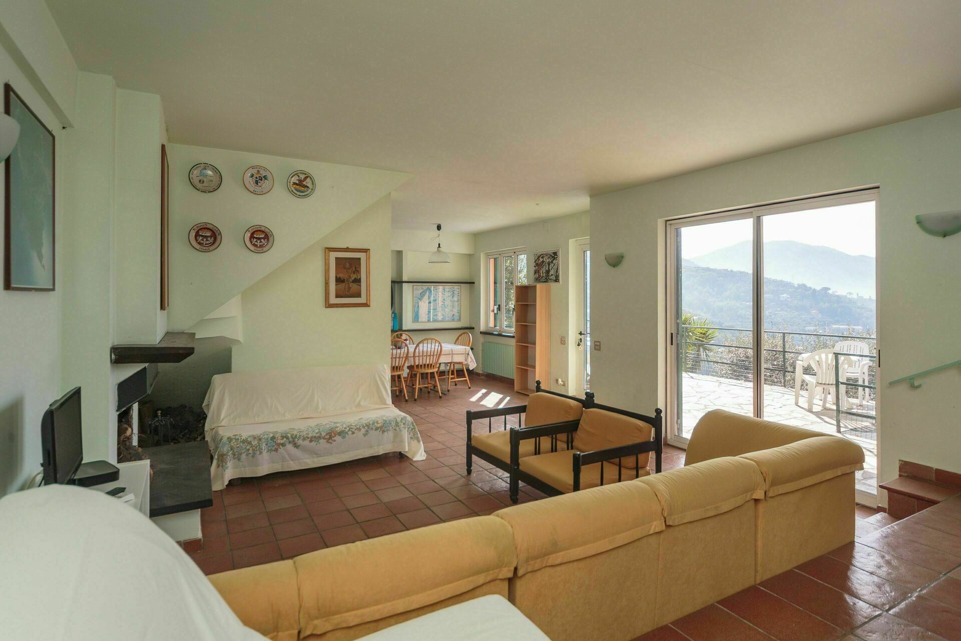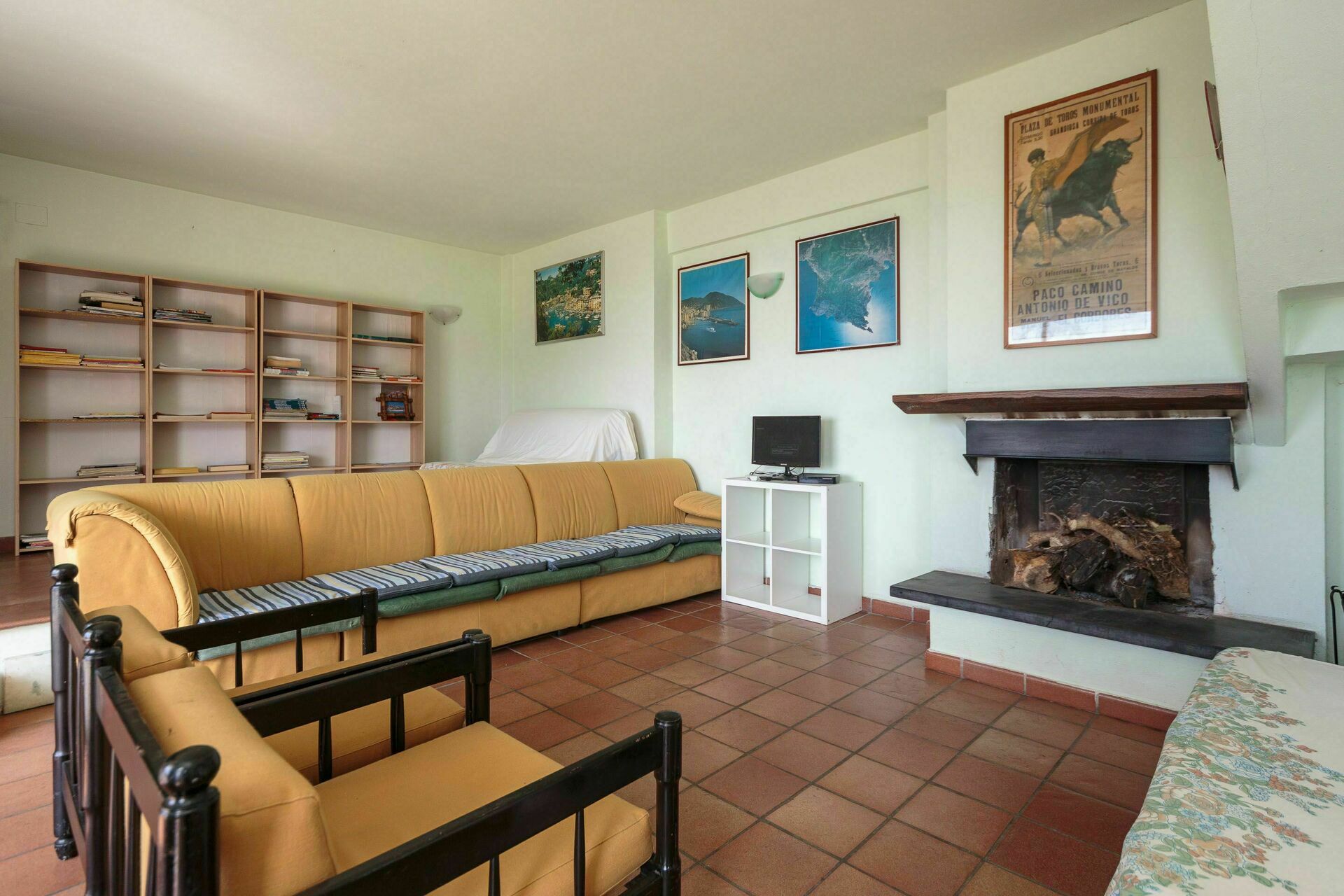 Woonkamer (50 m2): bank, open haard, tweepersoons-slaapbank, satelliet tv, uitgang naar het terras.