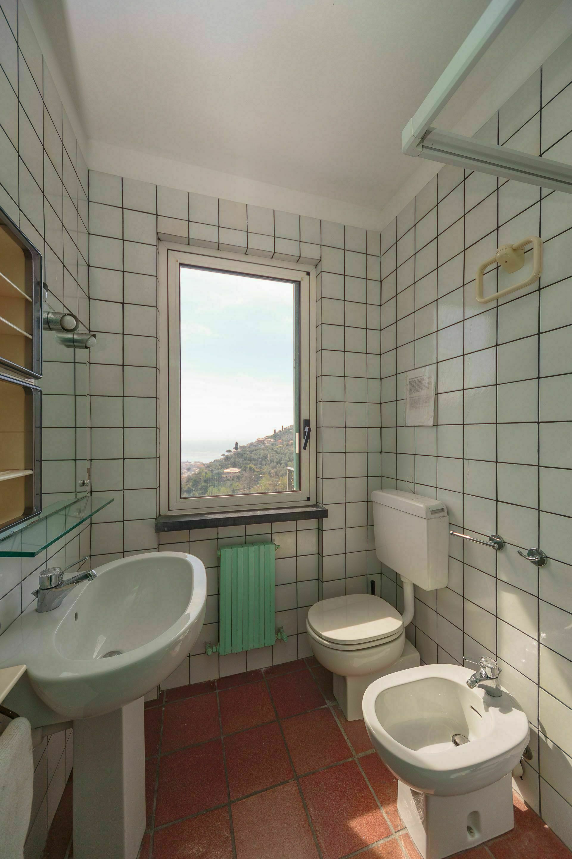 Badkamer (8 m2): wastafel, toilet , bidet, douche, wasmachine.