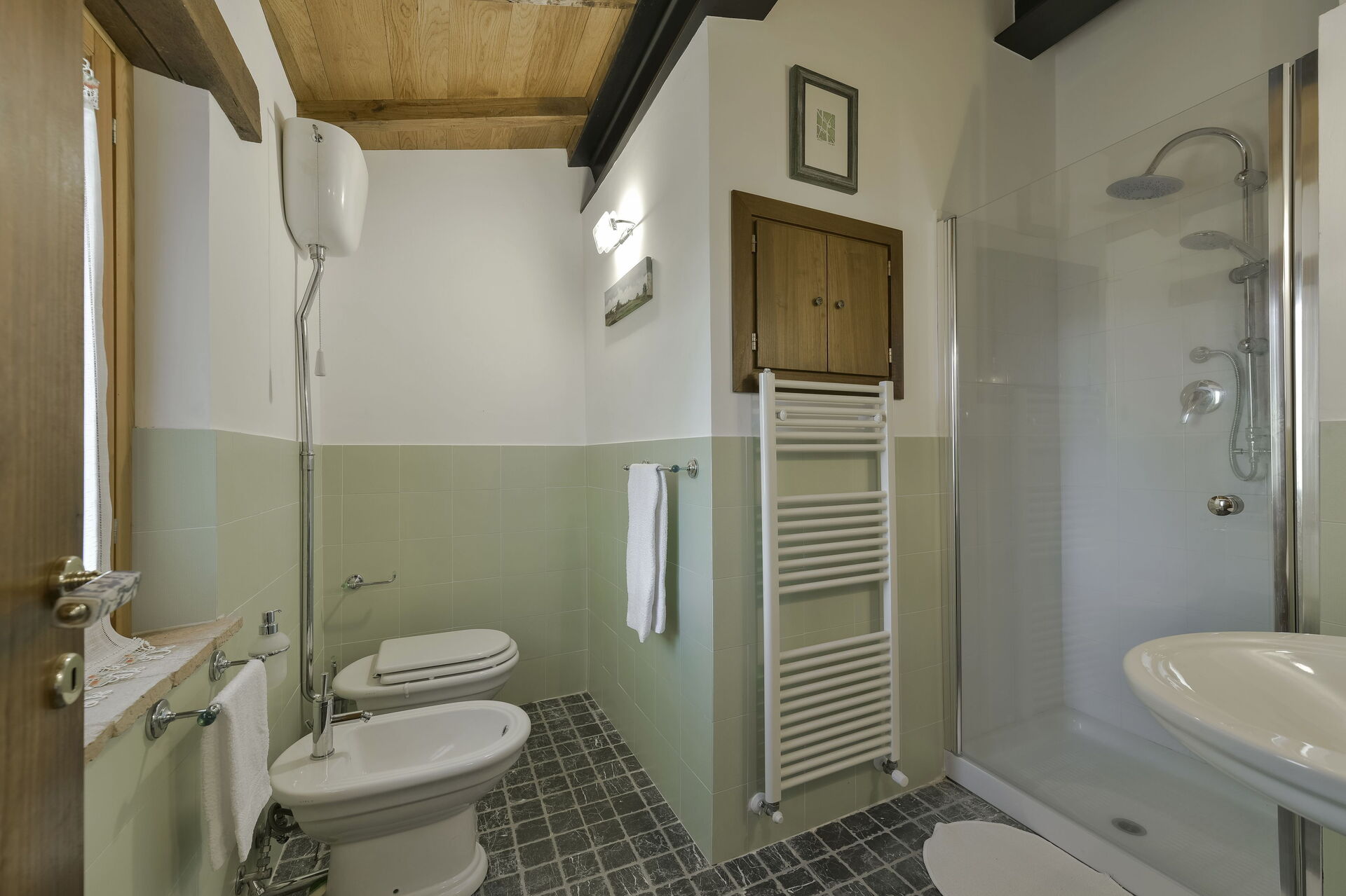 Badkamer: wastafel, toilet , bidet, douche, wasmachine.