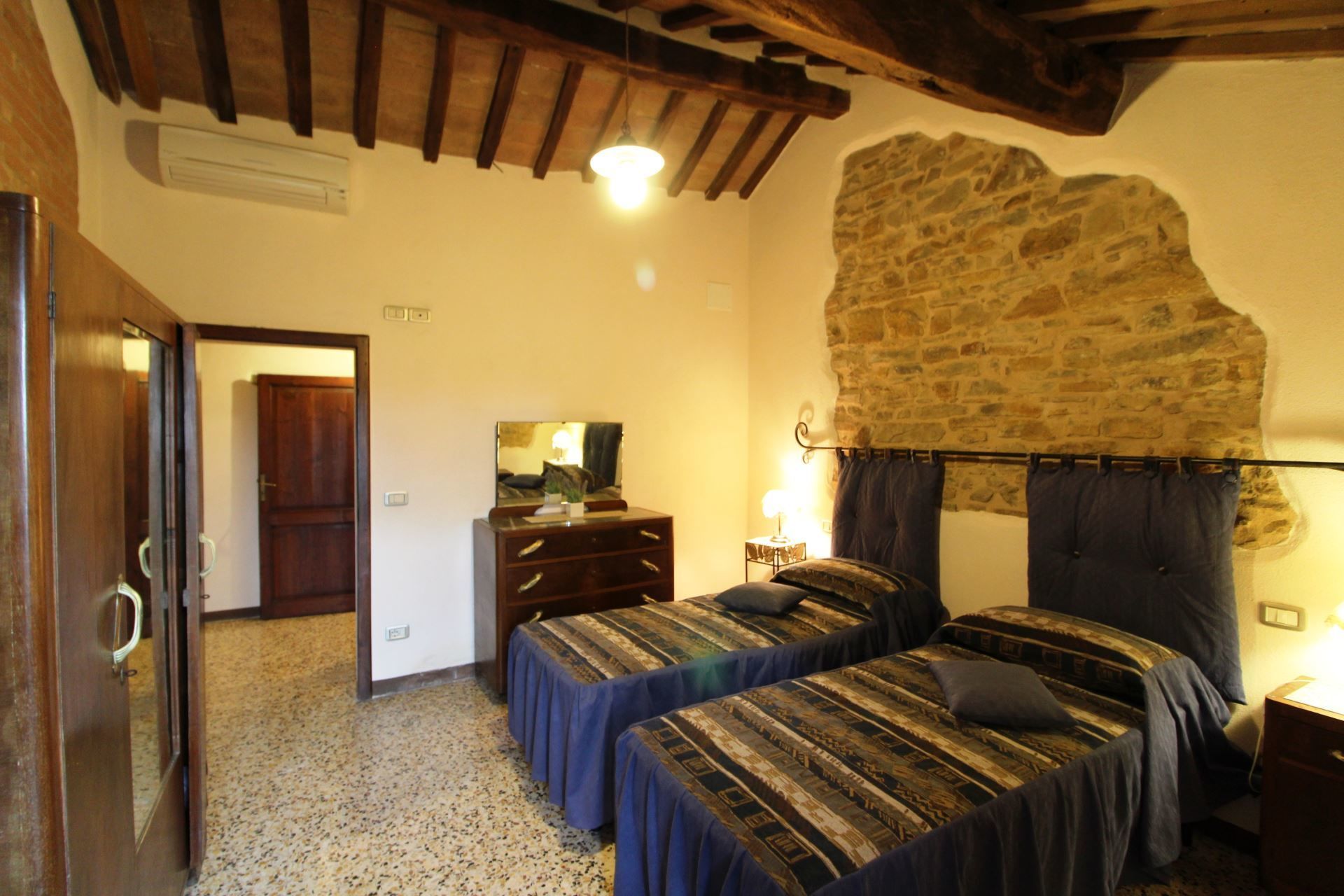 First floor apartment with entrance from external staircase, composed of living-dining room with kitchenette and large fireplace, double bedroom, twin bedroom (on request double) and bathroom with shower. The apartment has air conditioning, private parking space and private outdoor space equipped with table, chairs, deck chairs and sun umbrella.