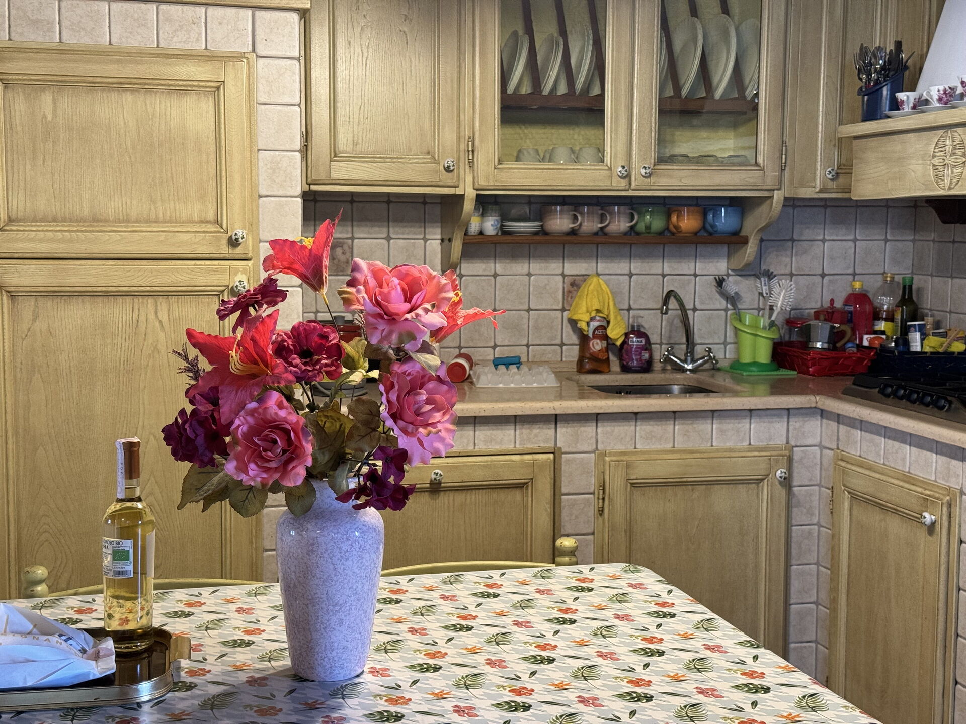 Keuken: eettafel (personen: 6), vaatwasser, ijskast, diepvriezer, magnetron, kookplaat, oven, uitgang naar het terras.