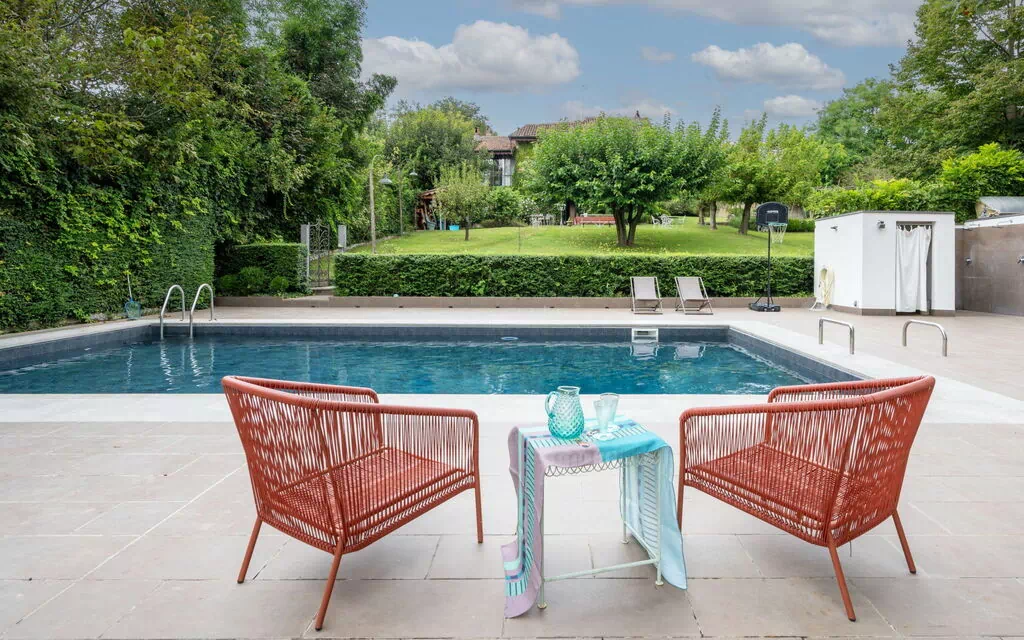 Moncalieri 12 km van Torino: Mooi cottage "dei Ciliegi", omgeven door velden. Boven Moncalieri, 12 km van het centrum van Torino, 2.5 km van het centrum van Moncalieri, tegen een helling, villa wijk. Voor alleengebruik: terrein 4.000 m2 (omheind), verzorgde tuin met gazon en bloemen, boomgaard, ligweide, openluchtzwembad (10 x 5 m, 100 - 300 cm diepte, seizoensgebonden beschikbaarheid: 15.Mei. - 15.Okt.). Buitendouche, poolhouse met koelkast en fornuis, patio, prieel, terras, tuinmeubelen, barbecue, kinderspeelplaats (schommel). 400 m lange rommelige, smalle toegangsweg. Parkeerplaats (voor 3 auto's) op het terrein. Winkel 2 km, supermarkt 3.5 km, bushalte 5 km, treinstation "Turin Porta Nuova" 12 km. Auto noodzakelijk. Geschikt voor families. De omgeving is gevoelig voor geluidsoverlast. Gelieve geen lawaai te maken en de rust te bewaren.