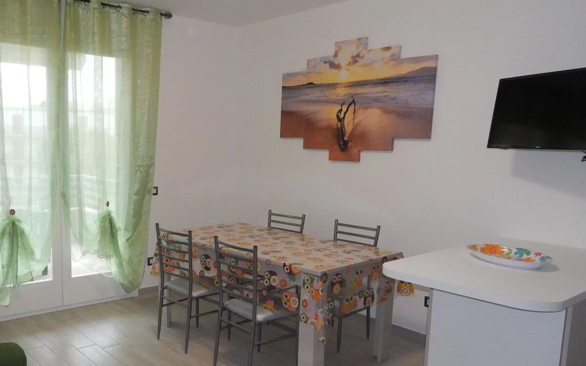 Woon-/eetkamer met regionale televisie en eettafel. Roken niet toegelaten. 1 2-pers divanbed.
