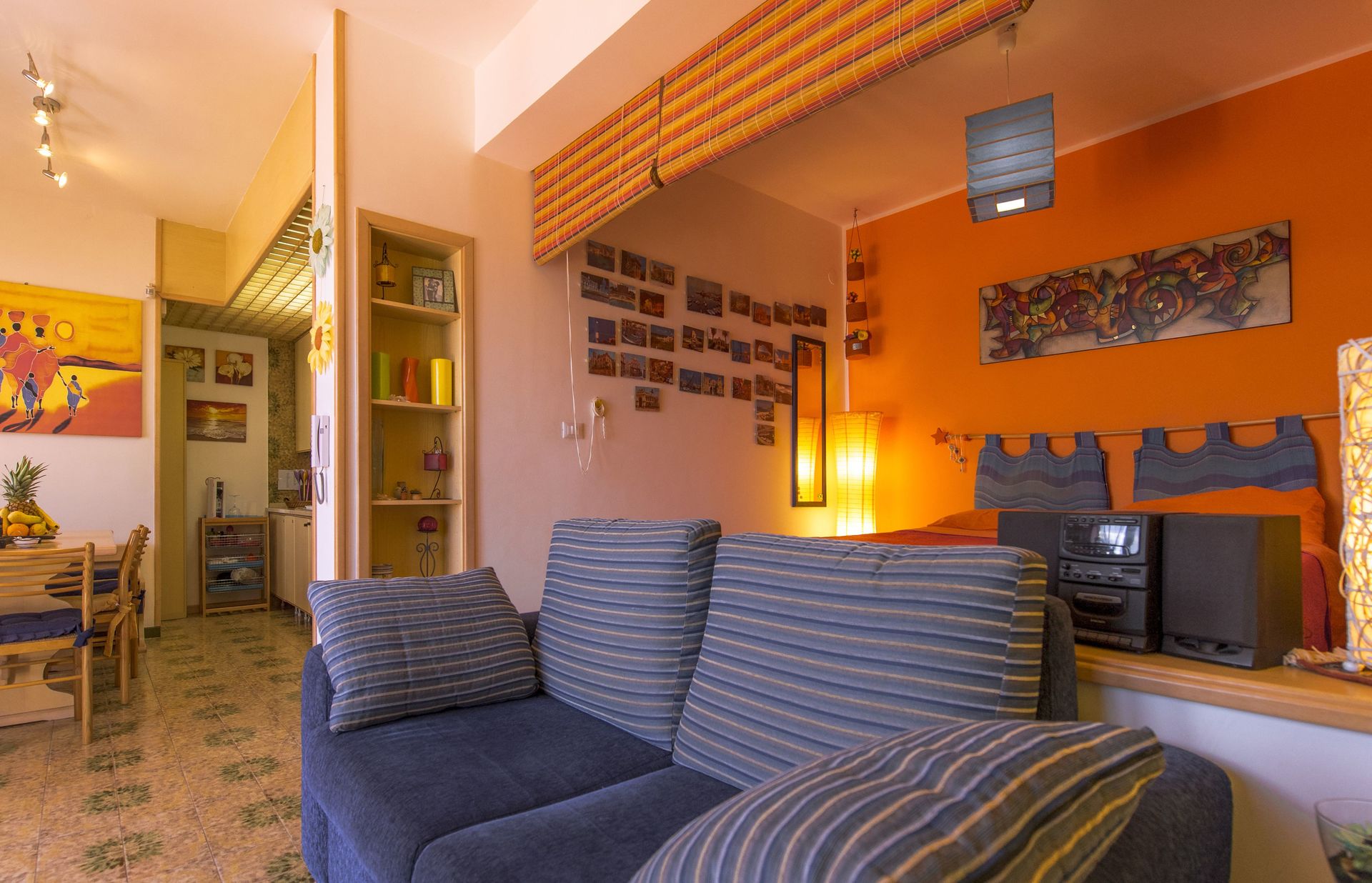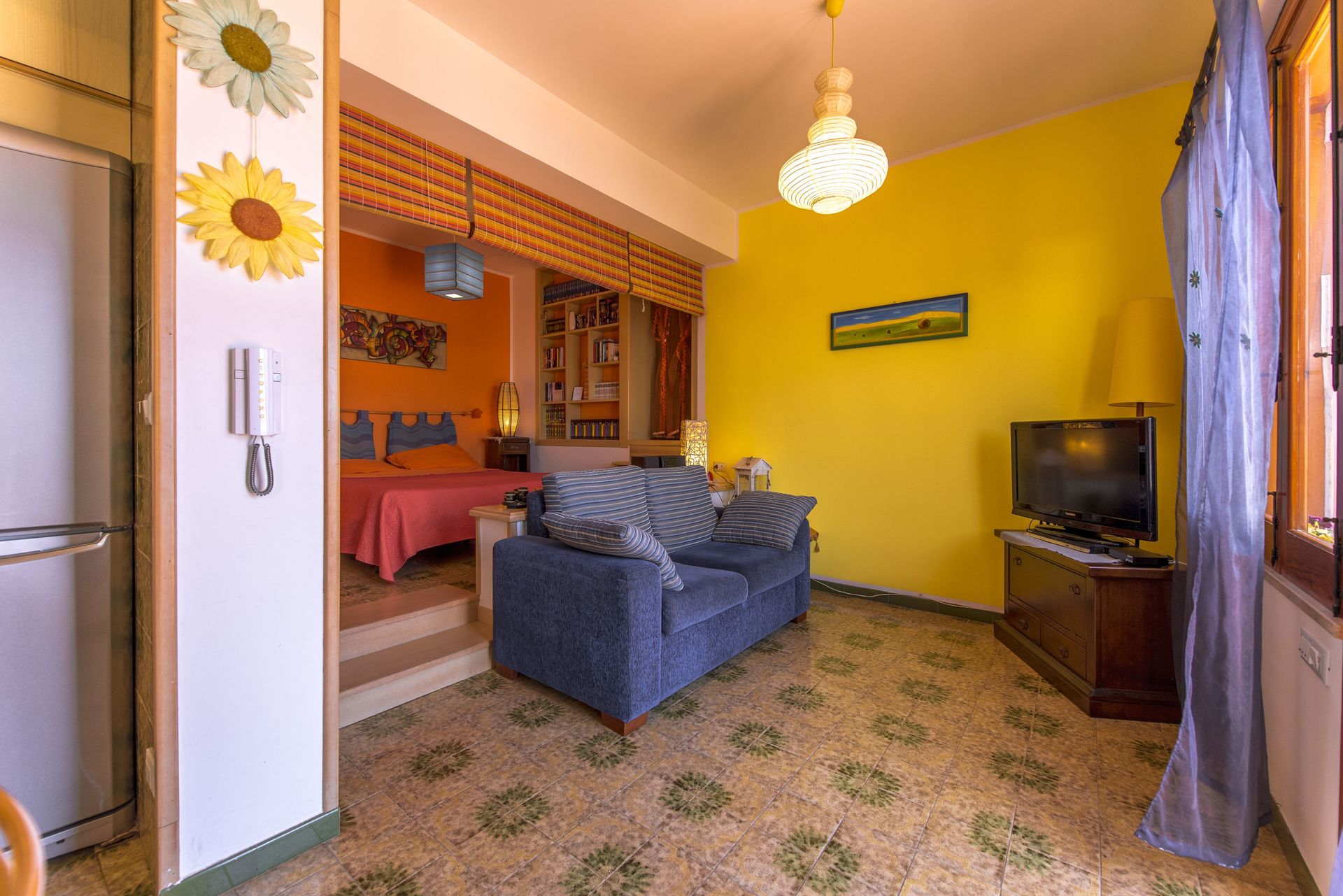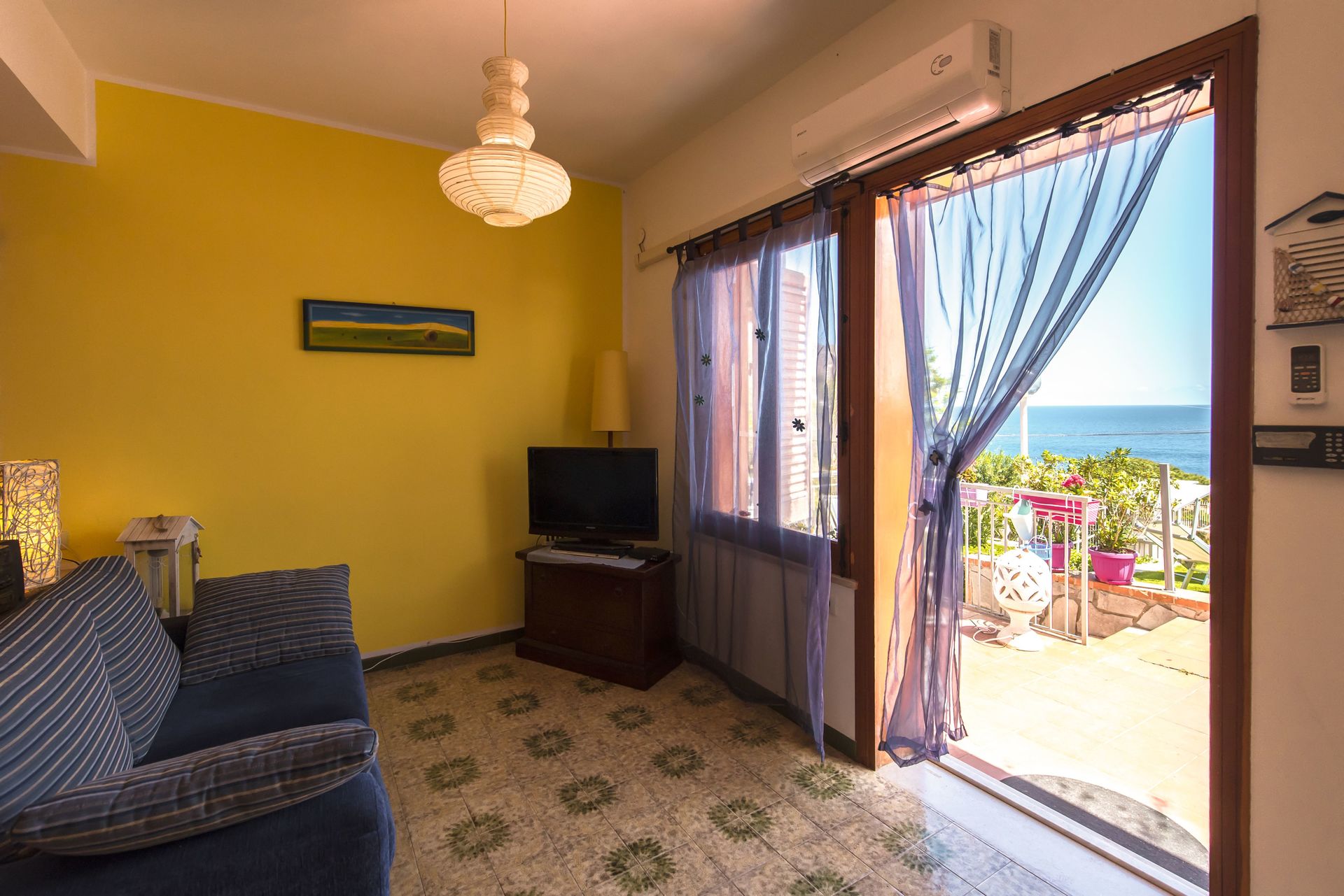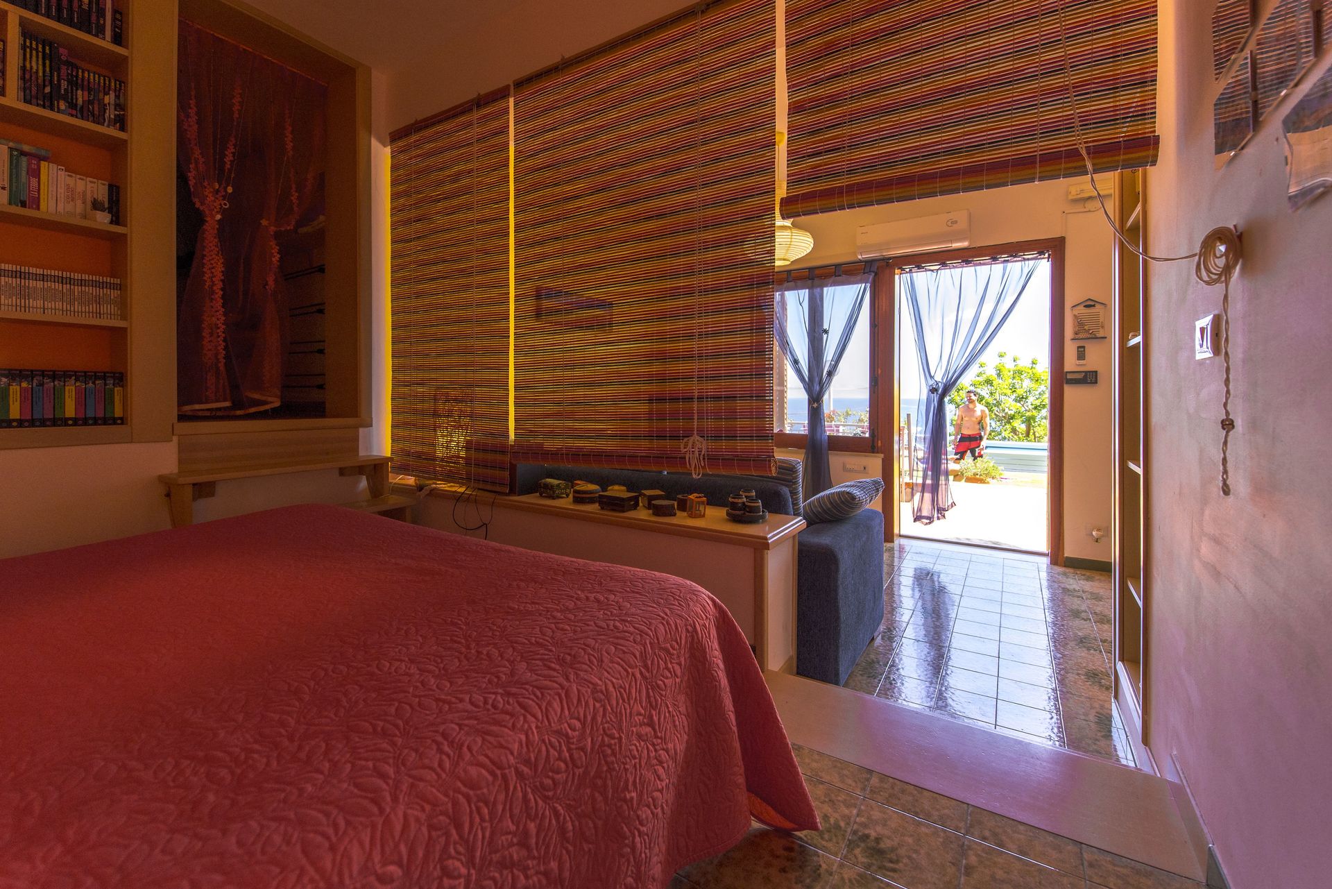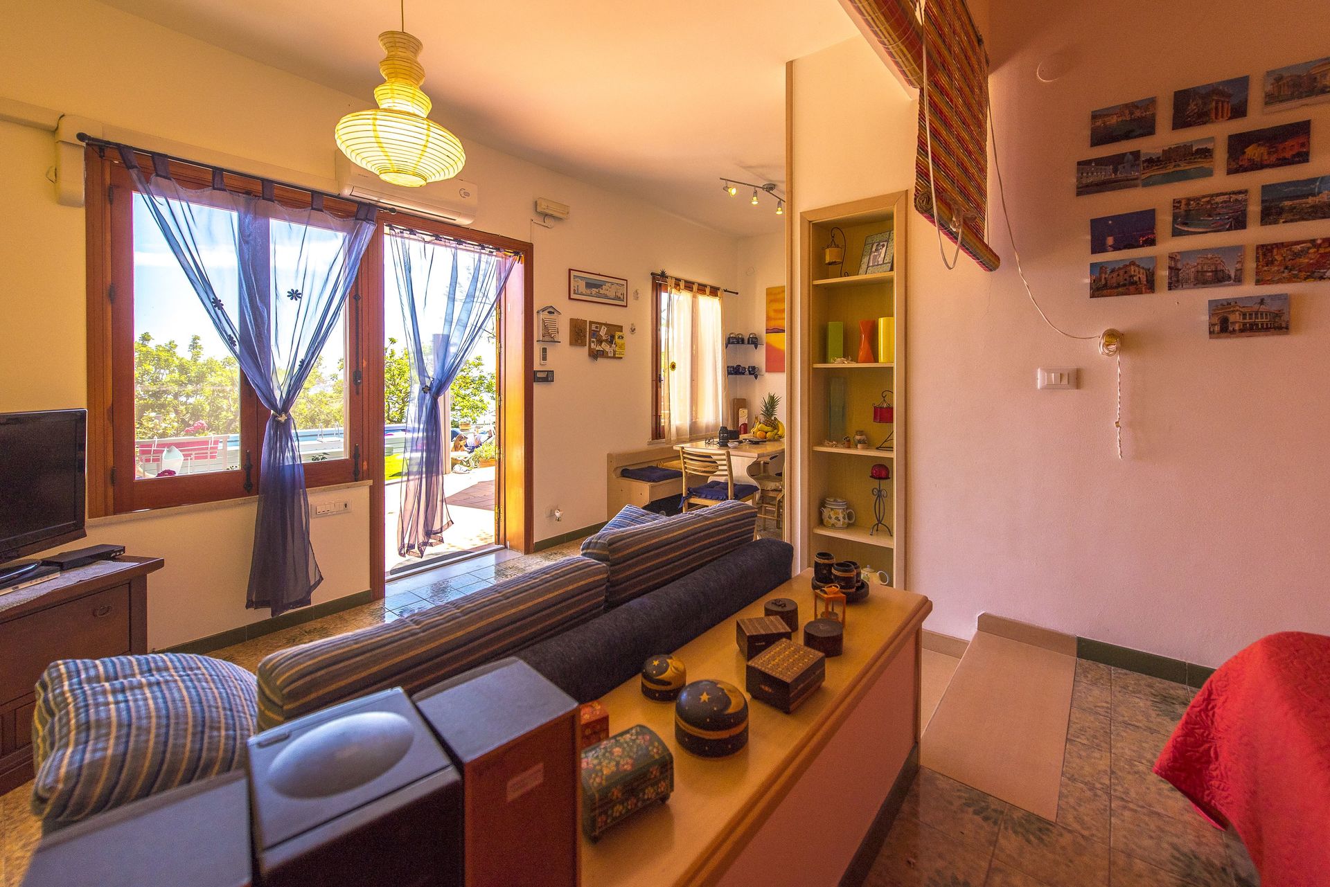 Open ruimte (50 m2): eettafel (personen: 4), tweepersoonsbed (breedte: 190m, lengte: 160m), slaapbank (breedte: 90m, lengte: 120m), WIFI internet, airconditioning, satelliet tv, ijskast, kookplaat, diepvriezer, strijkijzer, oven, italiaans koffiezetapparaat, uitgang naar de tuin.