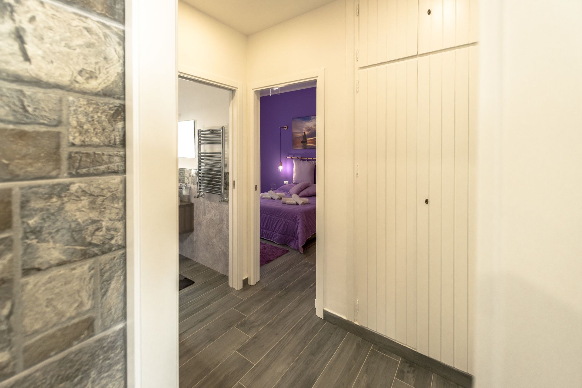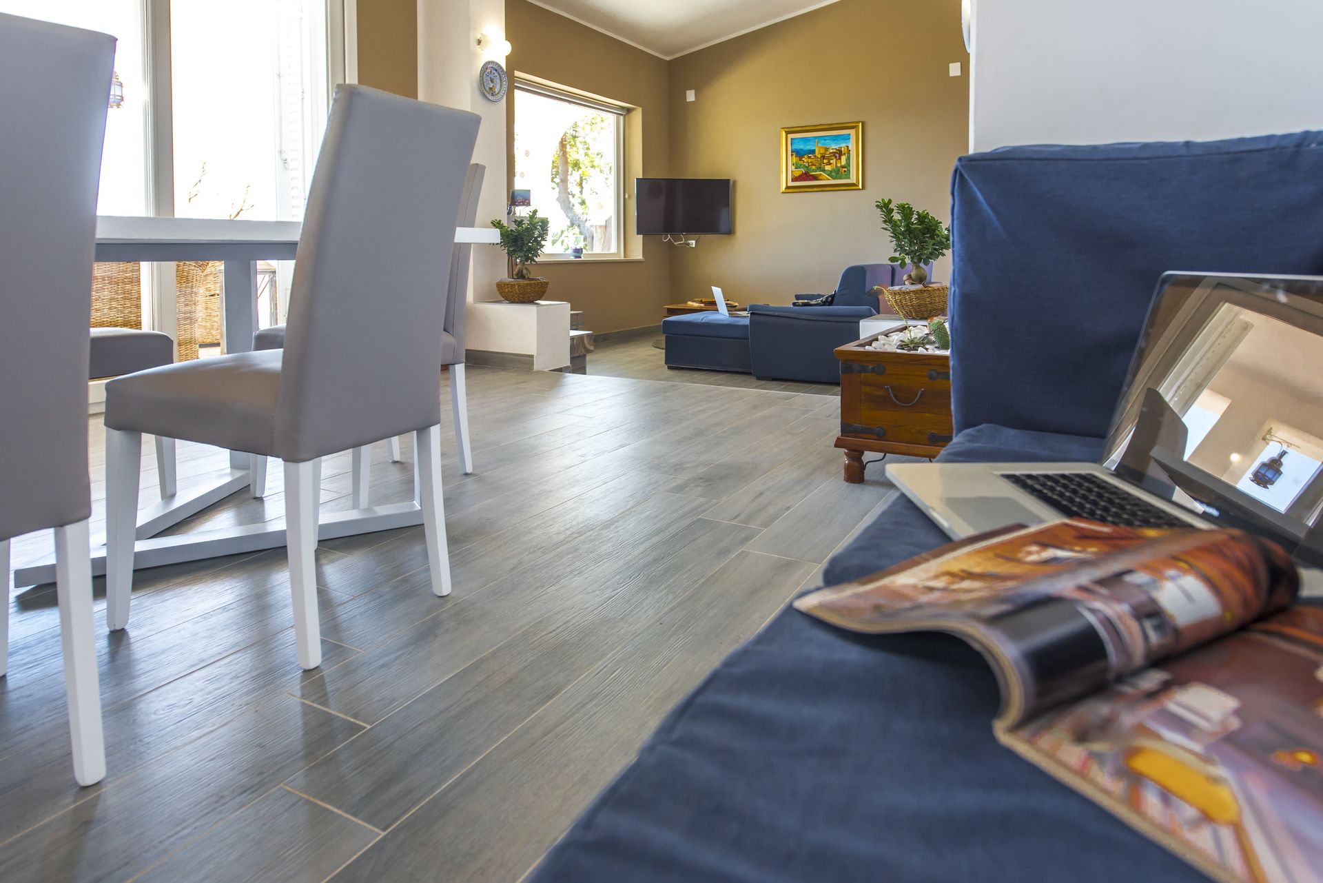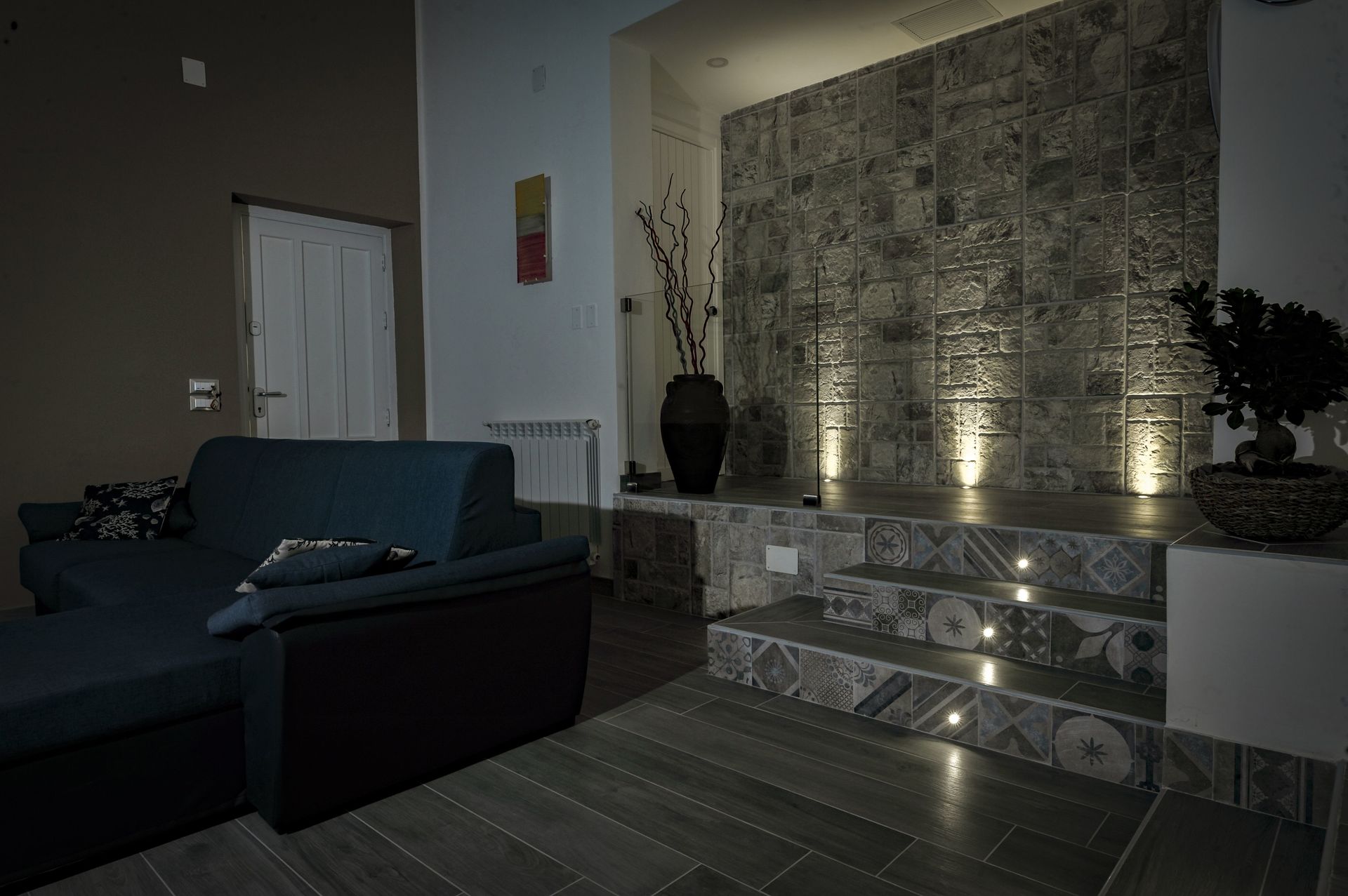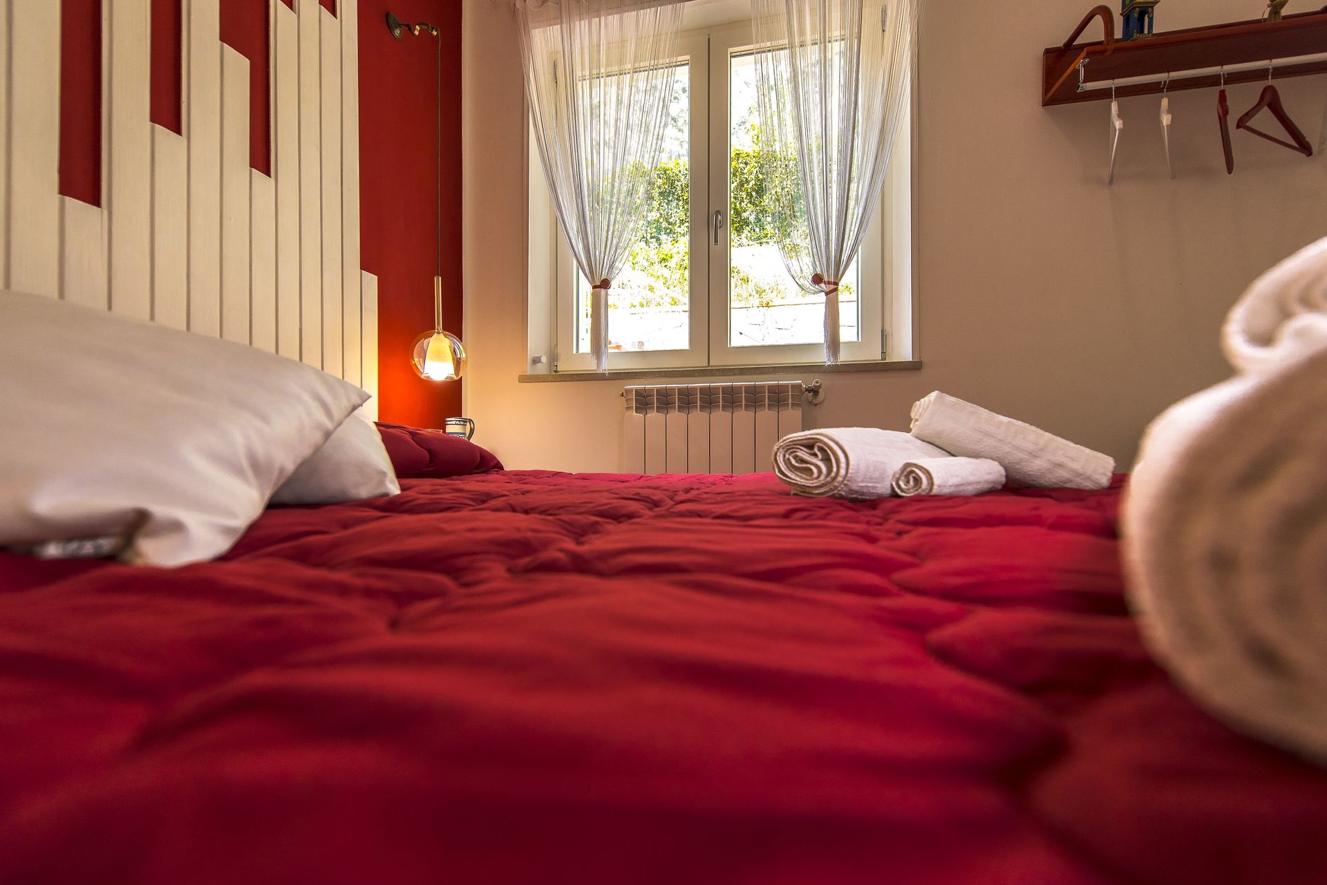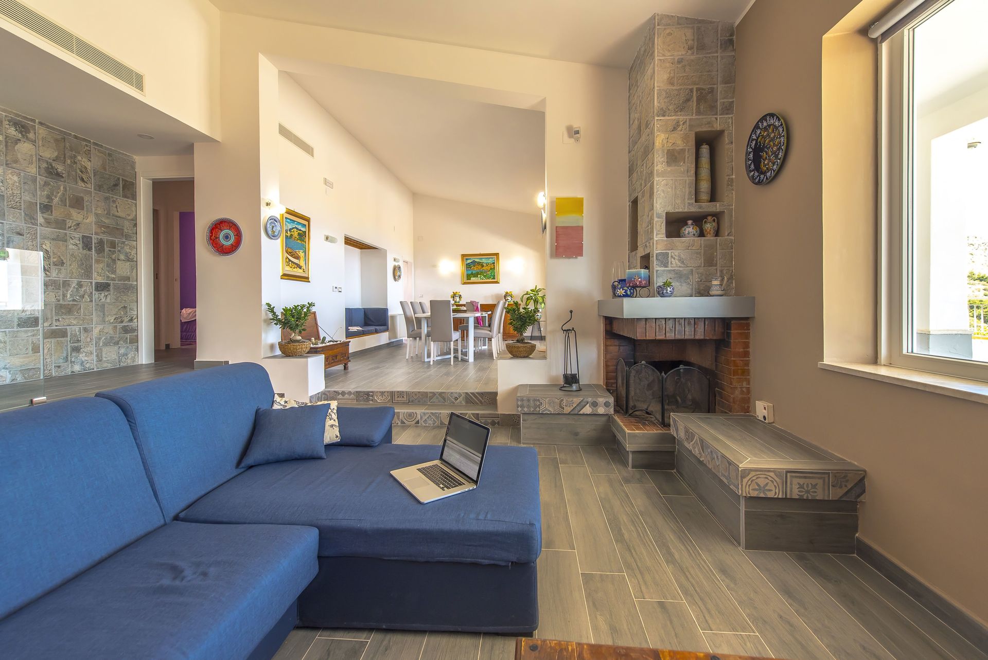 Open ruimte (50 m2): eettafel (personen: 4), tweepersoonsbed (breedte: 190m, lengte: 160m), slaapbank (breedte: 90m, lengte: 120m), WIFI internet, airconditioning, satelliet tv, ijskast, kookplaat, diepvriezer, strijkijzer, oven, italiaans koffiezetapparaat, uitgang naar de tuin.