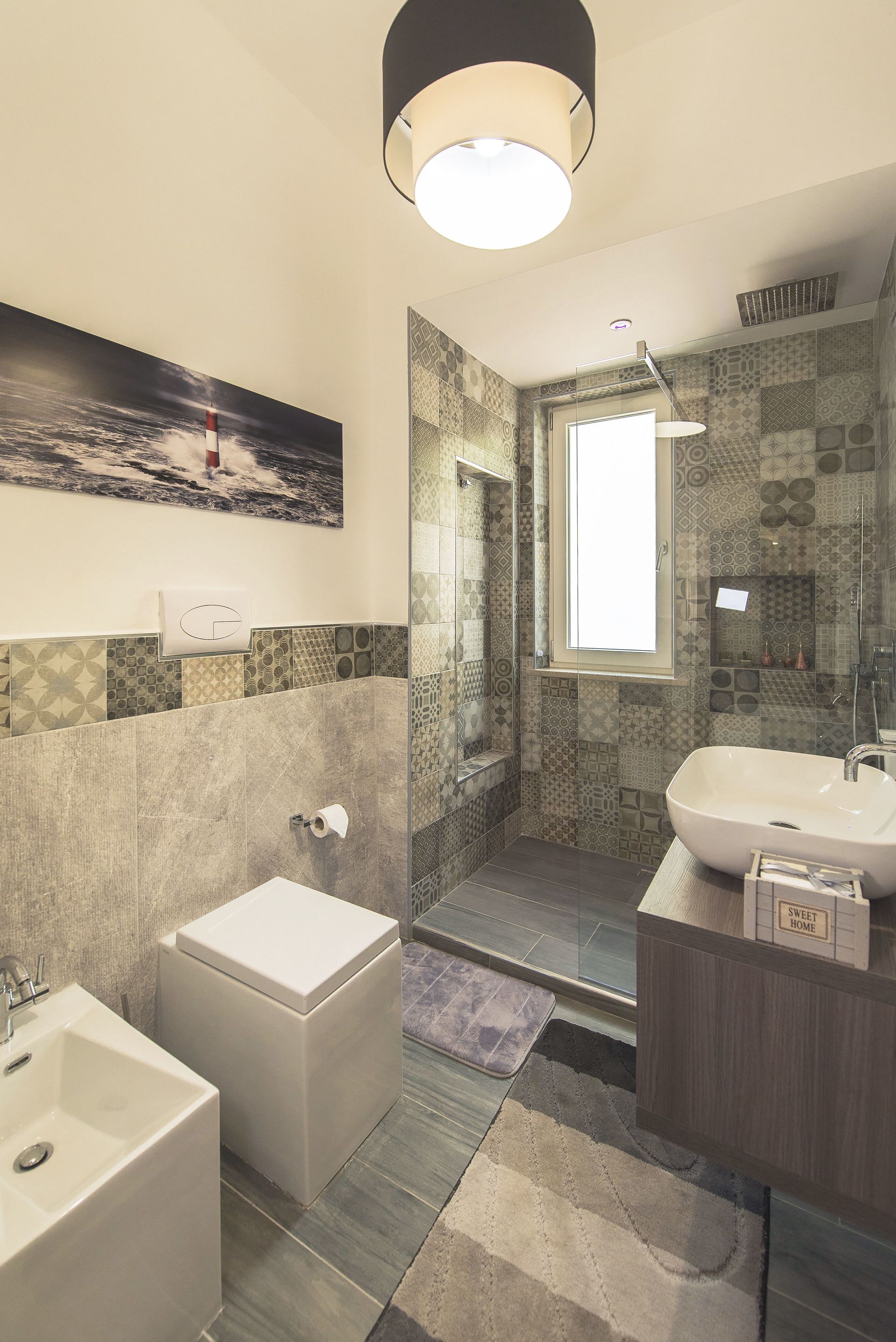 Badkamer: wastafel, toilet , bidet, douche.