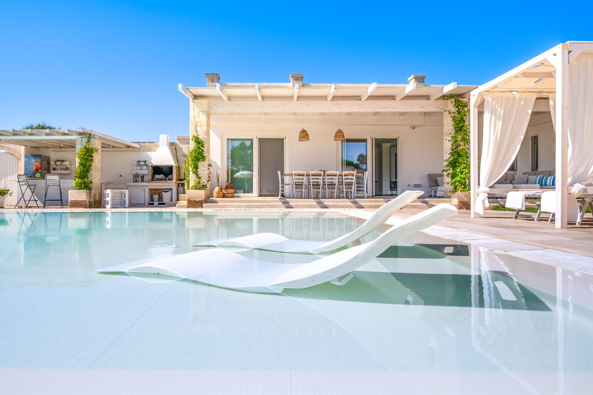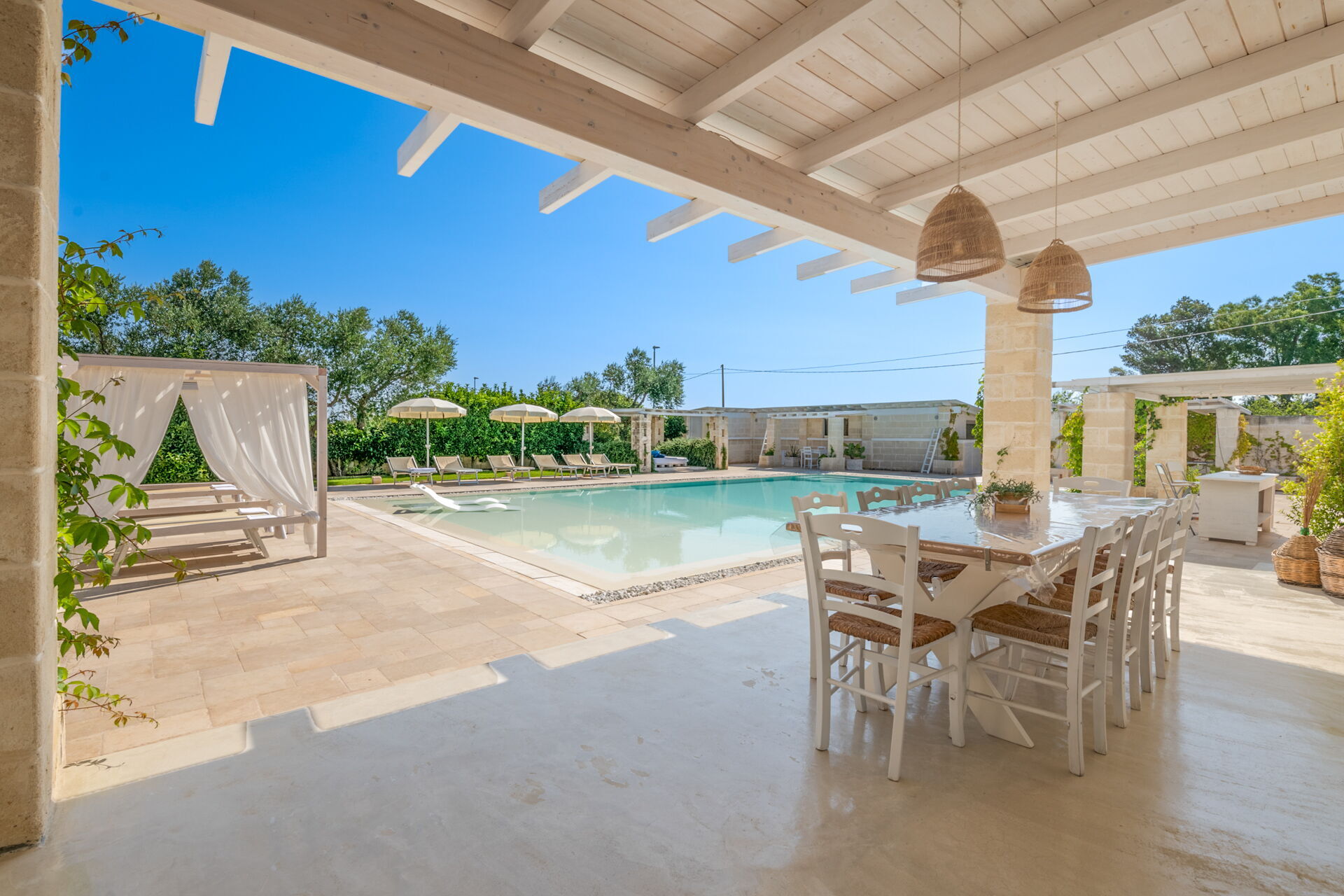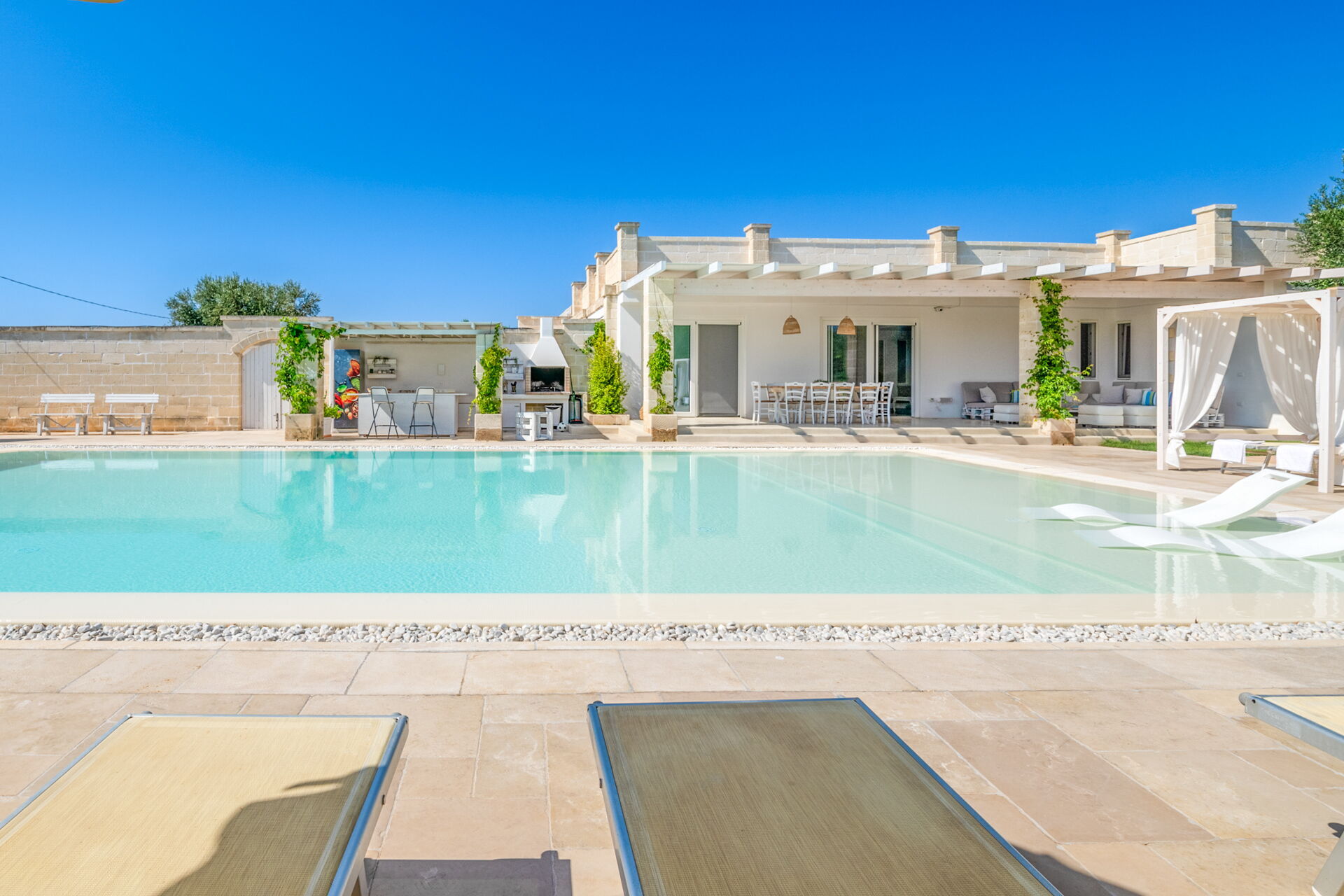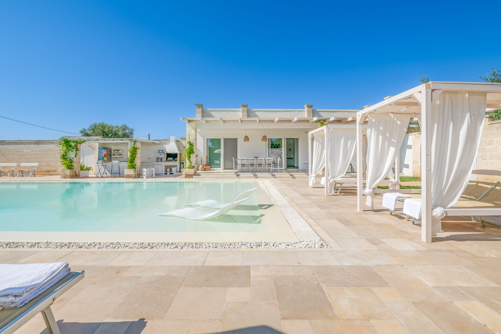 Een paar minuten van de steden Carovigno en Ostuni, ligt Villa Niraclò: villa te huur met zwembad voor strandvakanties. Het bestaat uit 4 slaapkamers met airconditioning, gratis wi-fi, een eigen parkeerplaats en een keuken om de vakantie in alle vrijheid en onafhankelijkheid door te brengen. Perfect voor maximaal acht personen in vier comfortabele kamers met onderling verbonden badkamers.