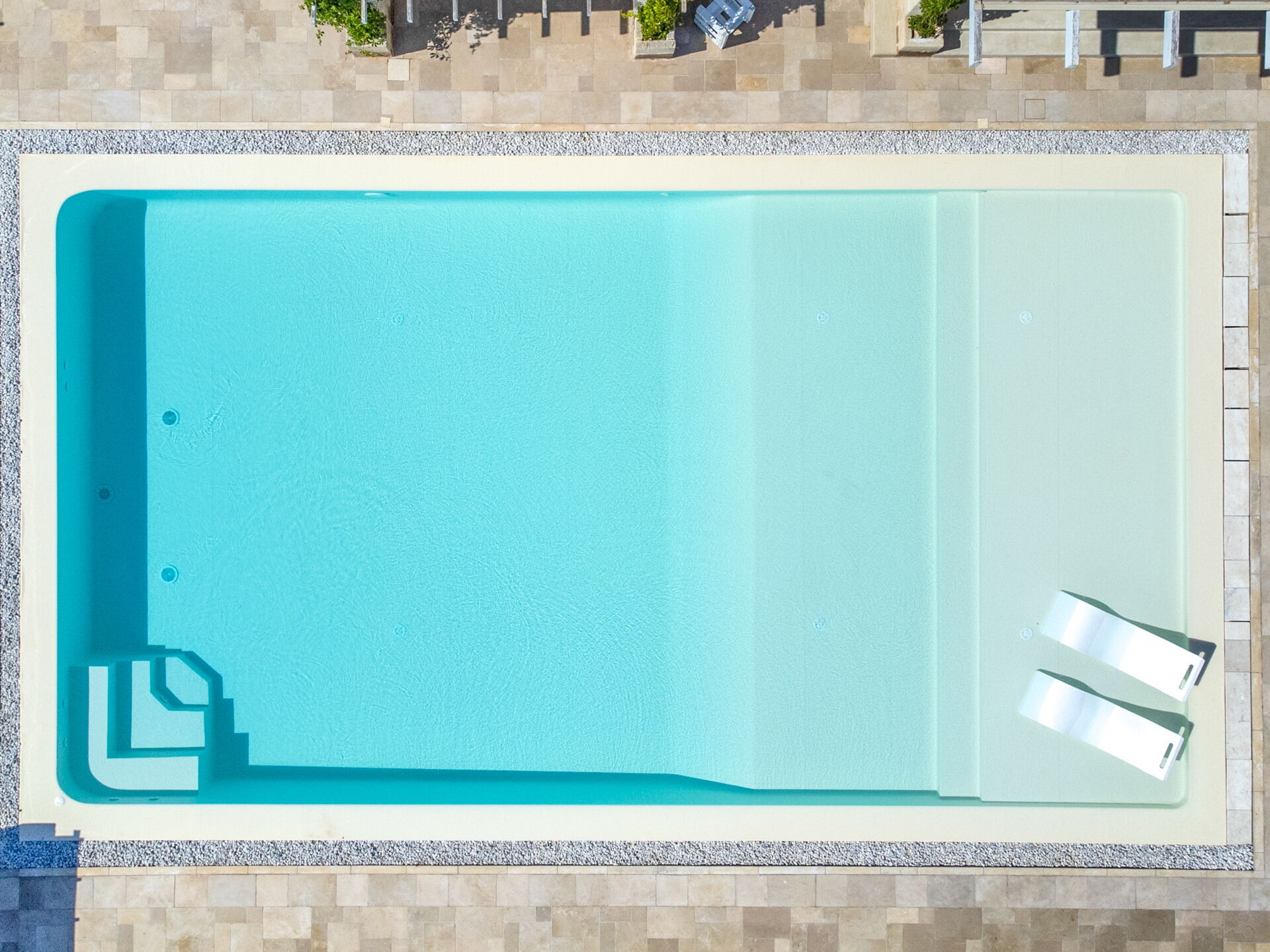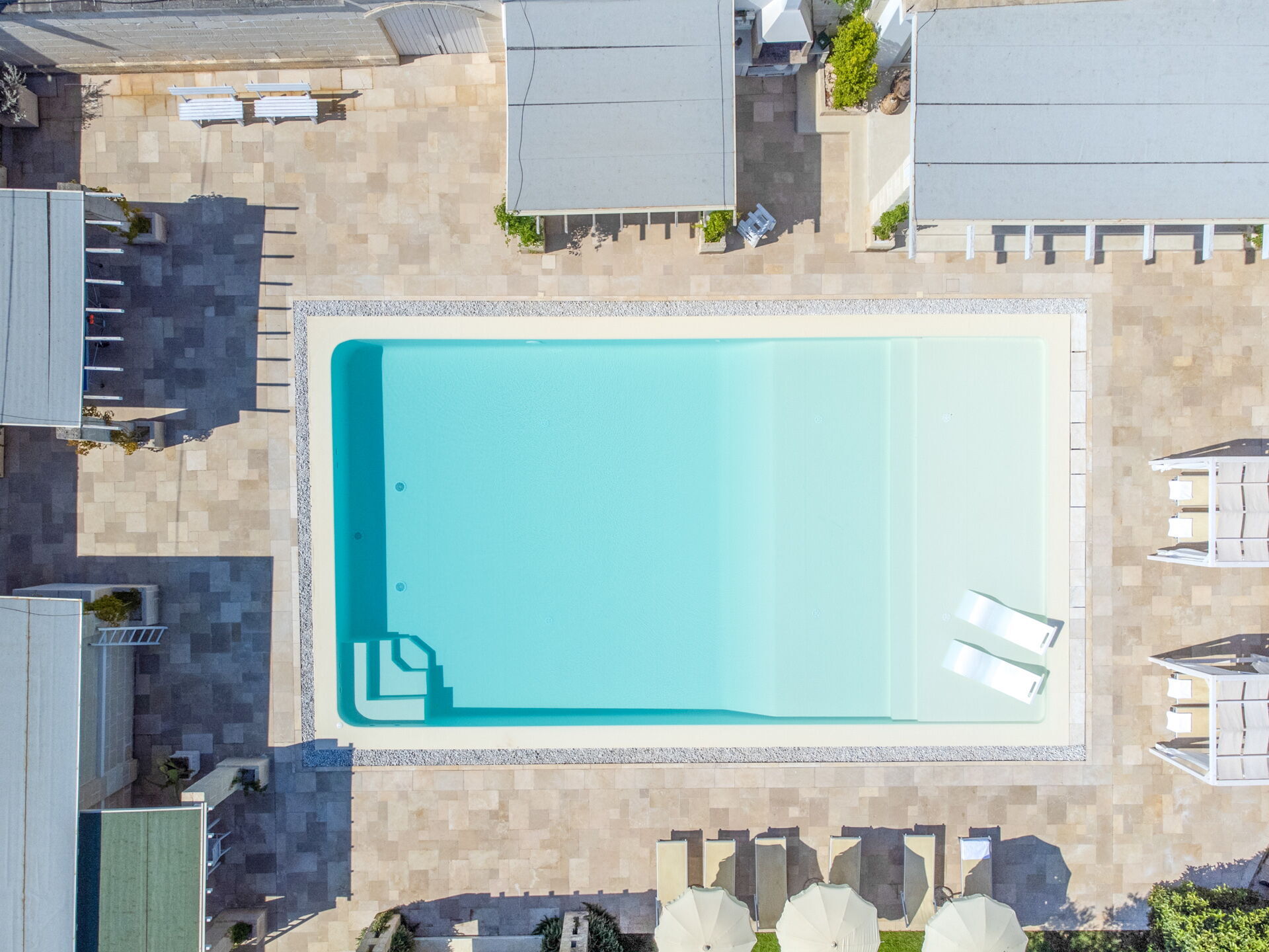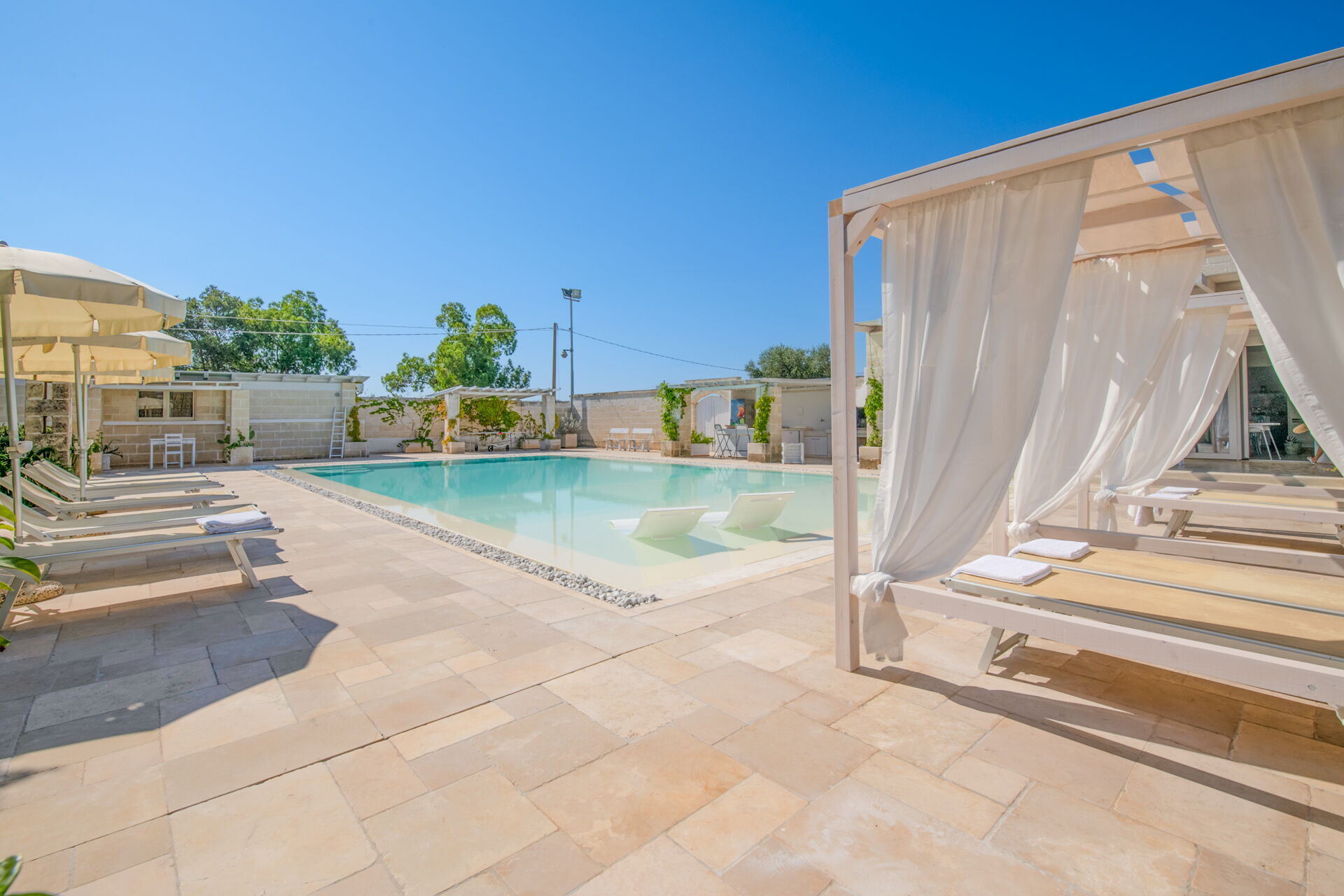 Rondom het zwembad staan voldoende ligbedden voor de gehele gasten, tevens is er een dubbele ligstoel met schaduwdek.
