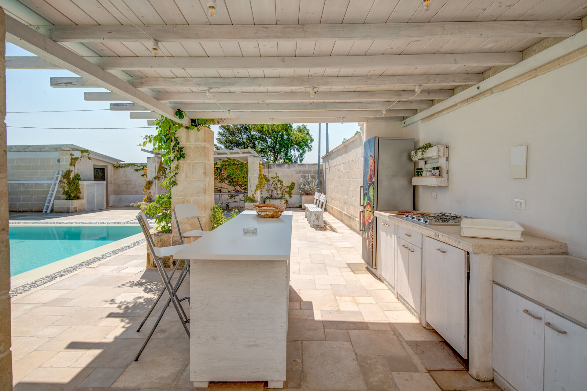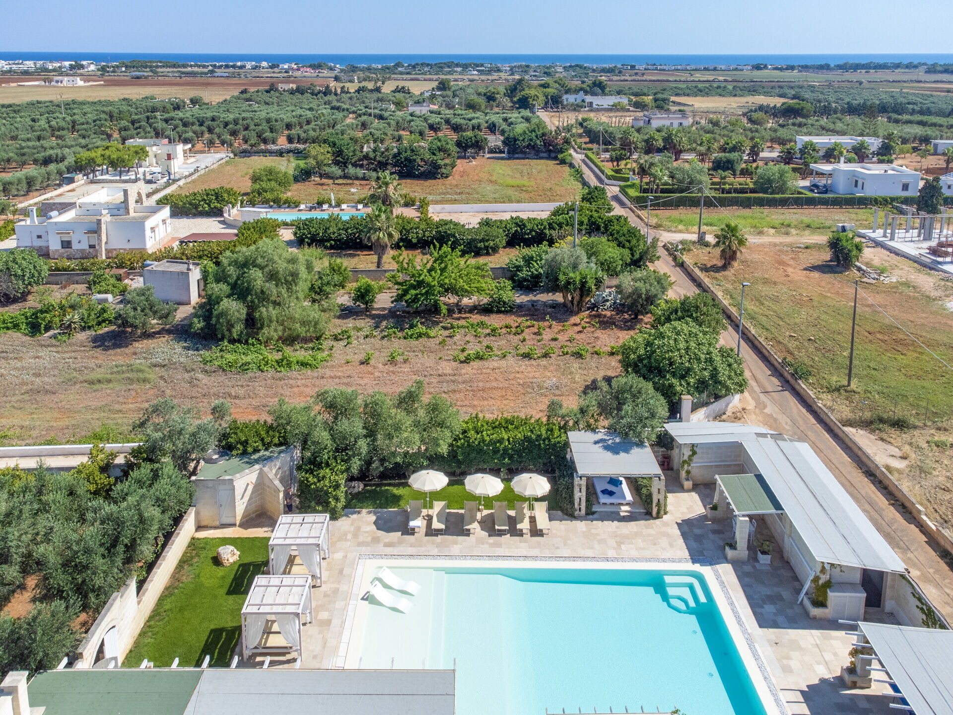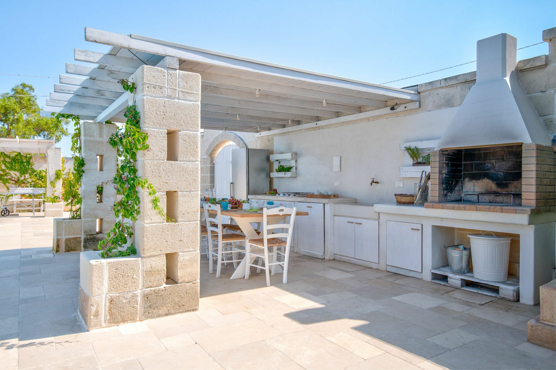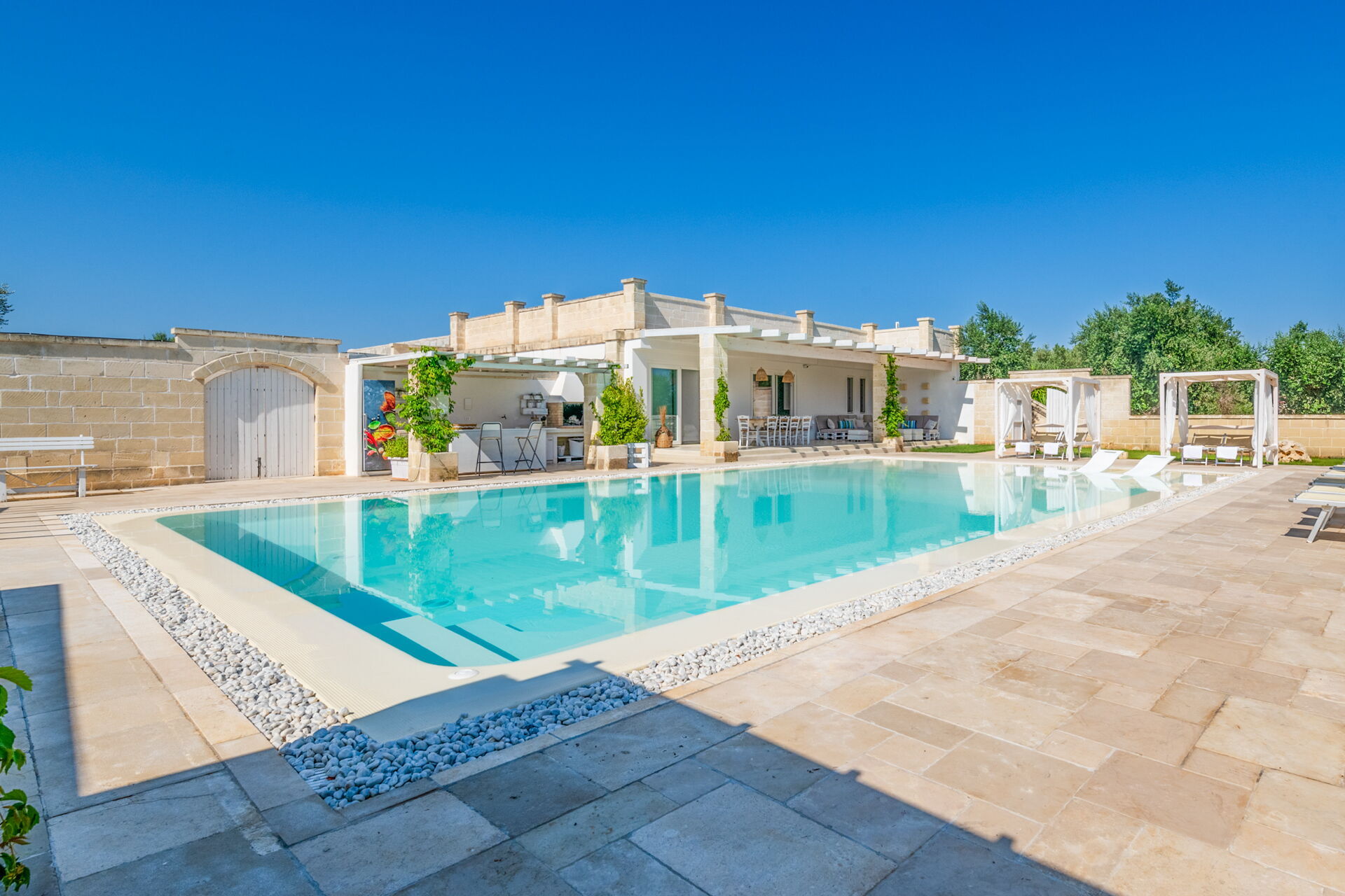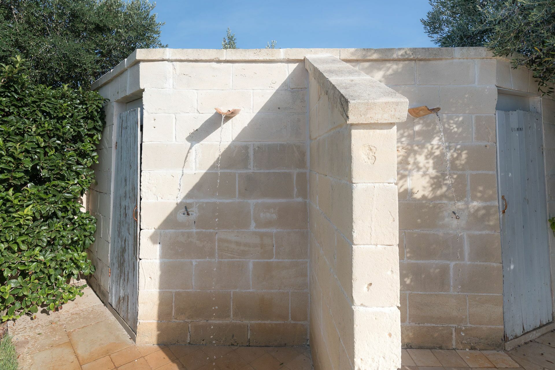 De tuin, volledig omheind met zichtbaar metselwerk, is omgeven door een hoge heg die privacy en rust biedt. De bestrating van de binnenplaats is in lokale steen en aan de randen is er een gazon met buitenbadkamers en douches.