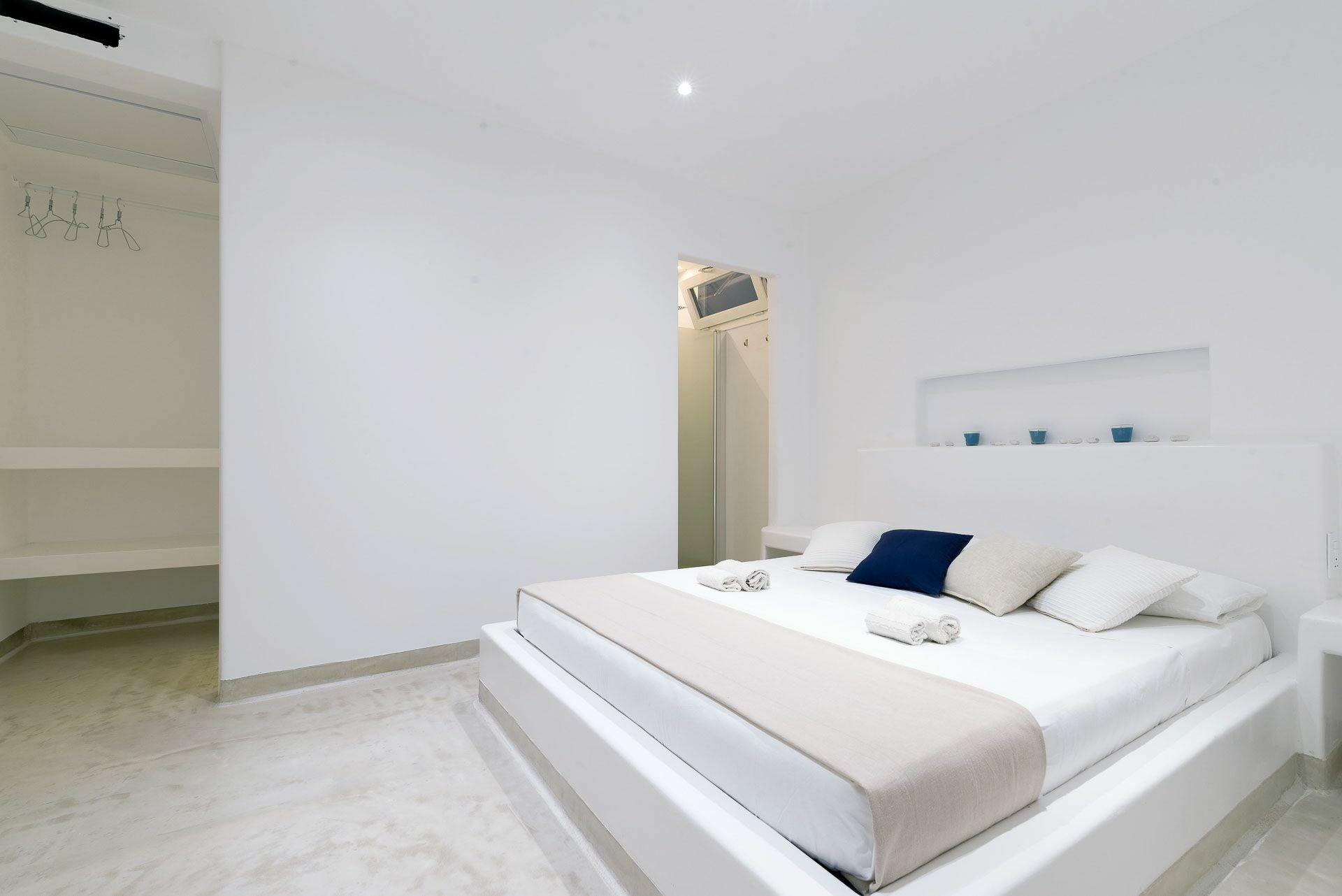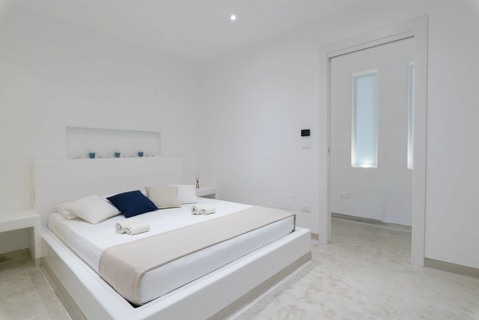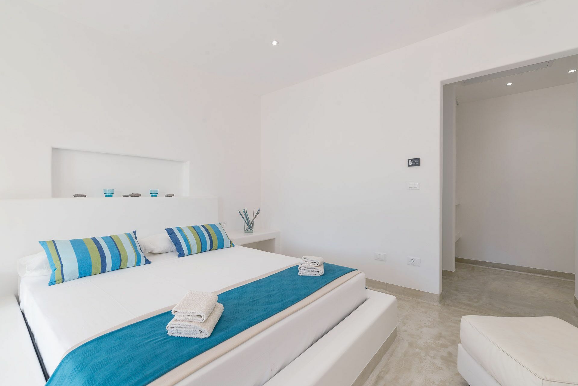 De Ni Suite, de eerste links van de woonkamer, heeft een bed en een gemetseld hoofdeinde met een tweepersoonsmatras, voorzien van vier kussens, lakens en handdoeken met een verborgen kleerkast in de muur. Aan de zijkanten van het bed bevinden zich de twee ingebouwde nachtkastjes en de nis rust daarboven objecten. Verbonden met de slaapkamer is de badkamer compleet met douche, toilet, enkele wastafel en bidet met raam naar buiten. Beheers de witte kalk van de muren en het blauw van de zee.