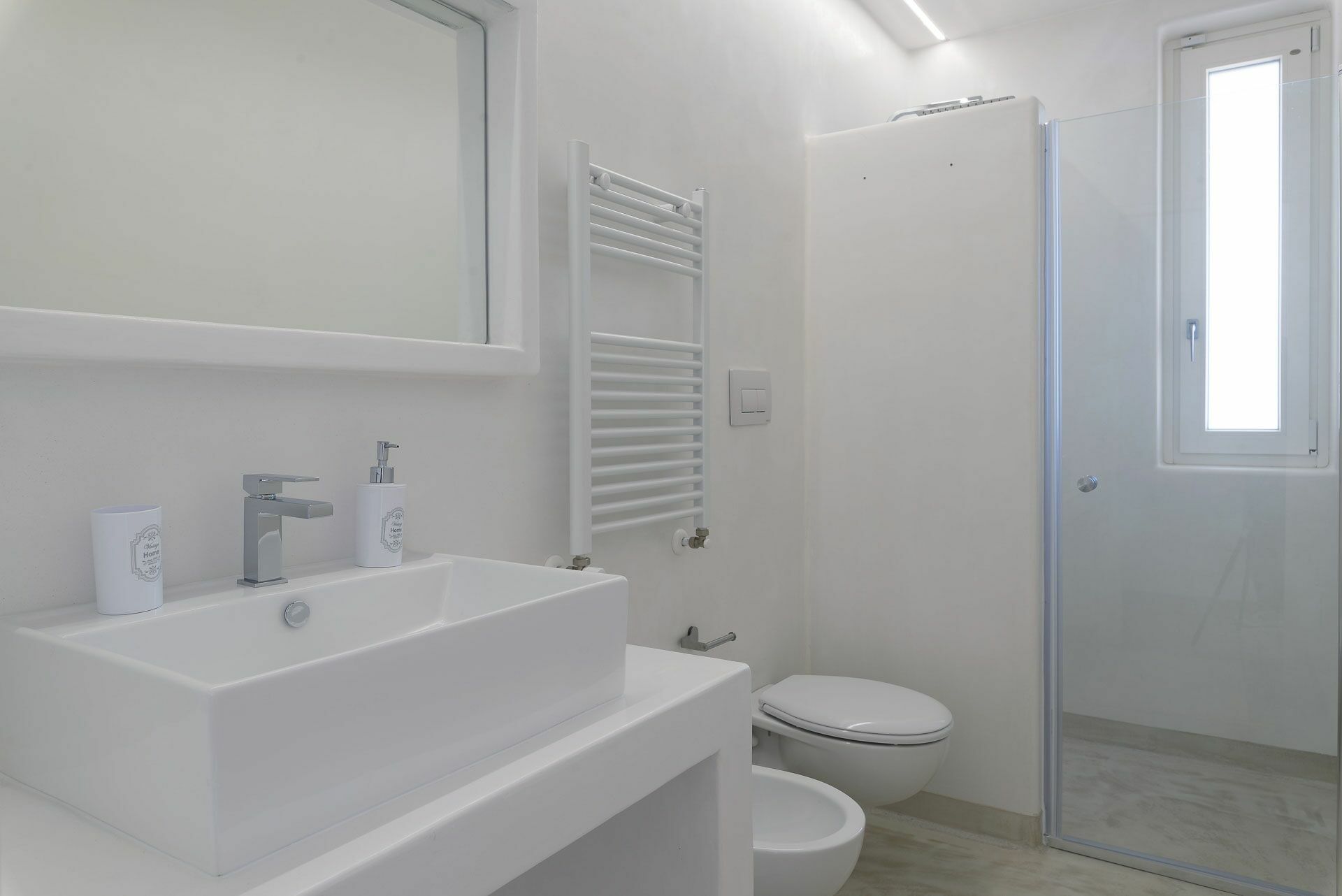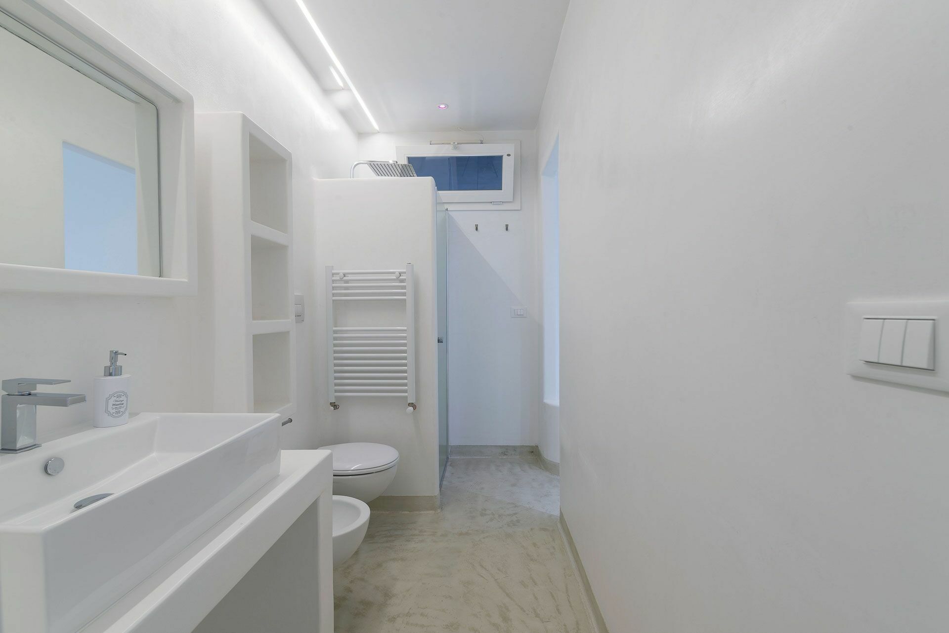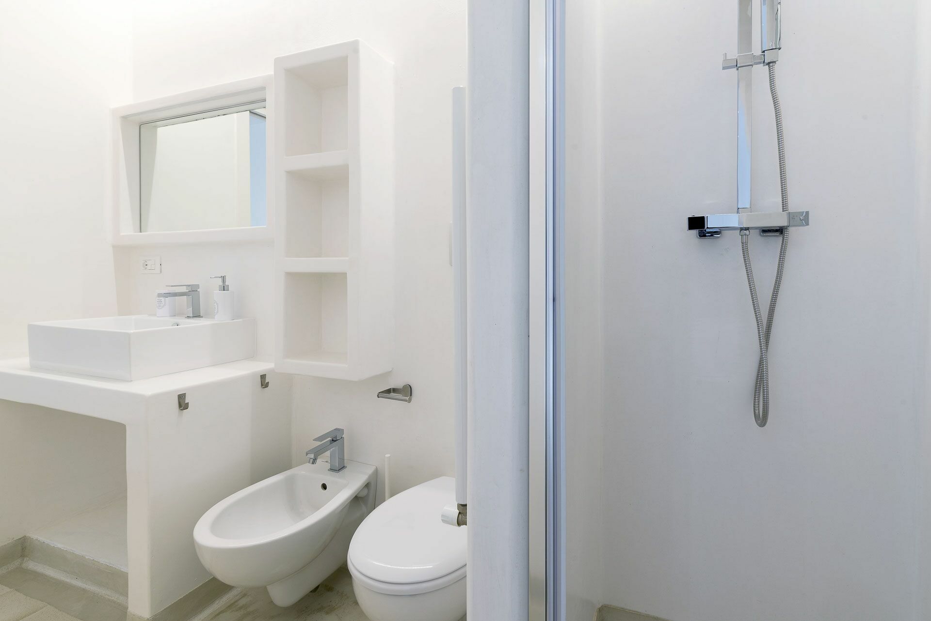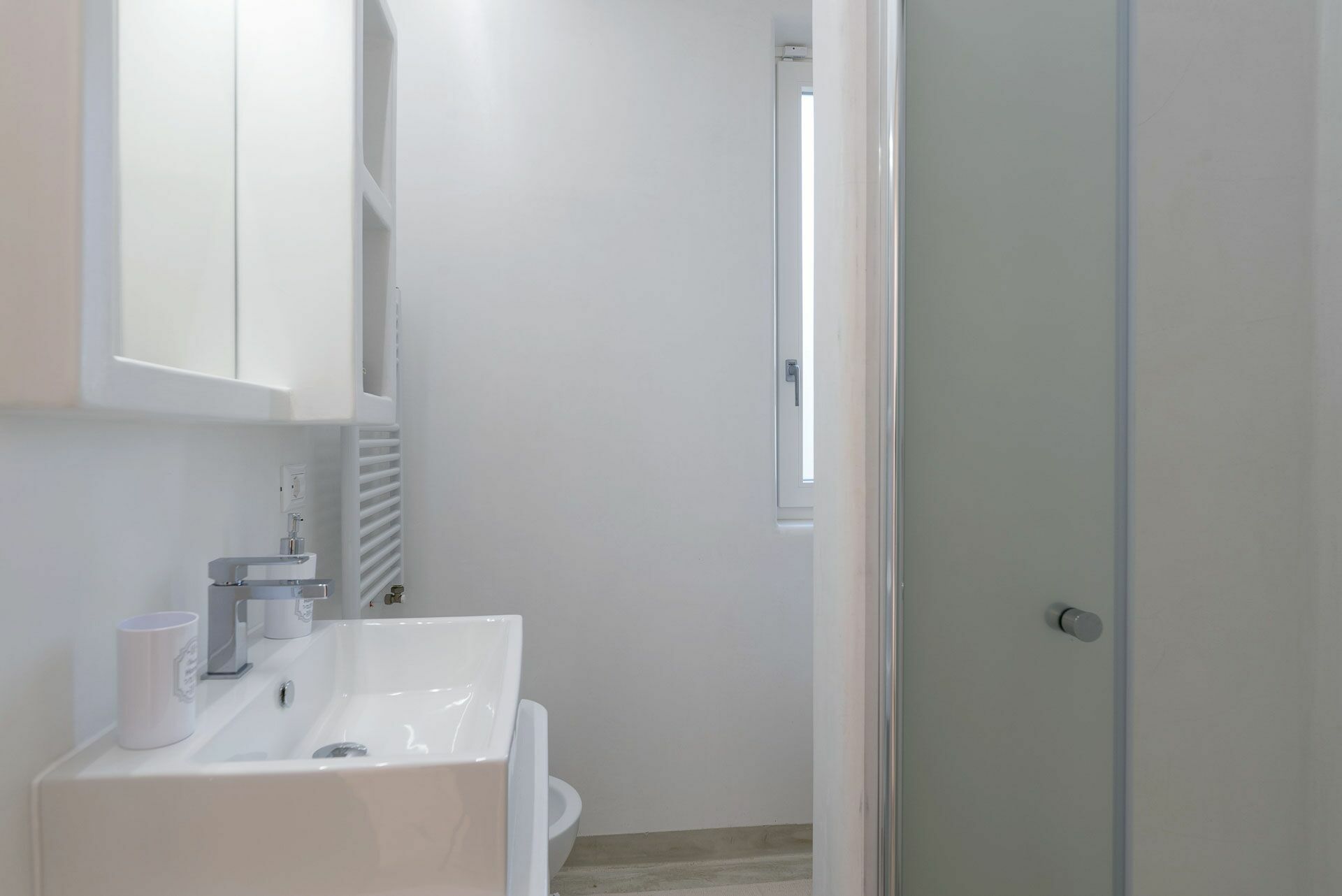 De Ni Suite, de eerste links van de woonkamer, heeft een bed en een gemetseld hoofdeinde met een tweepersoonsmatras, voorzien van vier kussens, lakens en handdoeken met een verborgen kleerkast in de muur. Aan de zijkanten van het bed bevinden zich de twee ingebouwde nachtkastjes en de nis rust daarboven objecten. Verbonden met de slaapkamer is de badkamer compleet met douche, toilet, enkele wastafel en bidet met raam naar buiten. Beheers de witte kalk van de muren en het blauw van de zee.