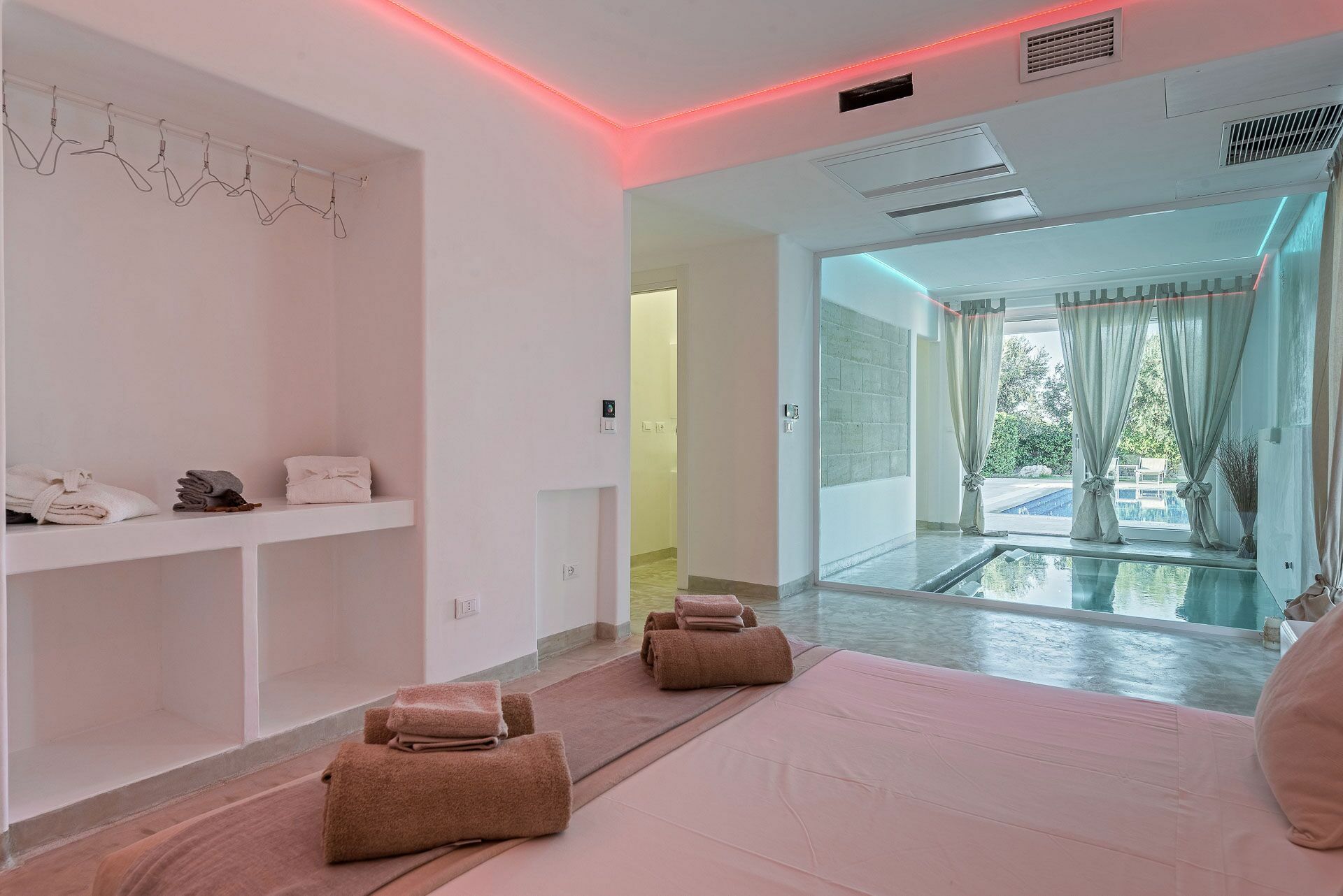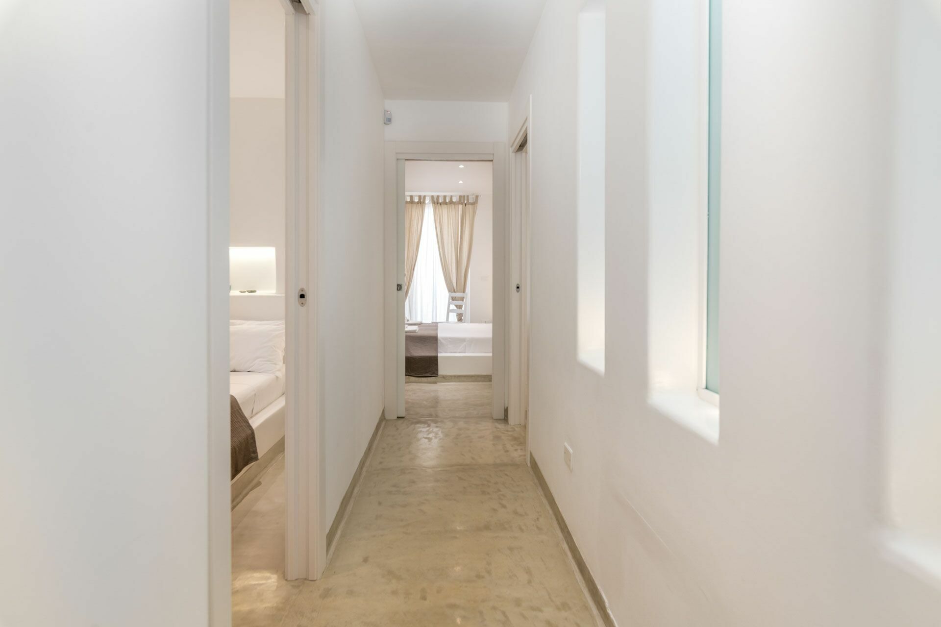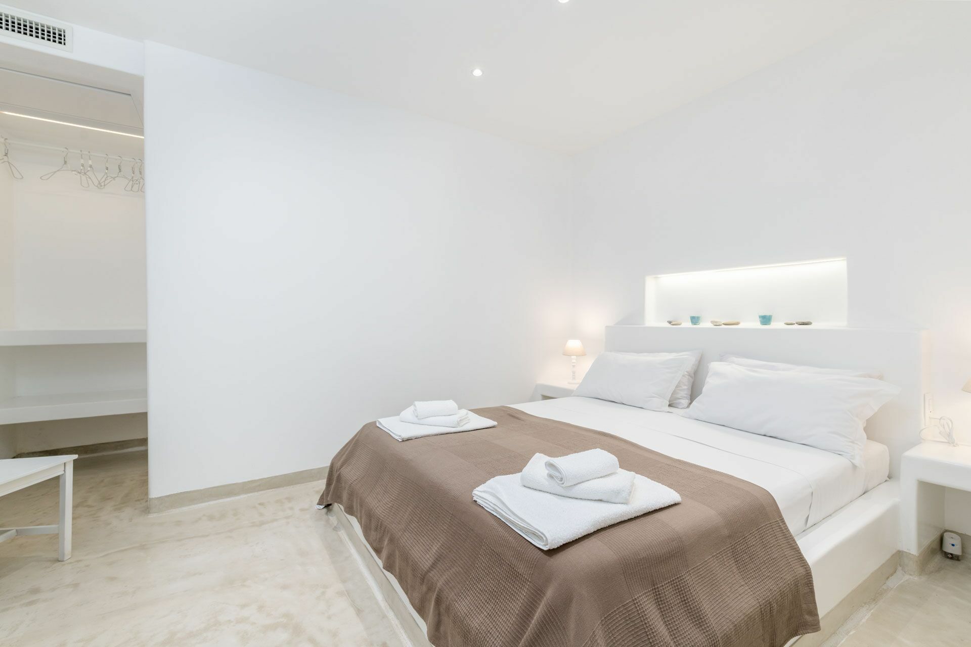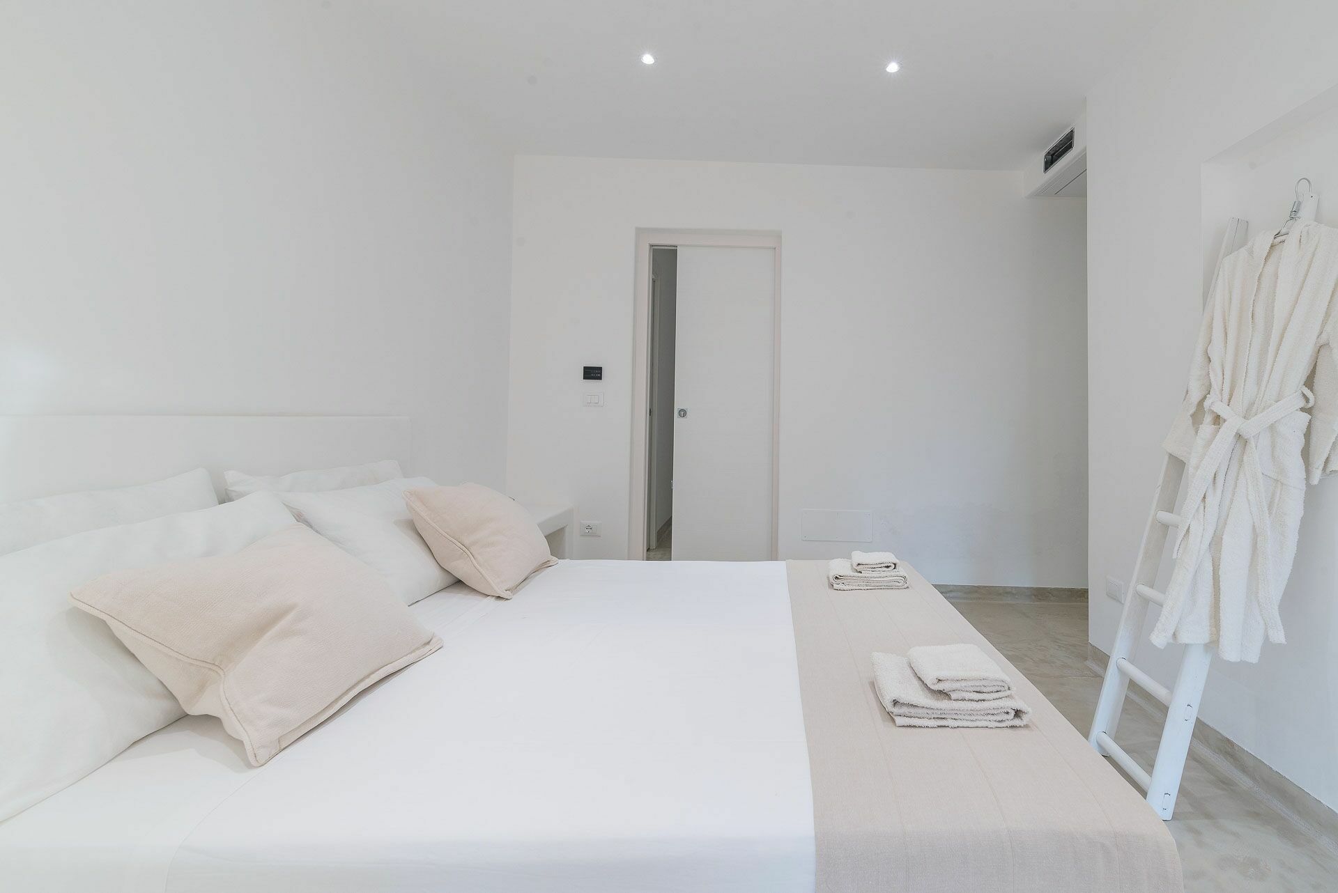 Het slaapgedeelte is opgedeeld in twee delen, vanuit de woonkamer bereikt u zowel de Master Suite Clò links als rechts de overige drie Suite kamers: Suite Ni, Suite Ra en Suite Mi. Alle kamers zijn uitgerust met led-verlichting en airconditioning via kanalen.