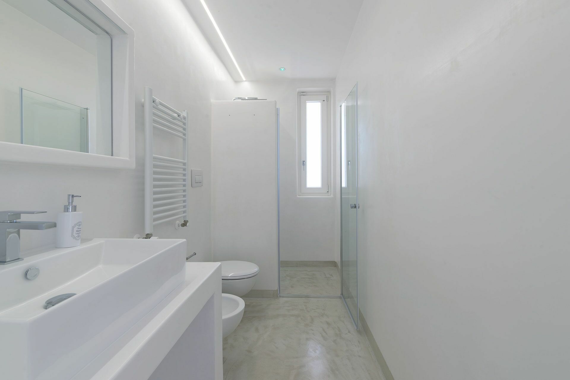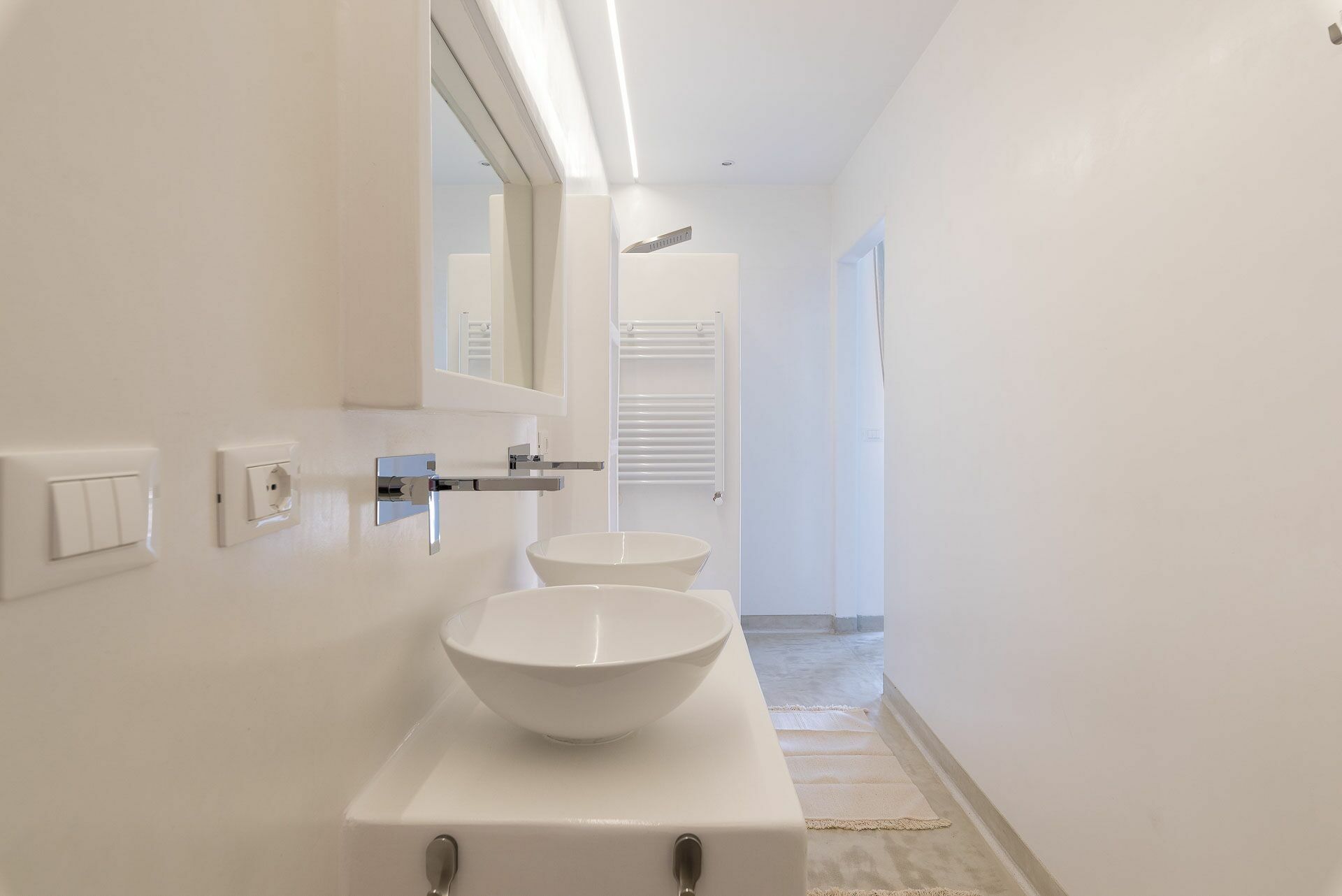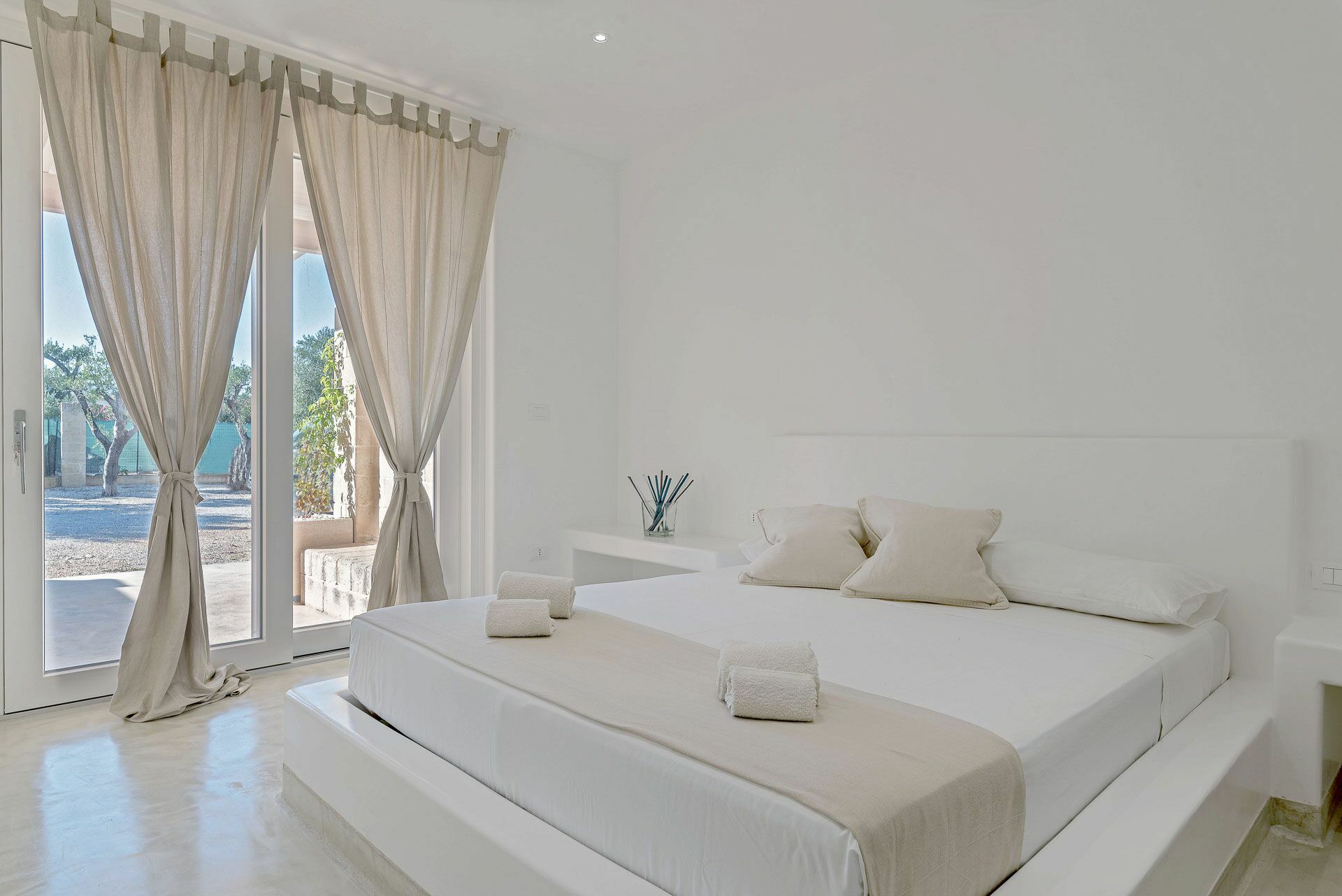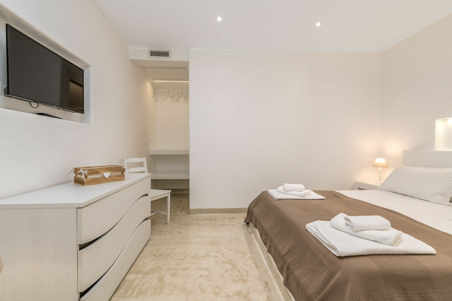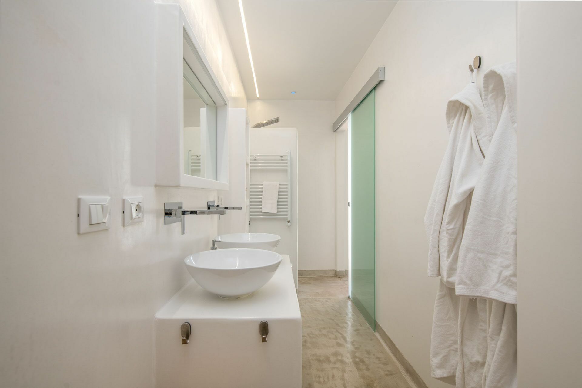 Het slaapgedeelte is opgedeeld in twee delen, vanuit de woonkamer bereikt u zowel de Master Suite Clò links als rechts de overige drie Suite kamers: Suite Ni, Suite Ra en Suite Mi. Alle kamers zijn uitgerust met led-verlichting en airconditioning via kanalen.