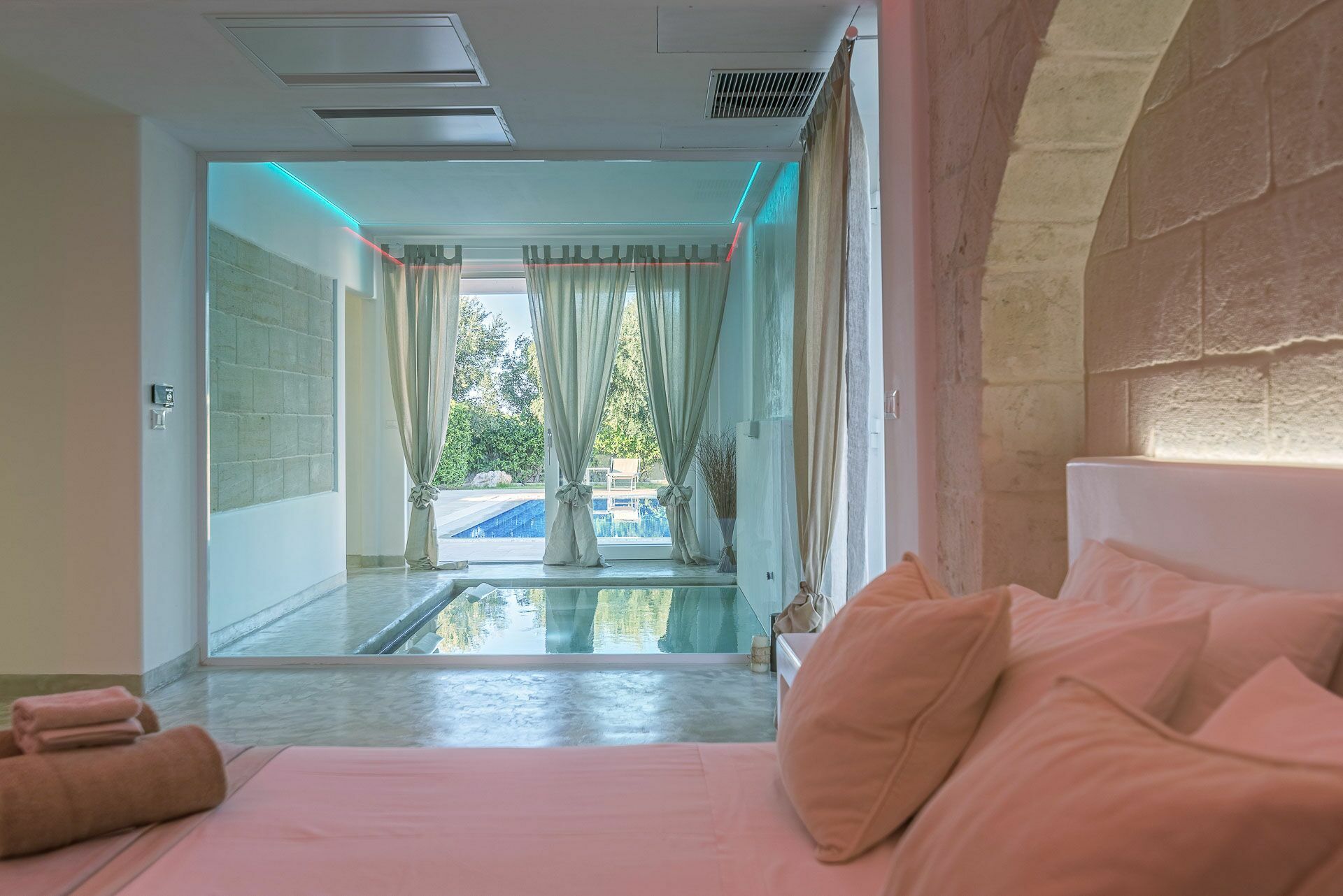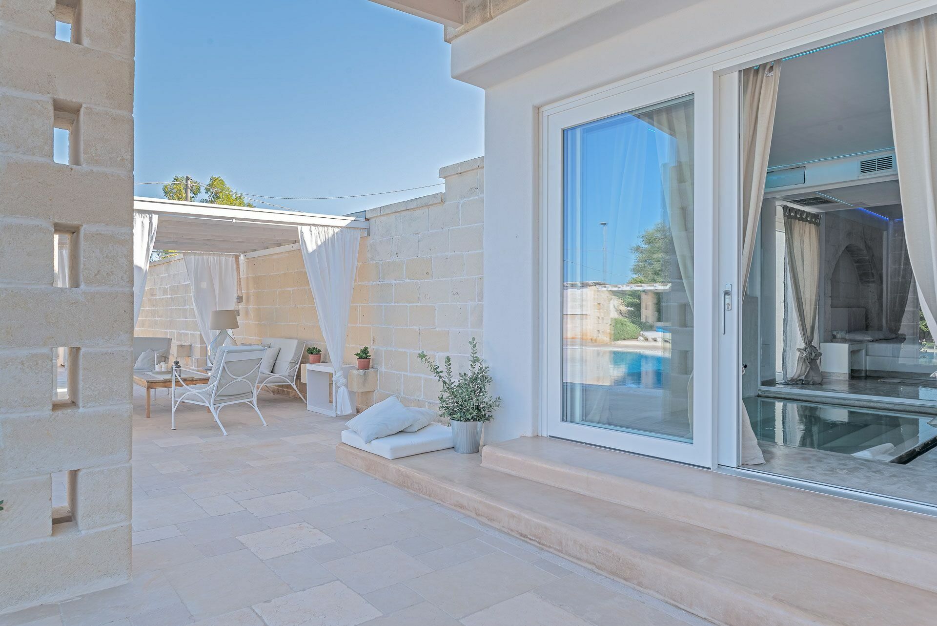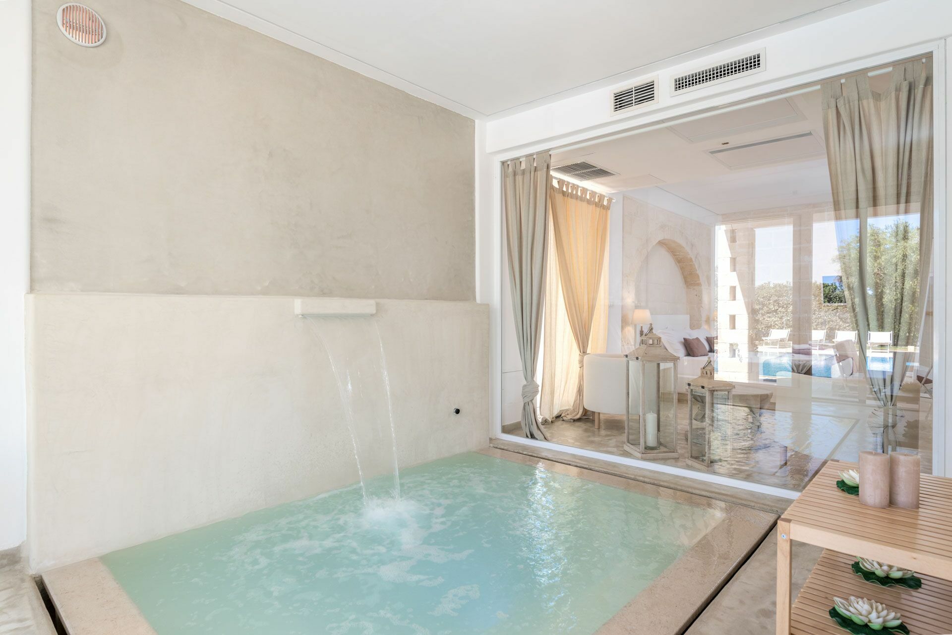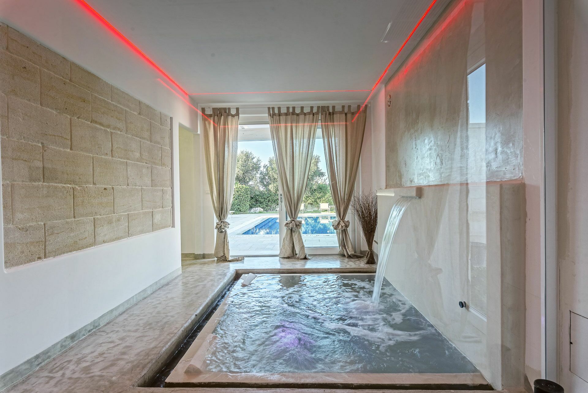 Verbonden met de Master Suite is de jacuzzi met gemasseerde brandkranen die uitkijken op de tuin en het zwembad.