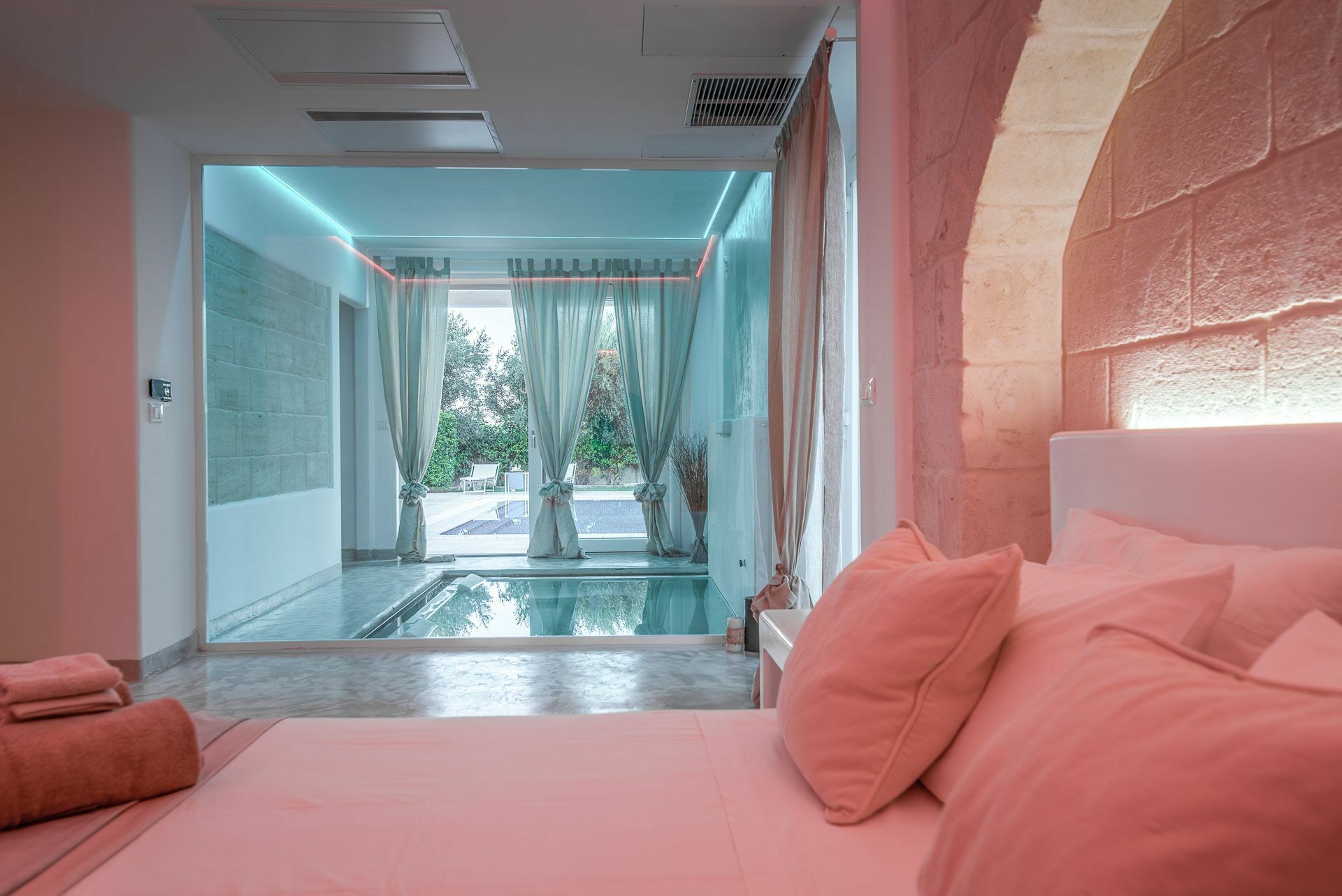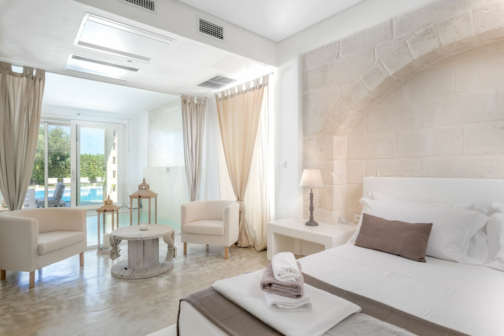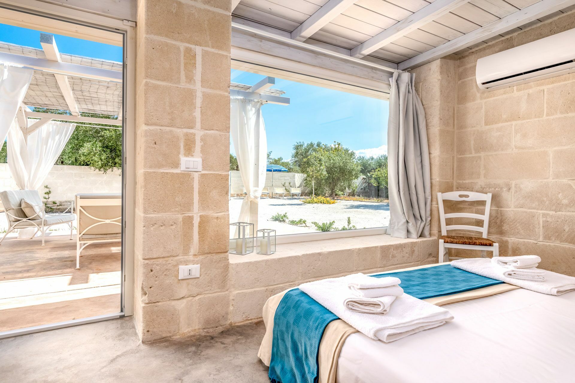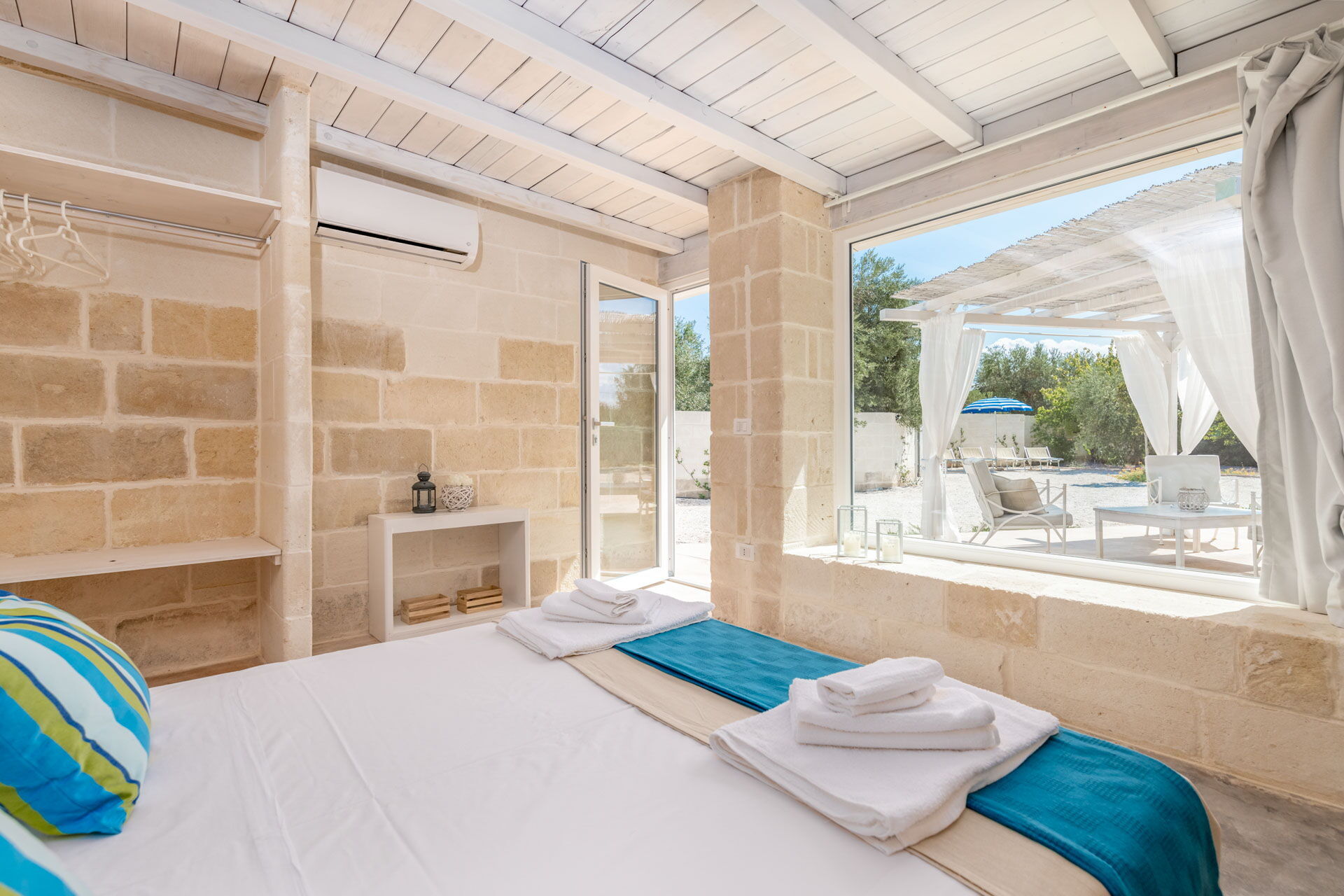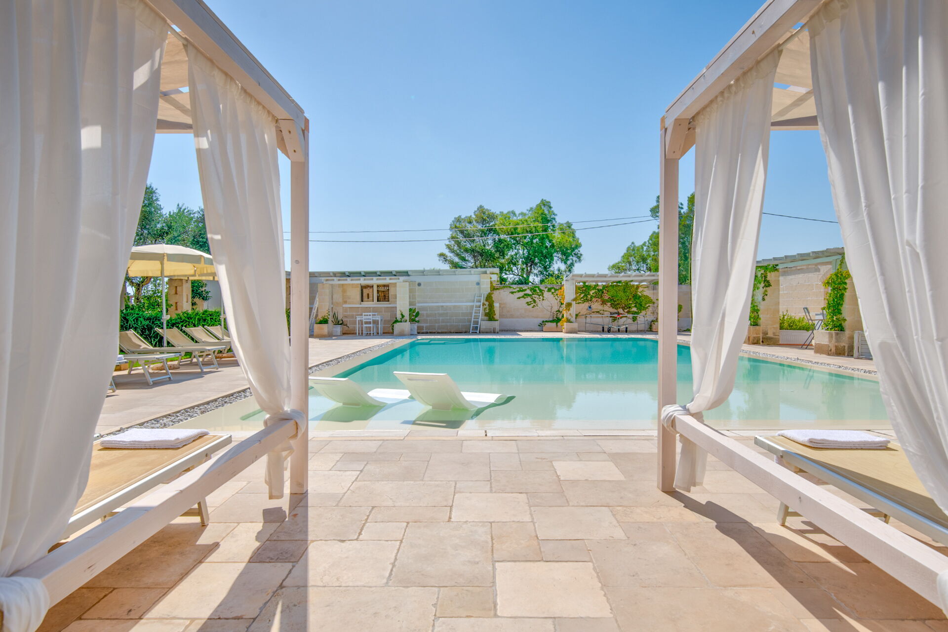 De Clò Master Suite, met een gemetseld tweepersoonsbed en en-suite badkamer voor privégebruik, heeft als enige directe toegang tot het zwembad met jacuzzi en het grote zwembad van 11 * 7 meter (met een diepte van 0,3 tot 1,5 meter) in de tuin. De kamer heeft zichtbaar metselwerk en een tweepersoonsbed met een hoofdeinde van 2.40x1.90, lakens, handdoeken en vier kussens. Aan de randen van het bed bevinden zich de twee ingebouwde nachtkastjes en aan de voorzijde de nissen in de muur voor de kleerkast en de koffersteun. De aangrenzende badkamer is compleet met dubbele wastafel met spiegel, toilet, bidet en douche.