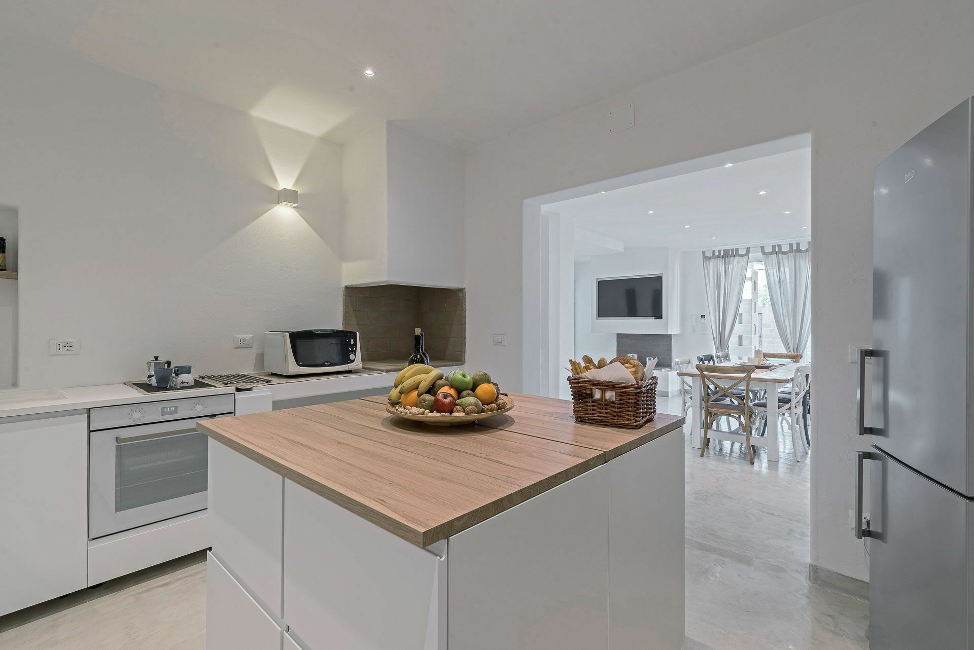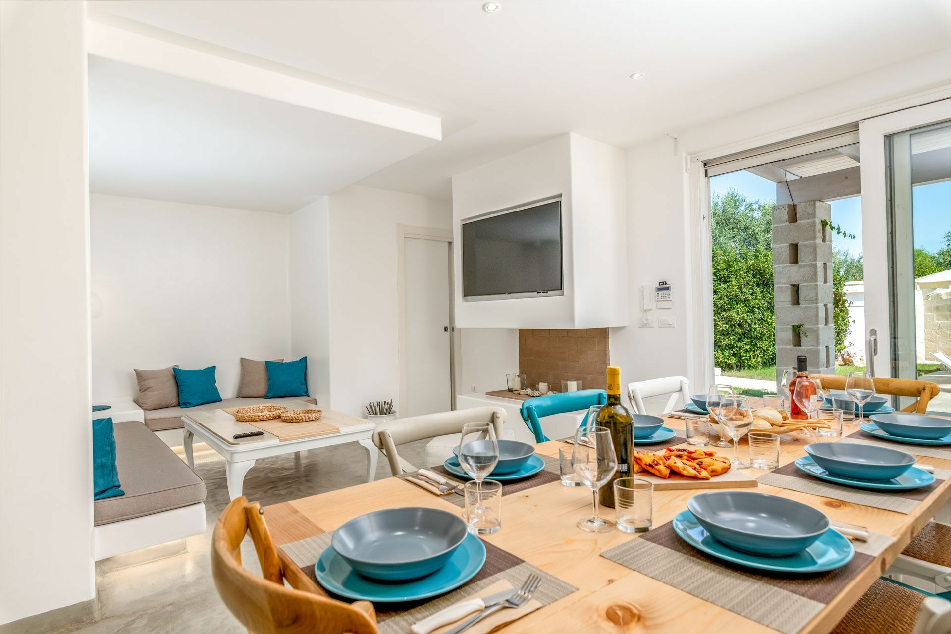 De eetkamer heeft in het midden een grote tafel die plaats biedt aan maximaal 10 gasten, en bij binnenkomst vindt aan de rechterkant de grote "L" vormige bank met salontafel en Smart TV (inclusief SKY satelliet TV) ingebouwd in de open haard.