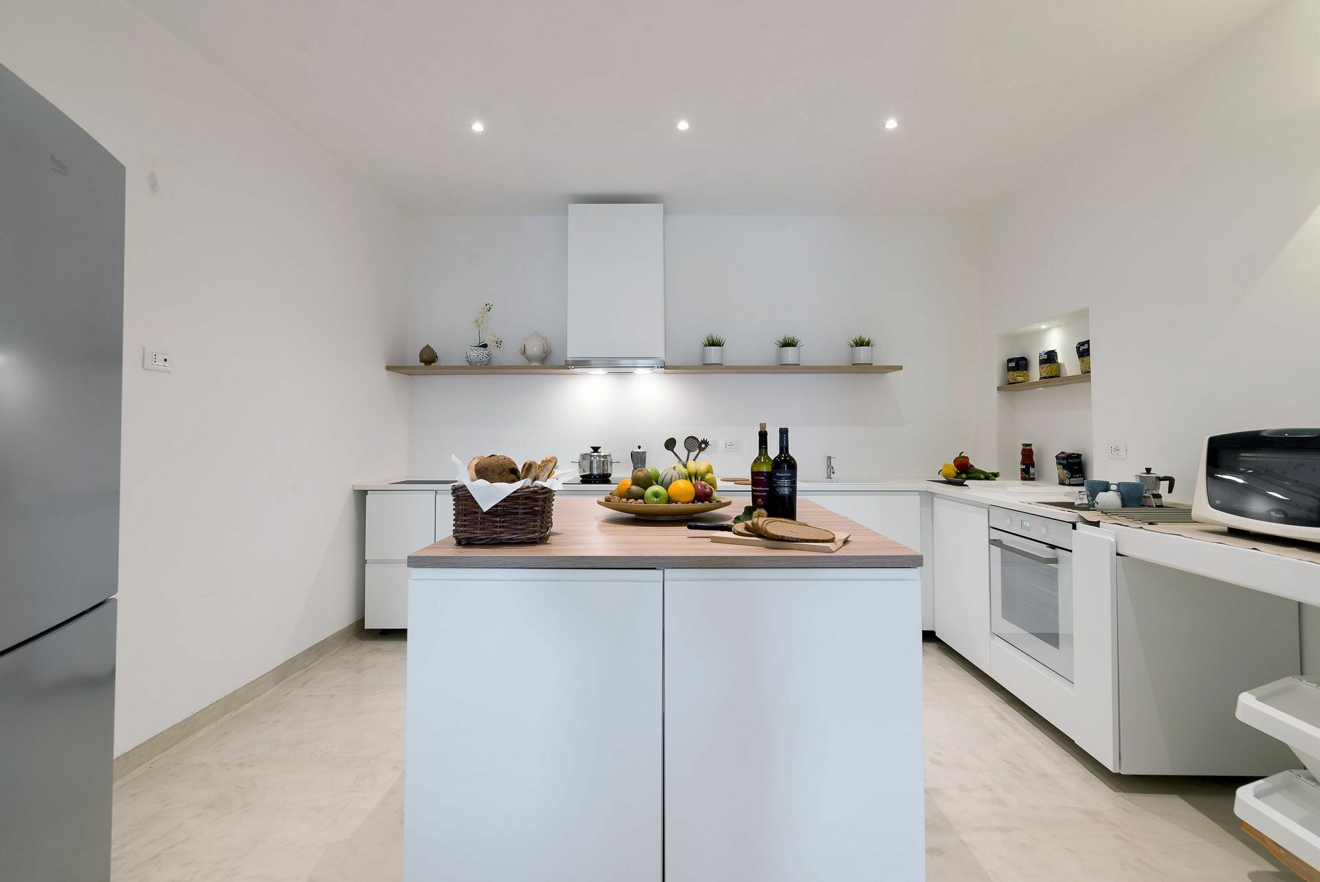 Onderaan bevindt zich de complete keuken en voorzien van een kookeiland voor het bereiden van gerechten, de inductiekookplaat met afzuigkap voor het ontsnappen van geurtjes, de spoelbak, de koelkast met vriezer, de vaatwasser, de magnetron, de waterkoker en de elektrische oven.