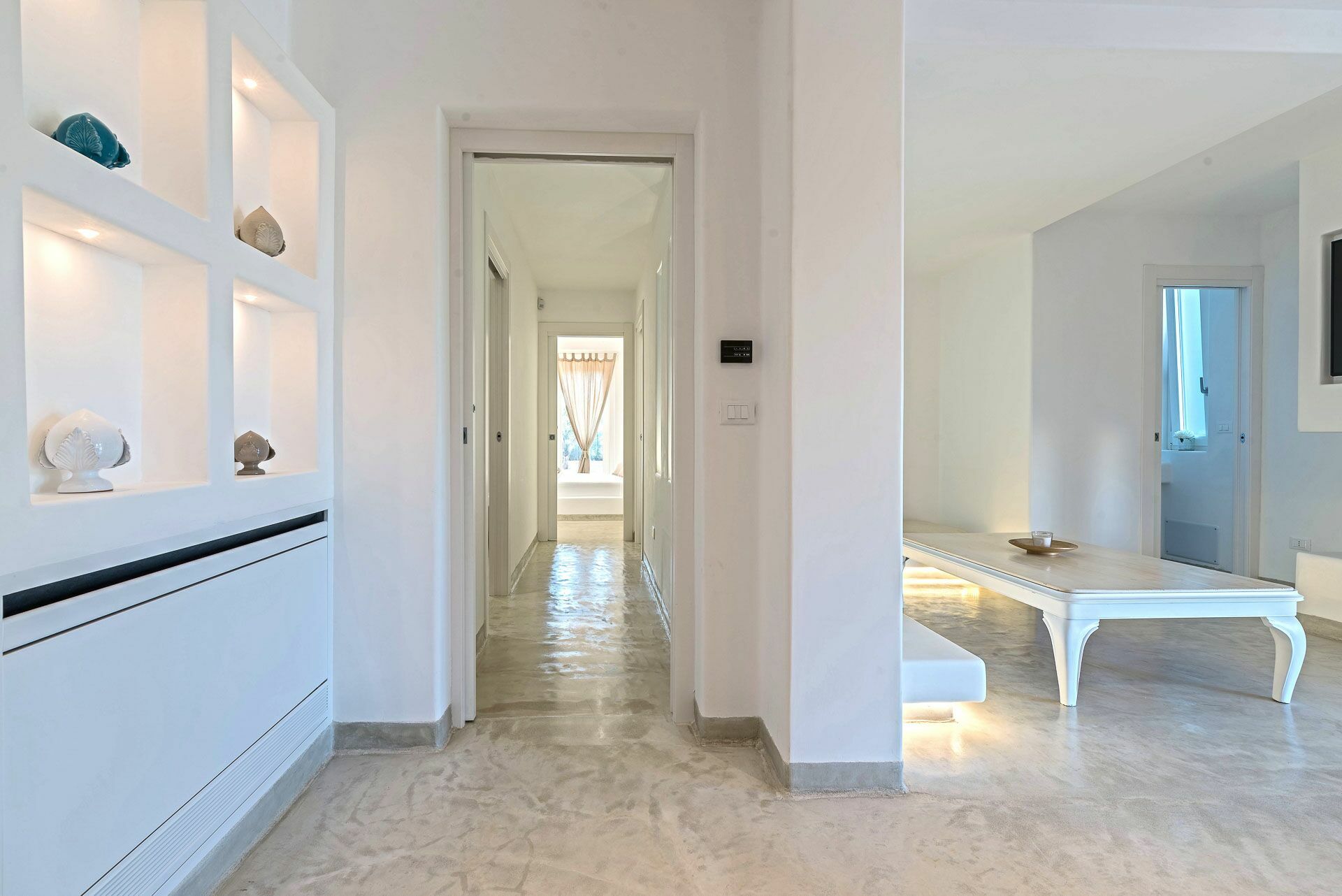 Ook vanuit de woonkamer leidt de gang met dakramen aan de muur naar de drie suite slaapkamers.