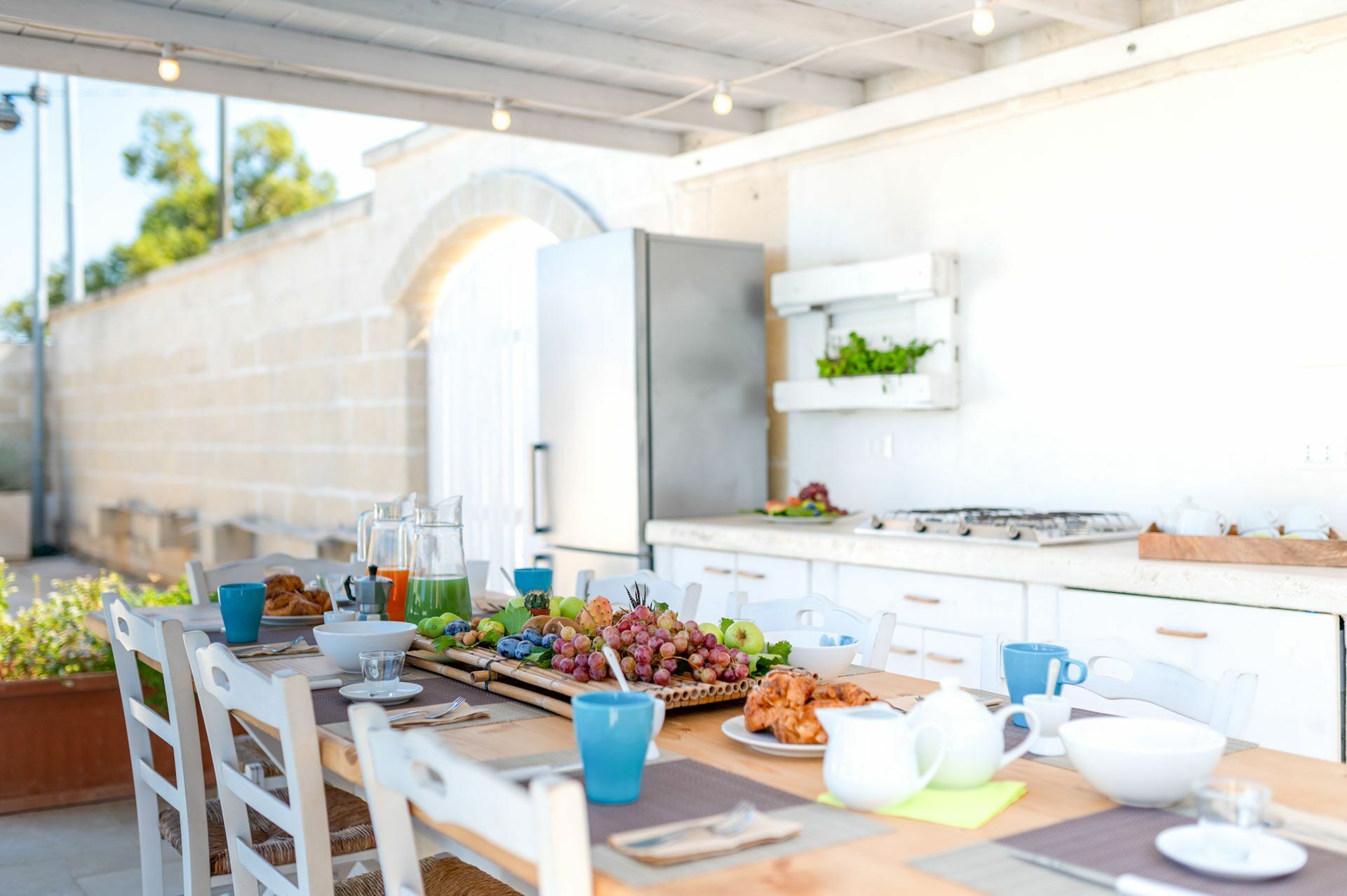 Er zijn drie veranda's met twee eetgedeeltes met een tafel en een ontspanningsruimte voor thee of koffie. In correspondentie is er de barbecue.
