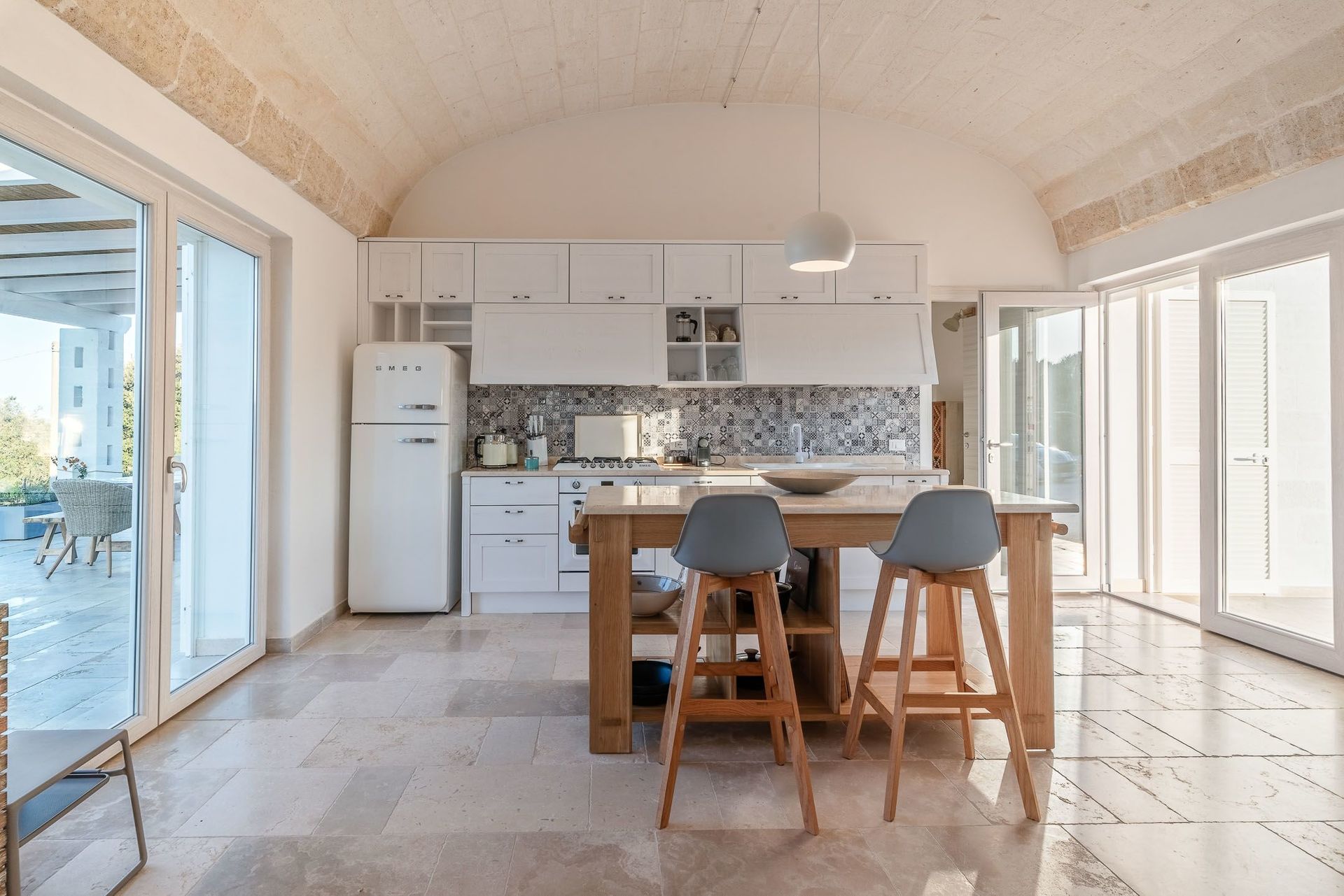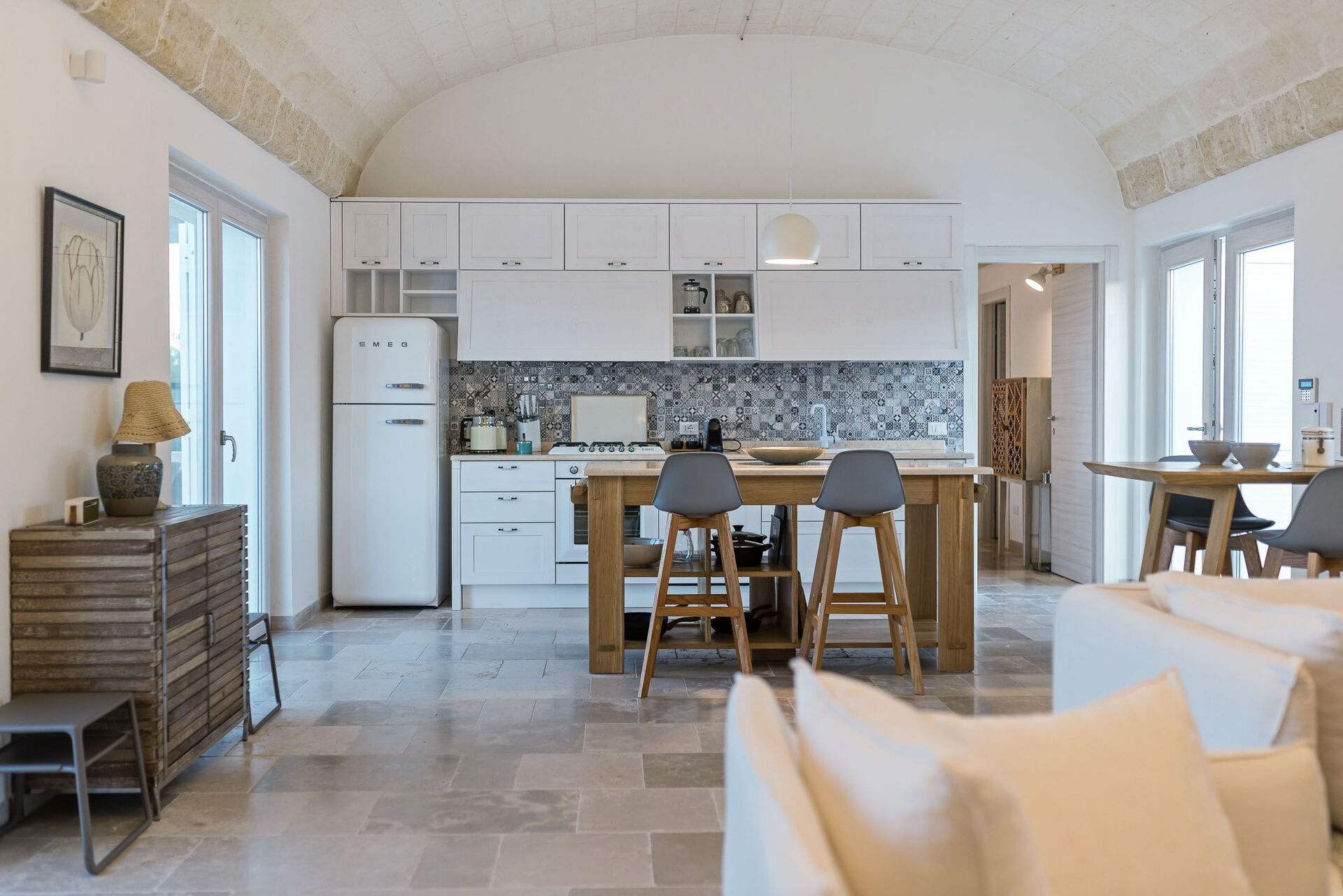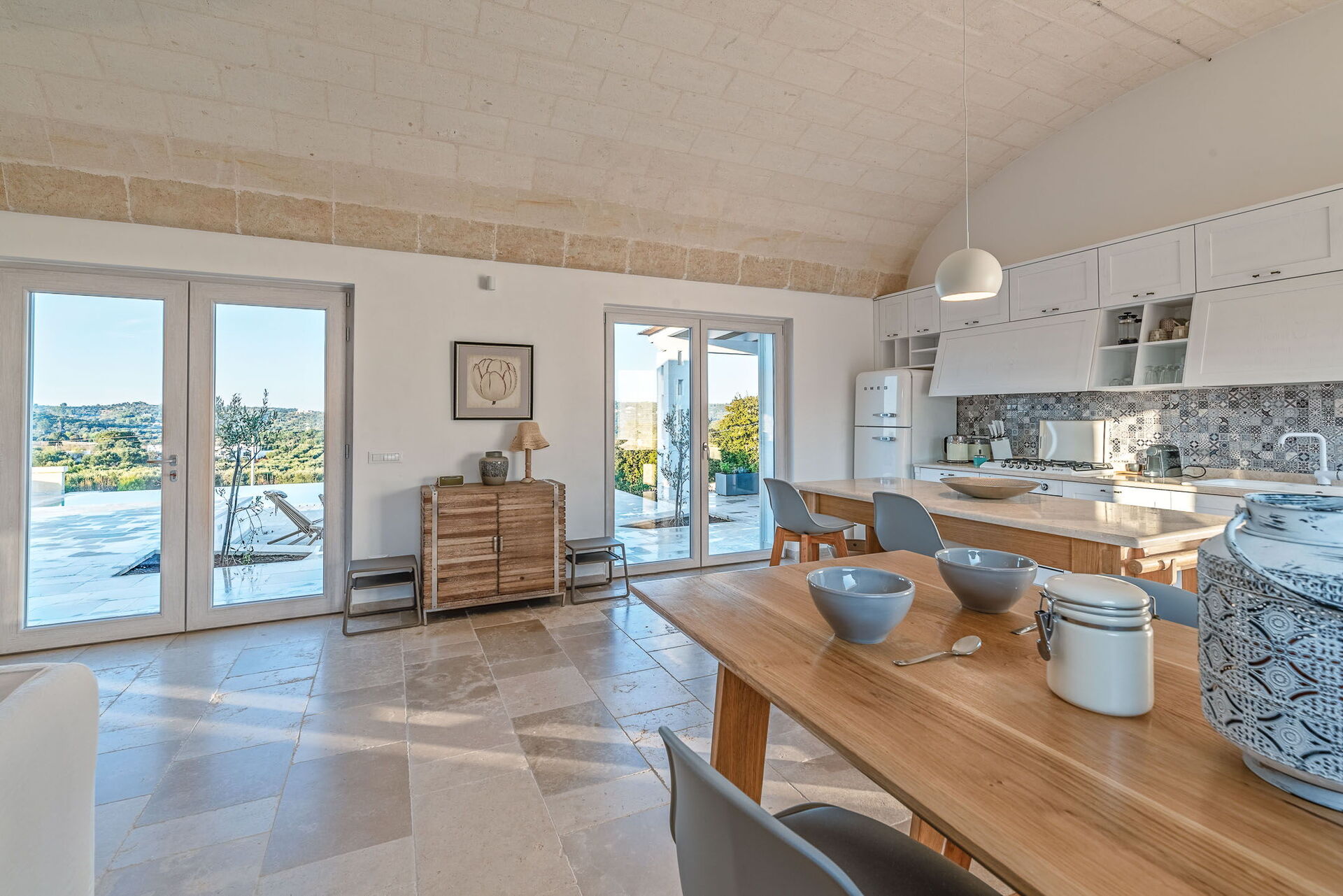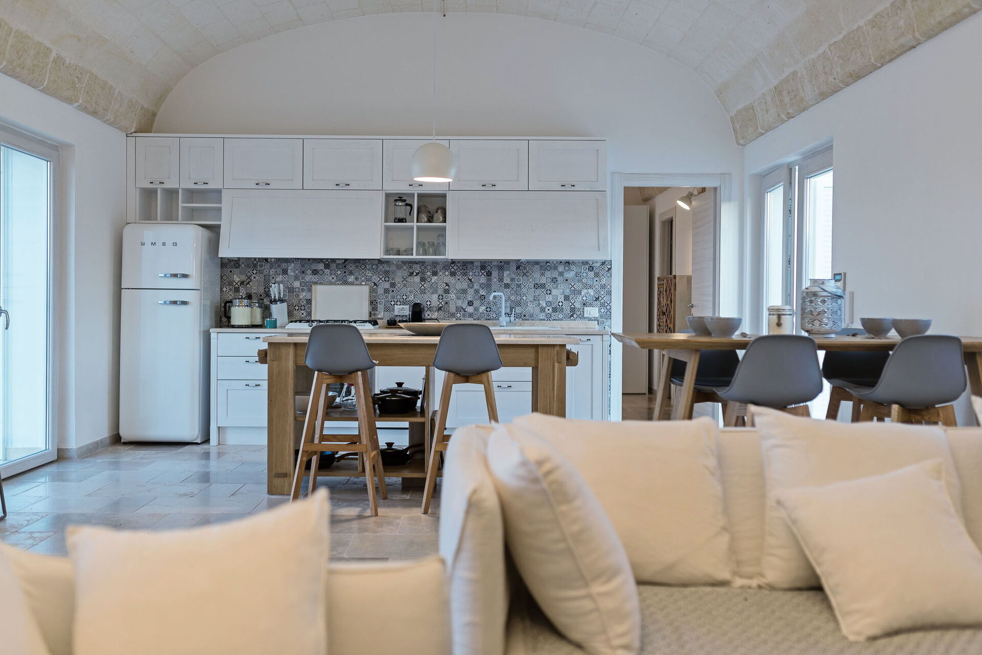 De keuken is smaakvol uitgevoerd met witte inbouwkasten, Smeg-apparatuur met grote koelkast met vriesvak, 5-pits elektrische kookplaat en elektrische oven met afzuigkap, allemaal ideaal voor degenen die graag koken in hun vakantievilla. Lokale producten zijn direct verkrijgbaar bij de plaatselijke winkels of op zaterdag is er een markt in Ostuni.
