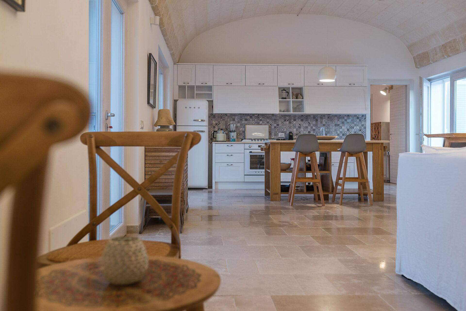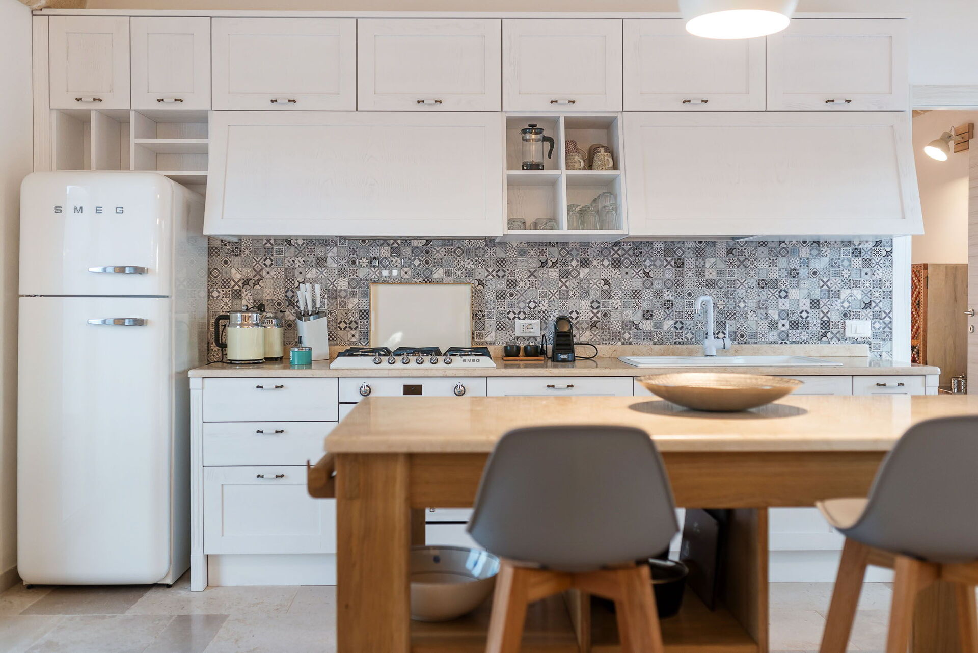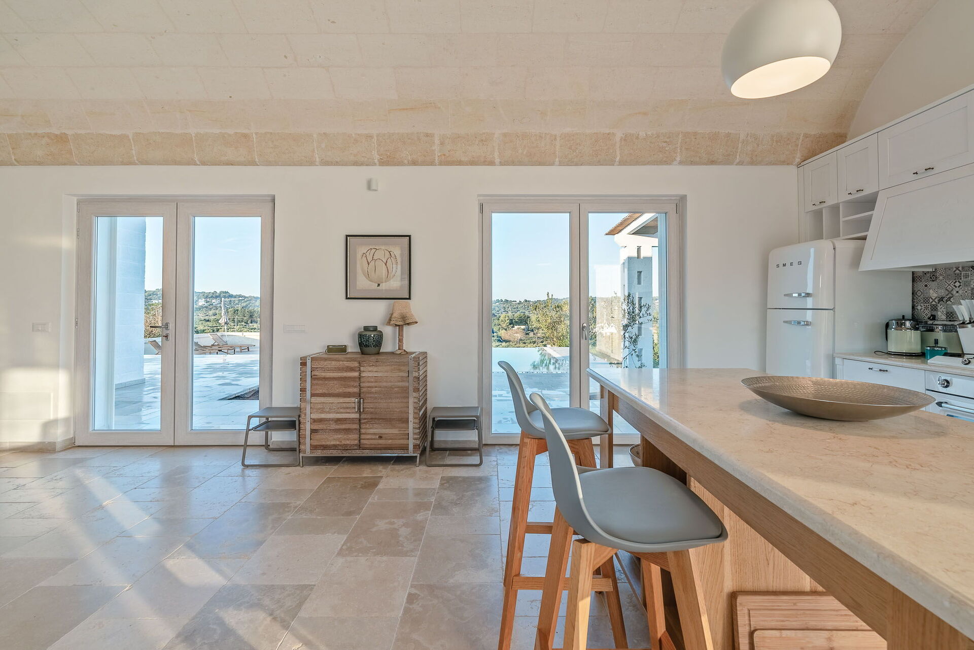 De keuken is smaakvol uitgevoerd met witte inbouwkasten, Smeg-apparatuur met grote koelkast met vriesvak, 5-pits elektrische kookplaat en elektrische oven met afzuigkap, allemaal ideaal voor degenen die graag koken in hun vakantievilla. Lokale producten zijn direct verkrijgbaar bij de plaatselijke winkels of op zaterdag is er een markt in Ostuni.