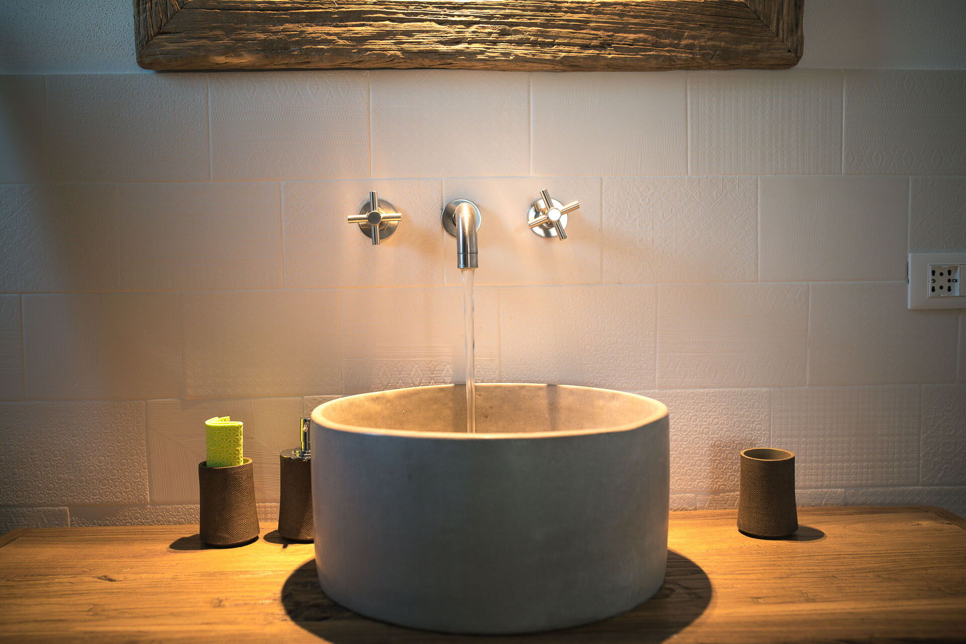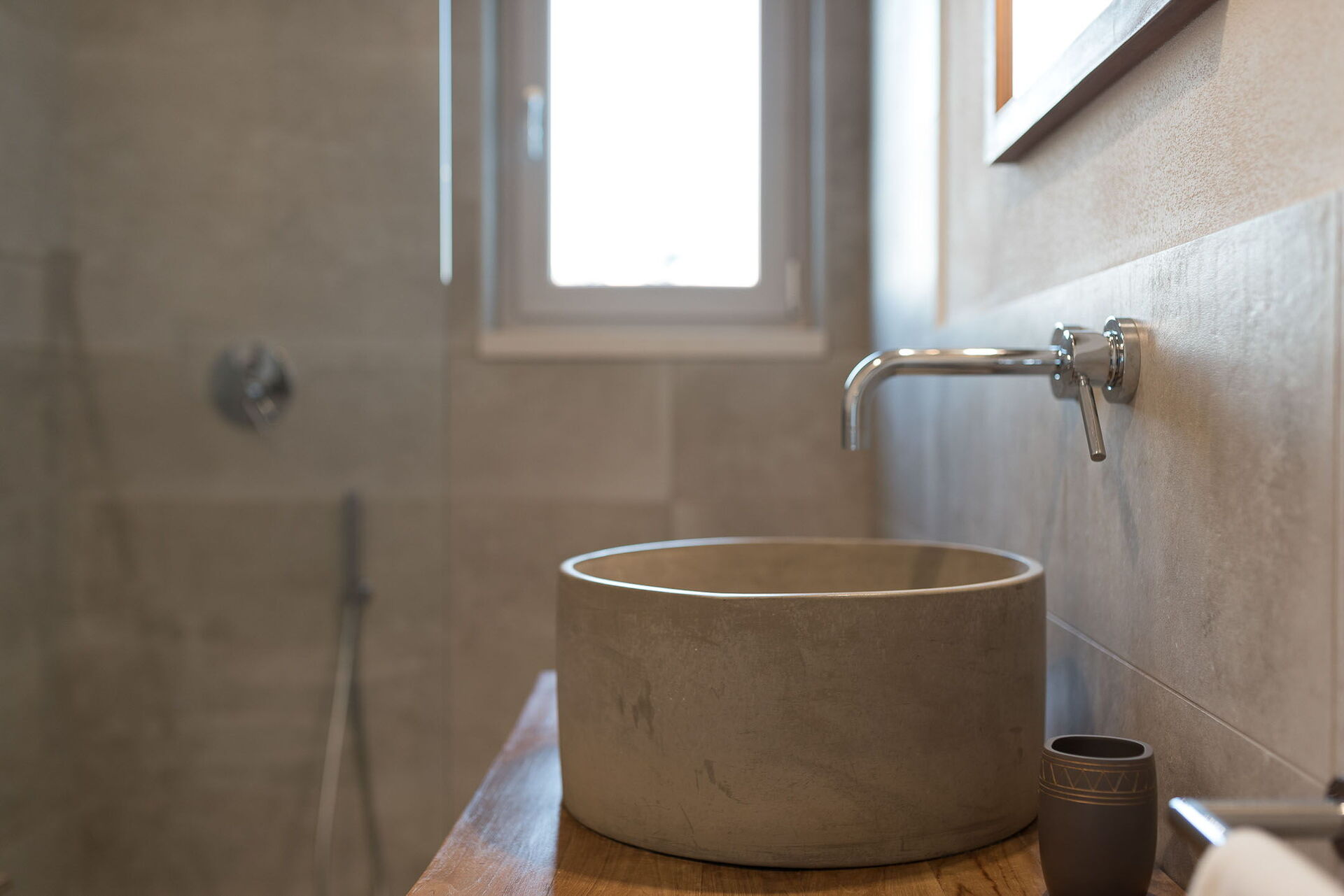 De villa is zeer modern, met overal gepolijste grijze betonnen vloeren.