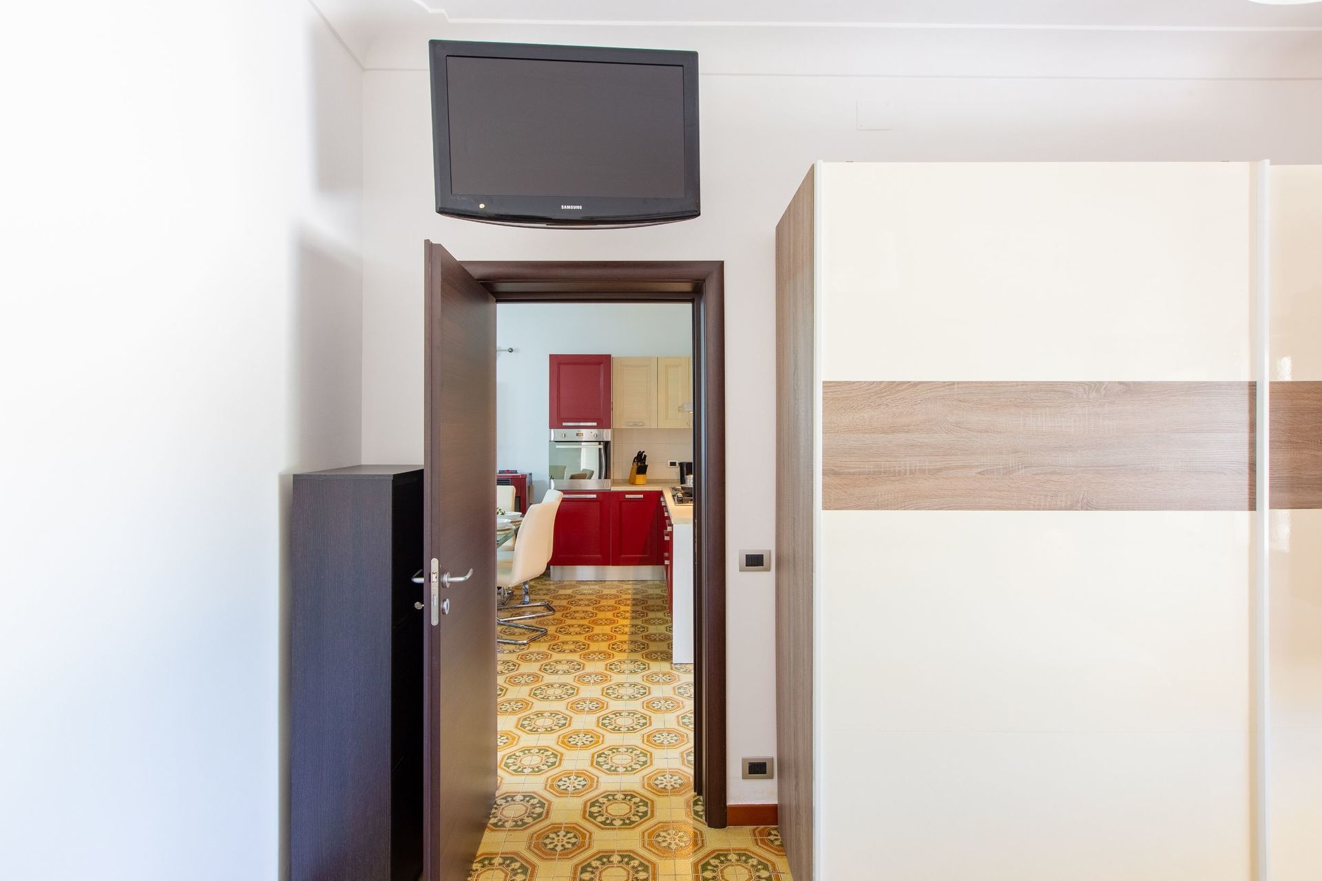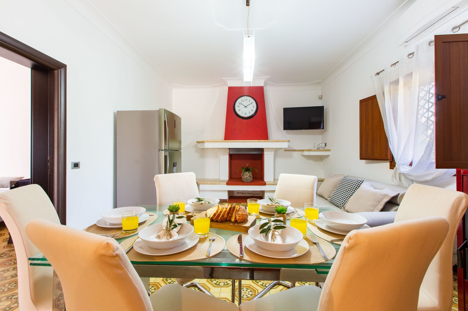 Keuken – woonkamer: eettafel, vaatwasser, ijskast, diepvriezer, oven, bank, WIFI internet, airconditioning, hor, tv.