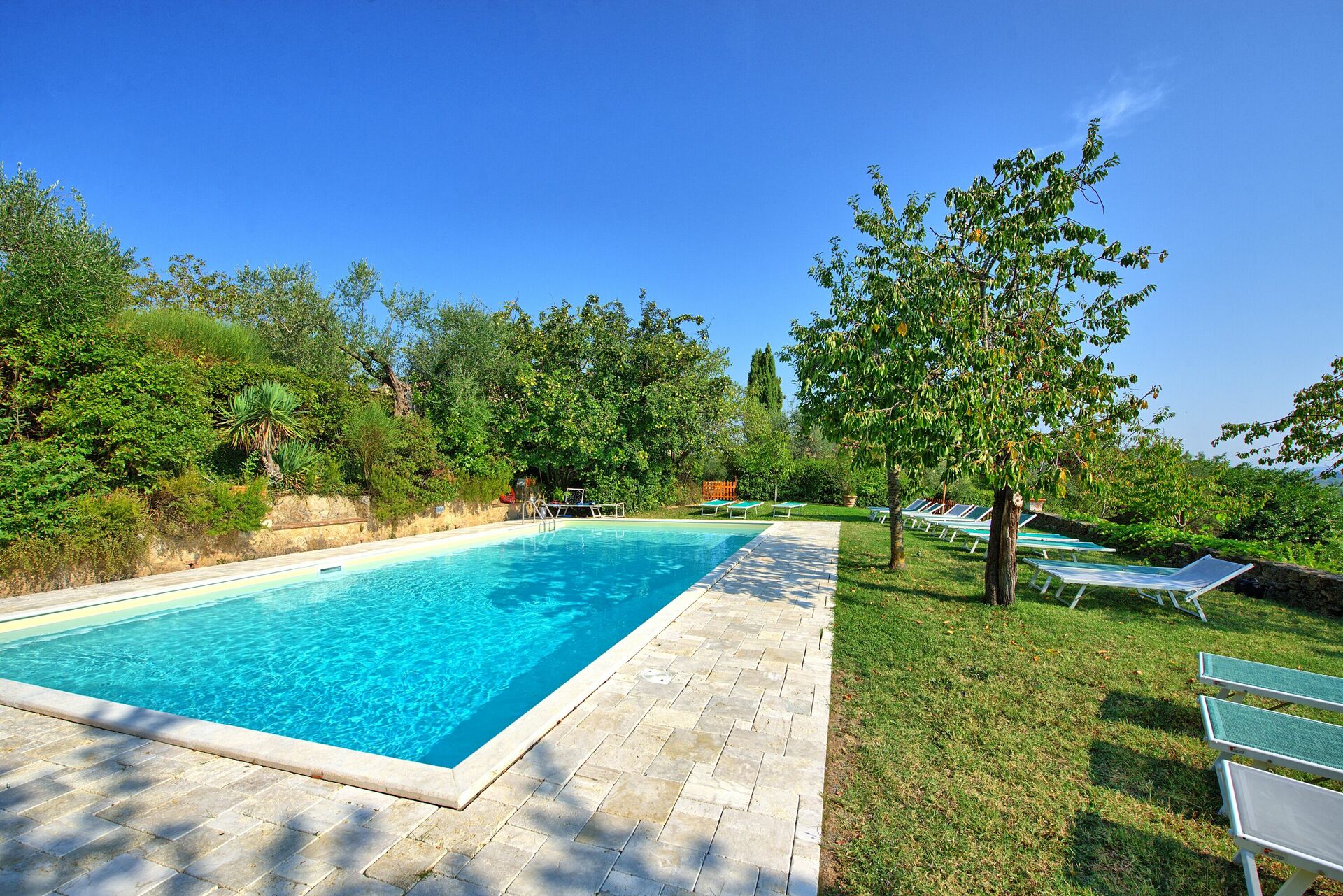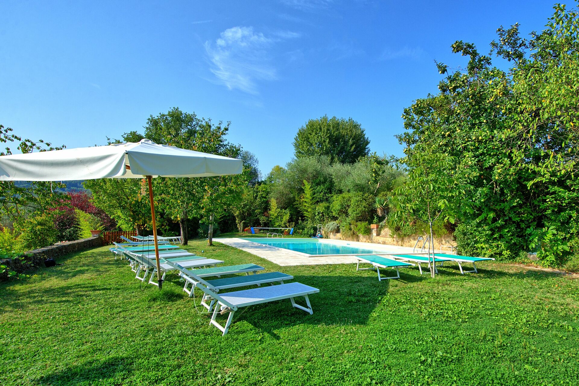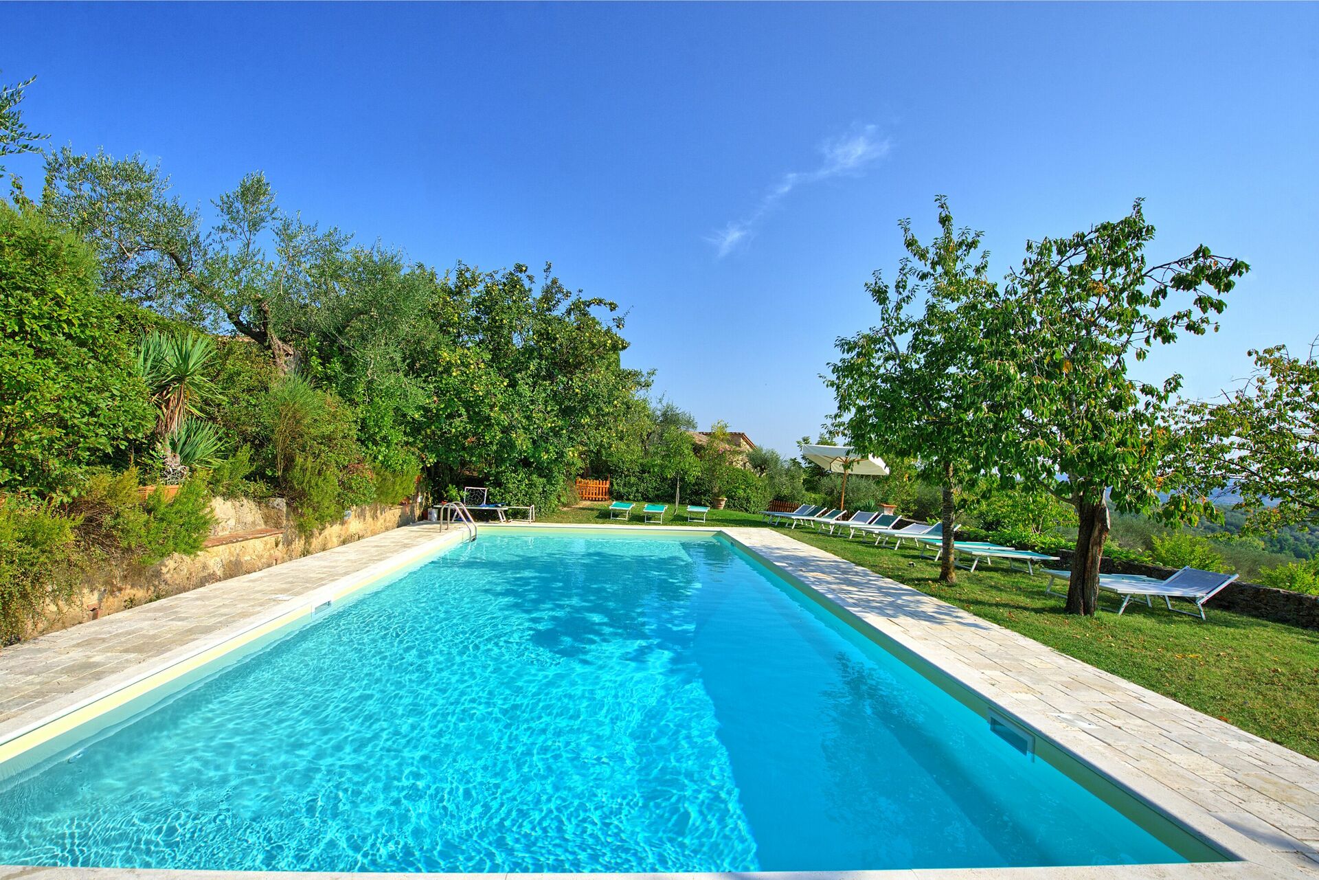 Ter beschikking van de gasten: grote tuin met een panoramisch gelegen zwembad, gereserveerd voor exclusief gebruik van de gasten van Villa Sarteano (12 x 6 m – min. diepte 1,2 m – max. diepte 2,4 m.), buitendouche met koud water bij het zwembad. Parkeren op het terrein.