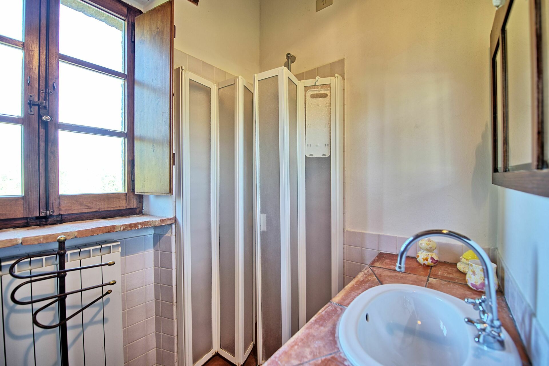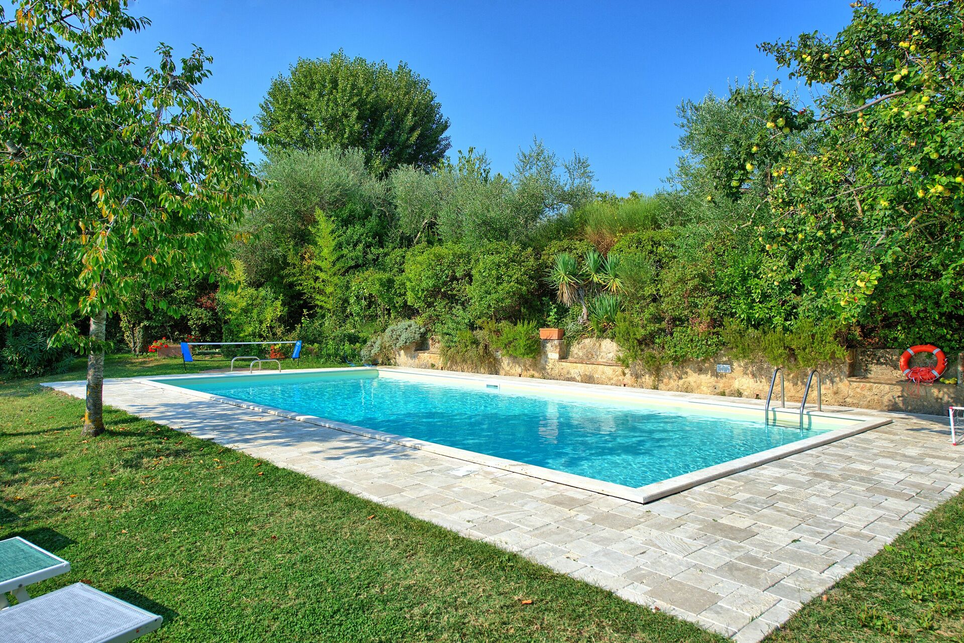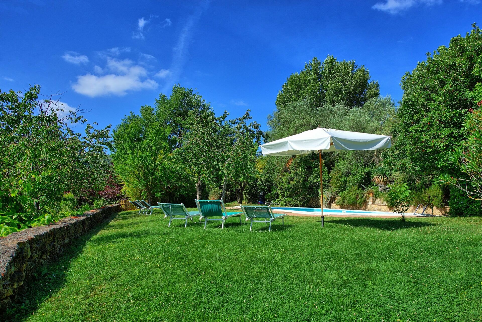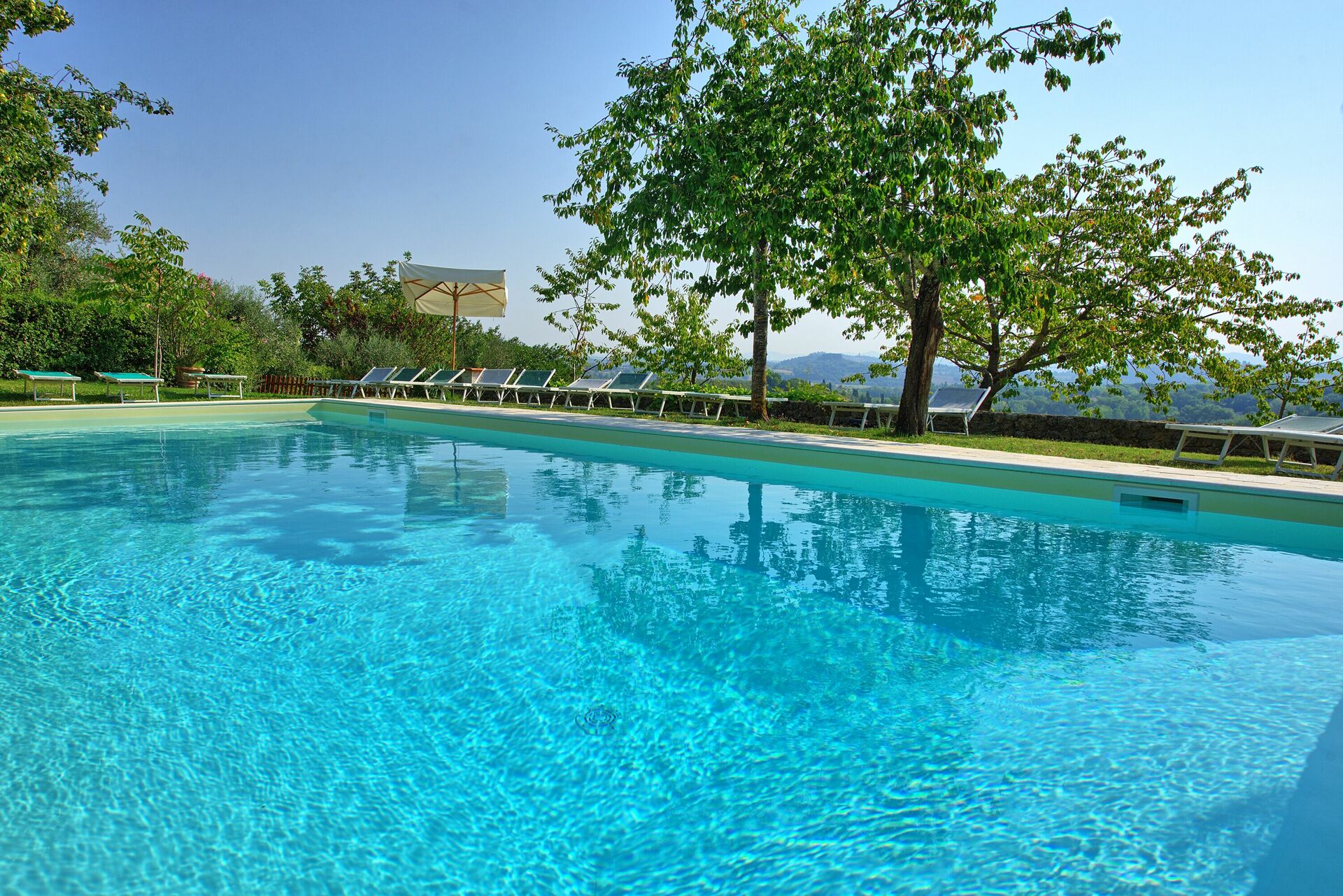 Ter beschikking van de gasten: grote tuin met een panoramisch gelegen zwembad, gereserveerd voor exclusief gebruik van de gasten van Villa Sarteano (12 x 6 m – min. diepte 1,2 m – max. diepte 2,4 m.), buitendouche met koud water bij het zwembad. Parkeren op het terrein.