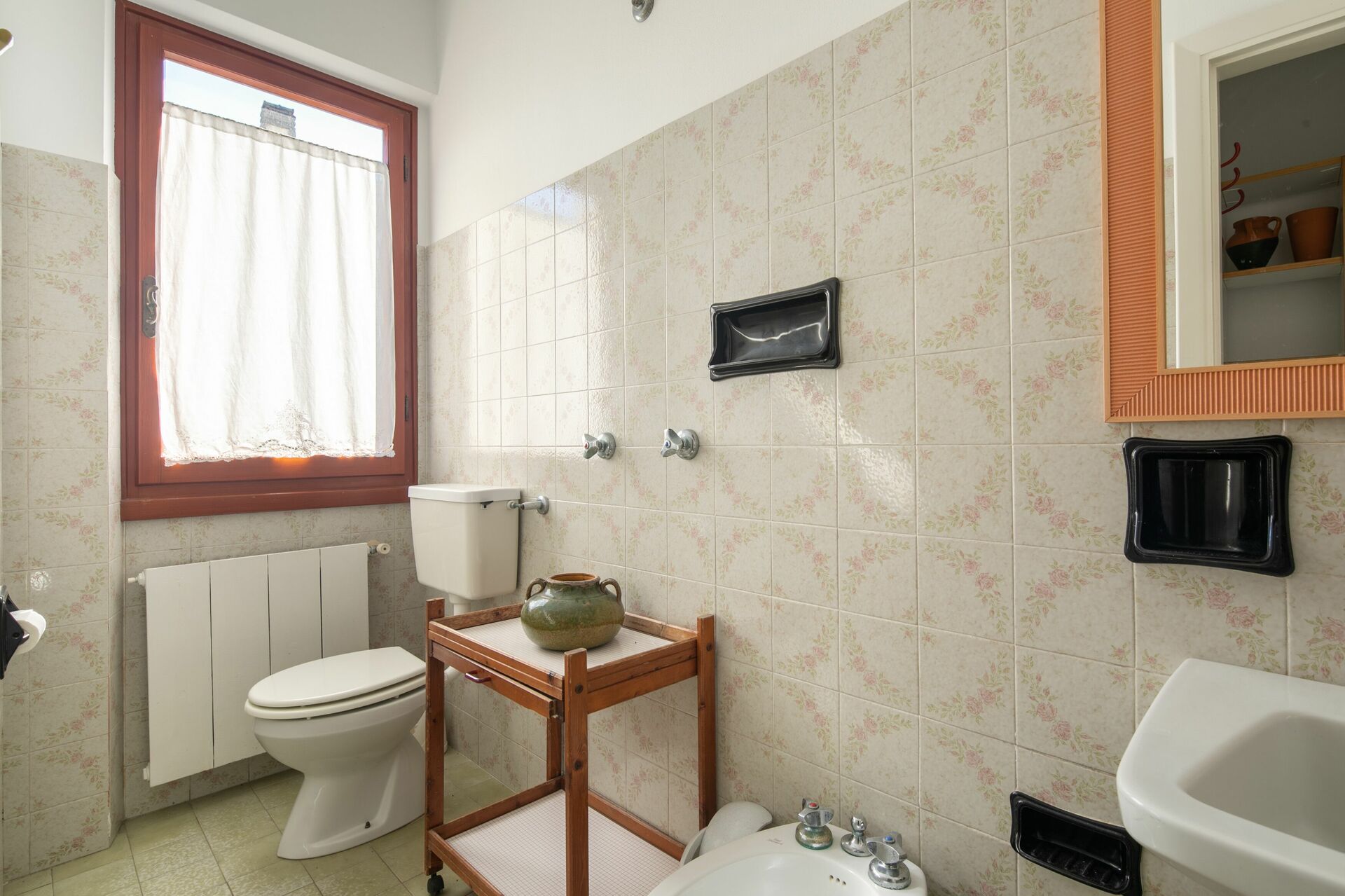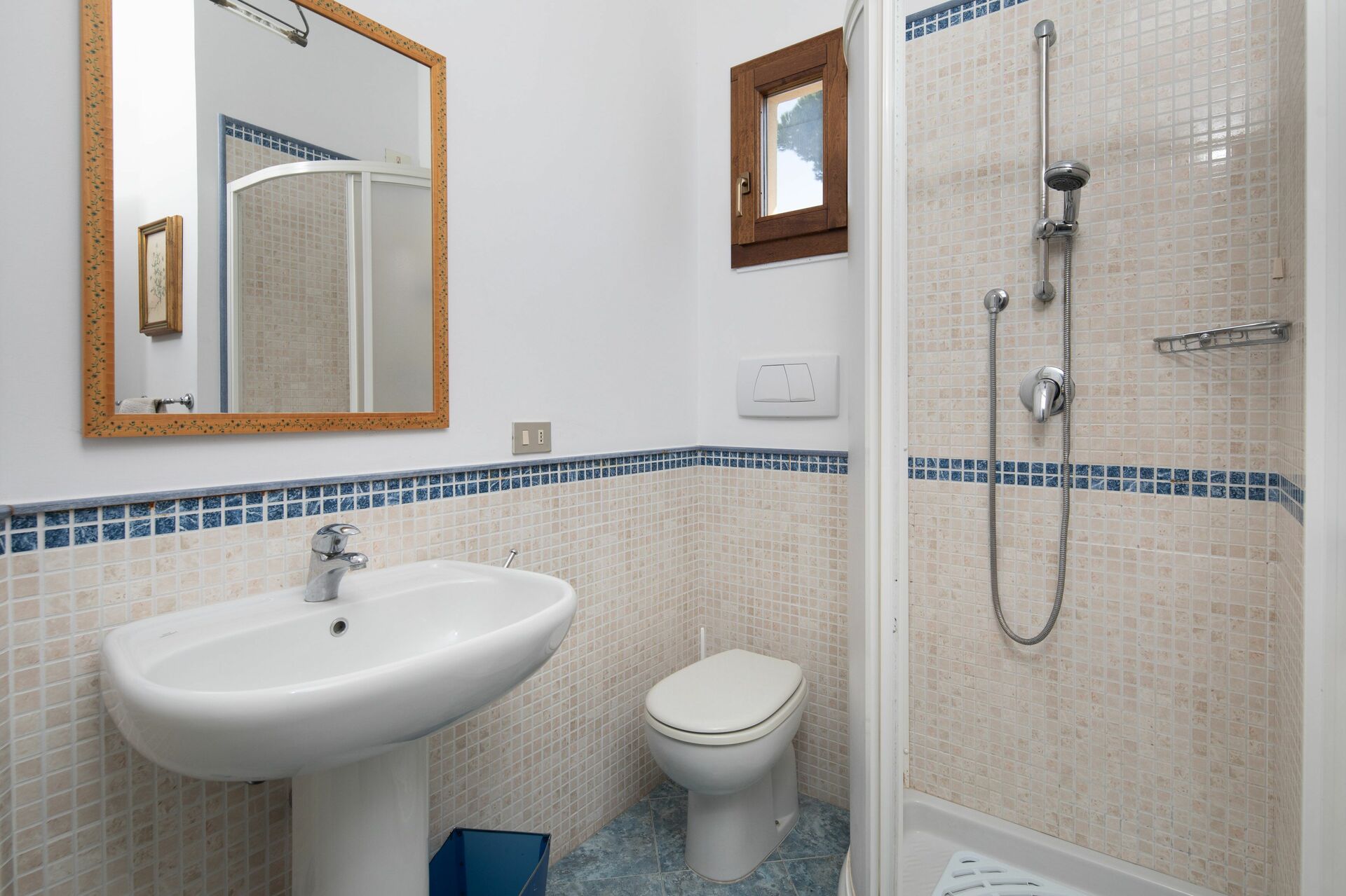 Badkamer: wastafel, toilet , bidet, douche.