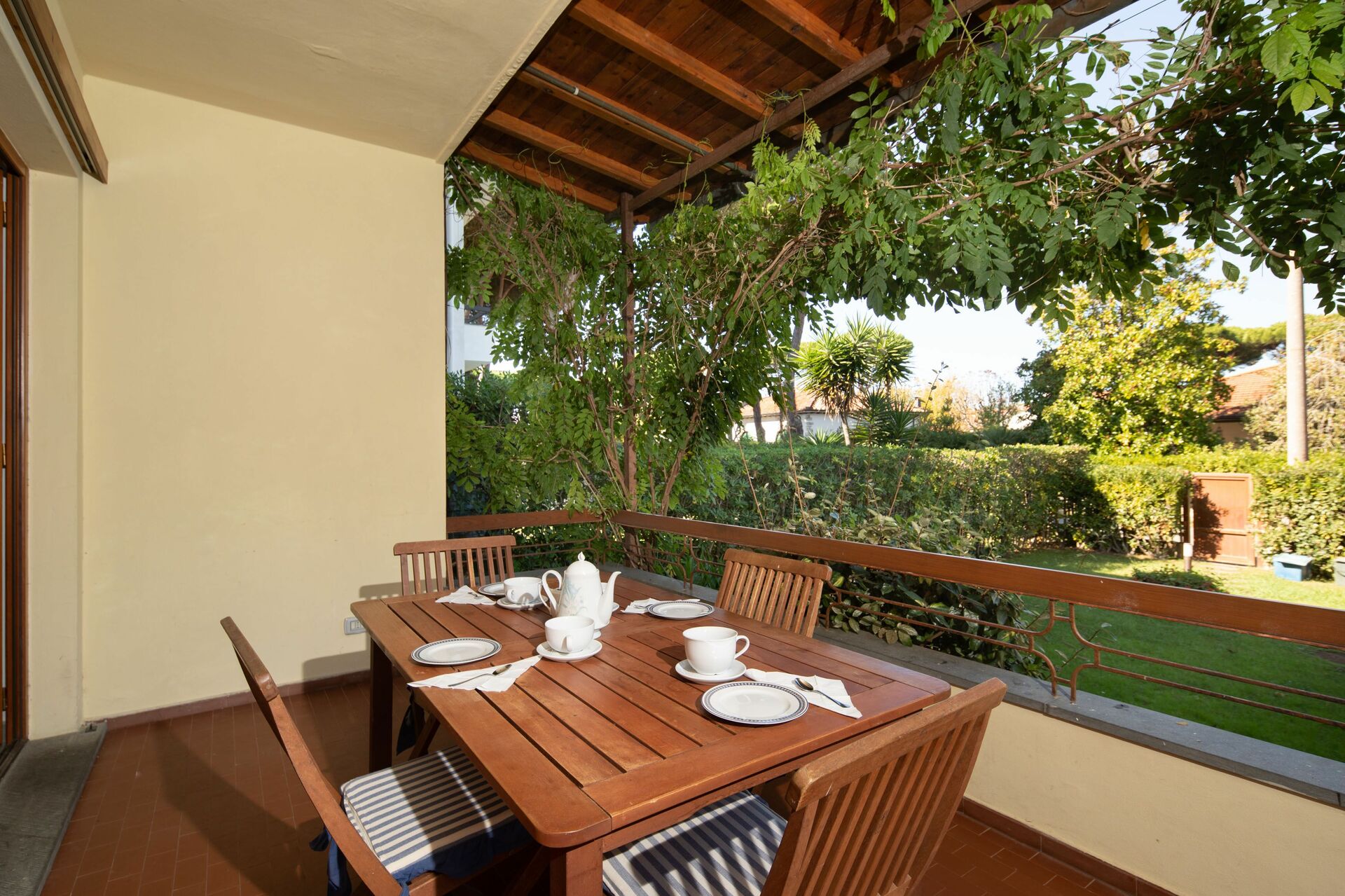 Tuin: dineren in de buitenlucht, eettafel, tuinmeubilair, terrasmeubilair, omheind.