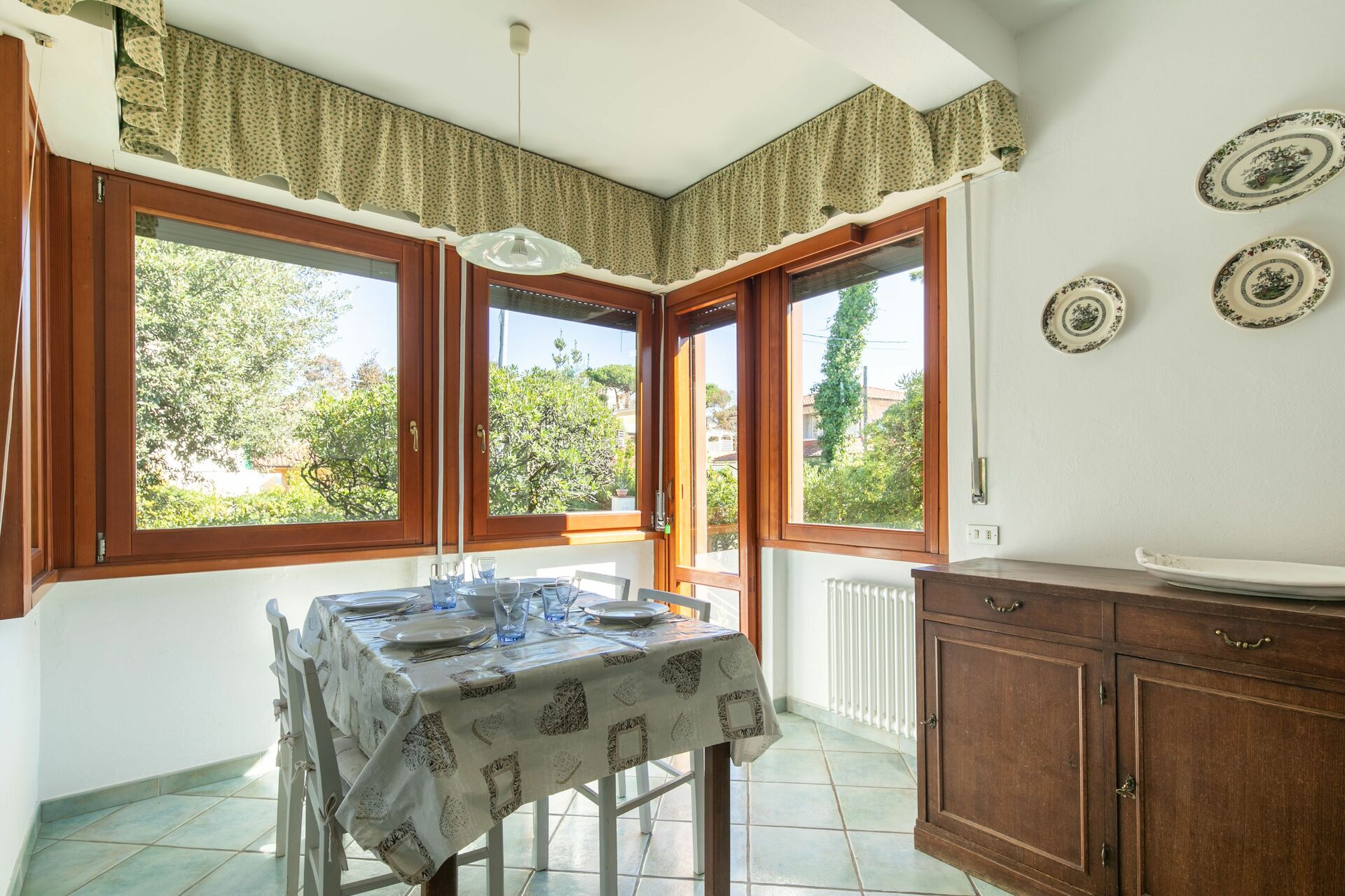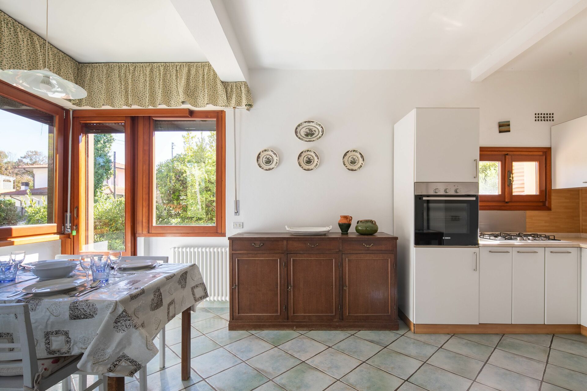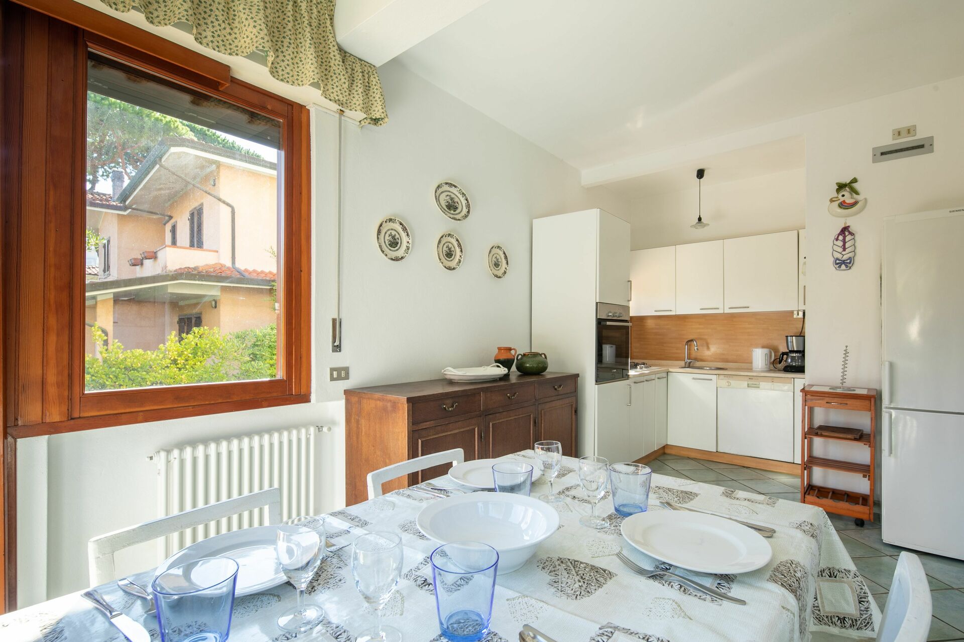 Keuken: eettafel (personen: 6), vaatwasser, ijskast, diepvriezer, oven, broodrooster, italiaans koffiezetapparaat, uitgang naar het terras.
