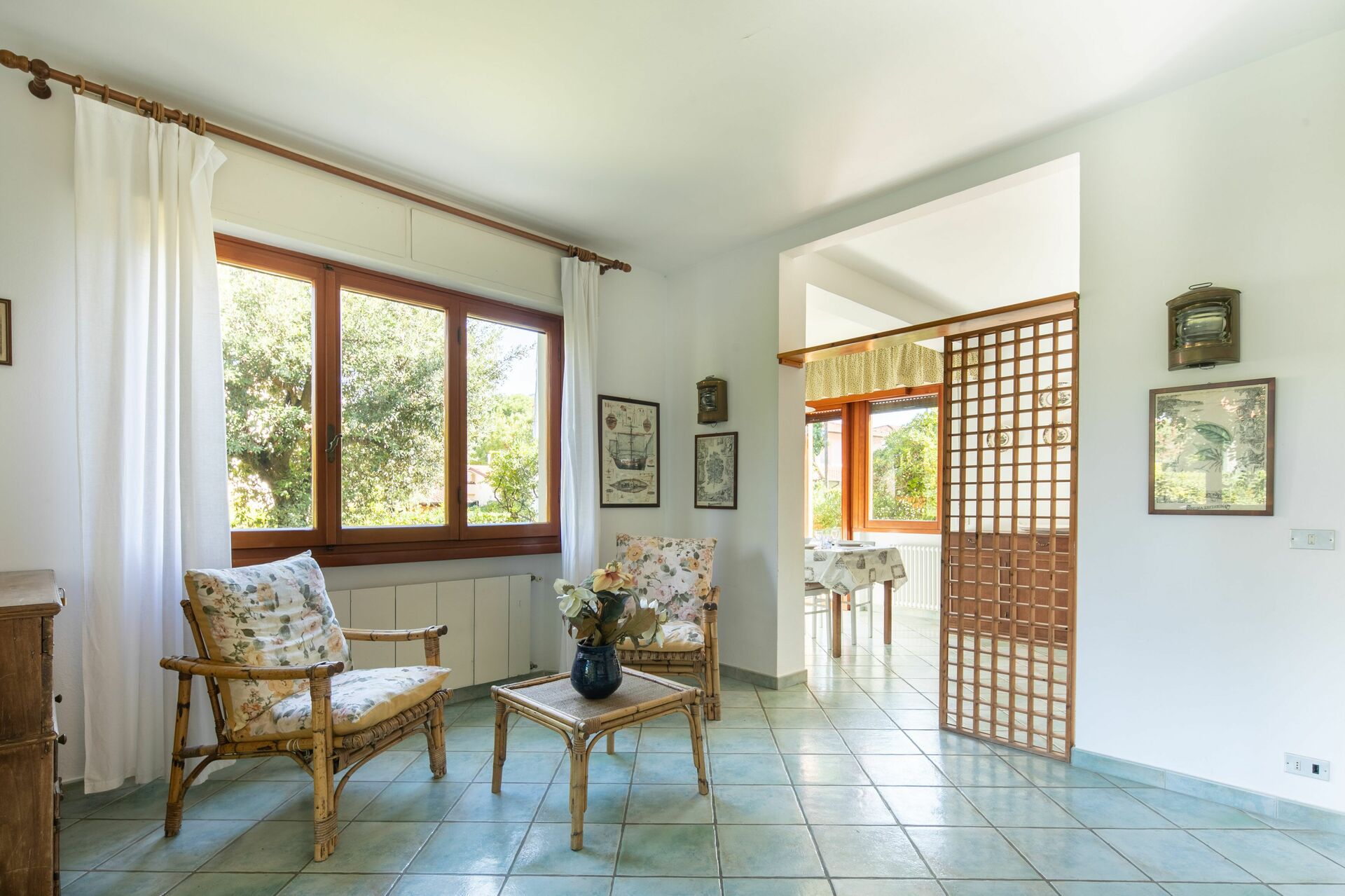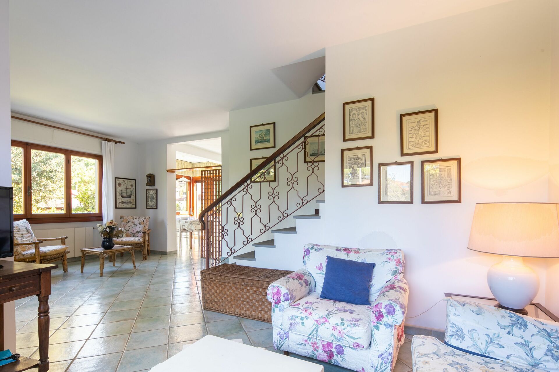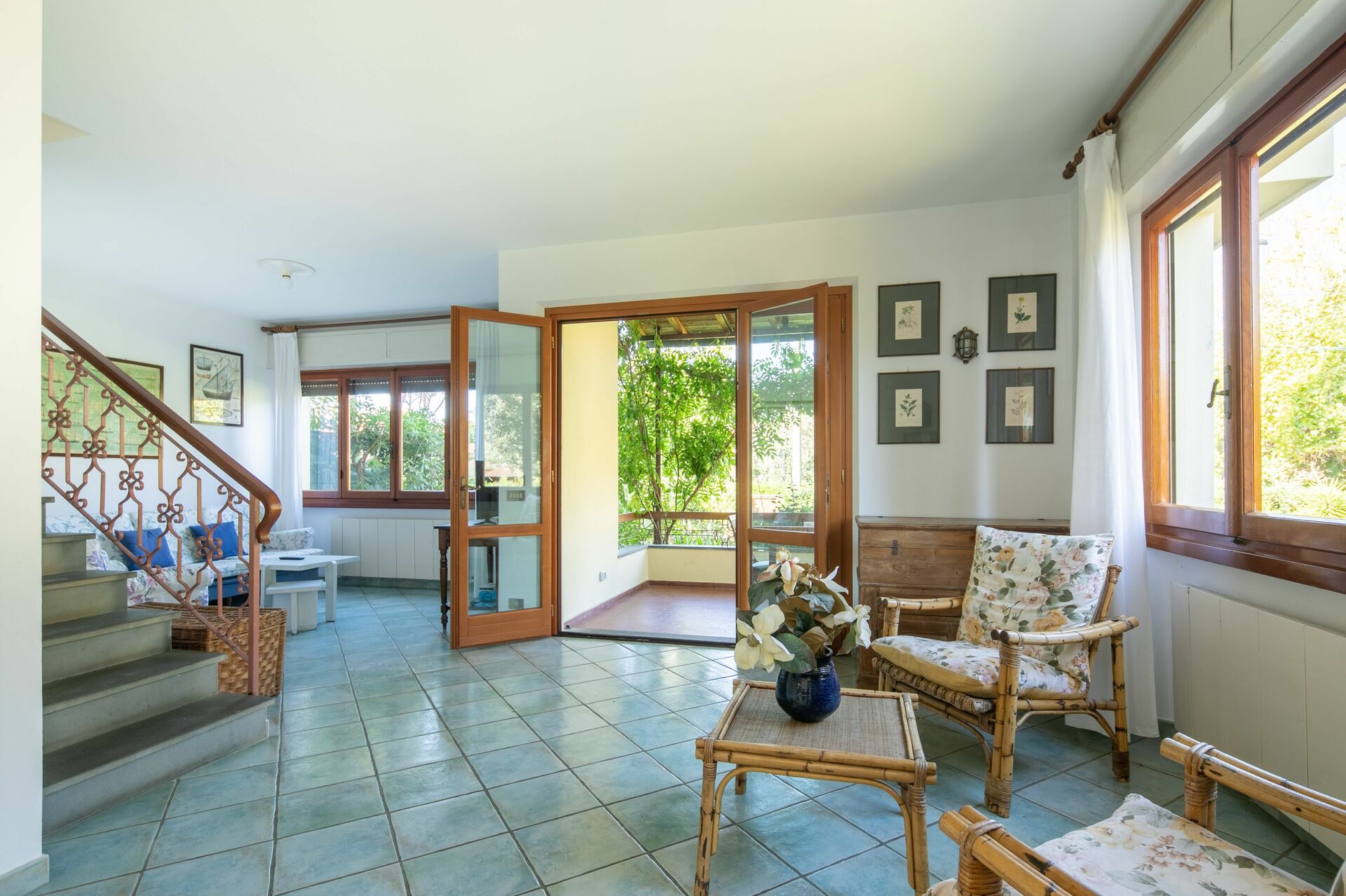 Keuken: eettafel (personen: 6), vaatwasser, ijskast, diepvriezer, oven, broodrooster, italiaans koffiezetapparaat, uitgang naar het terras.