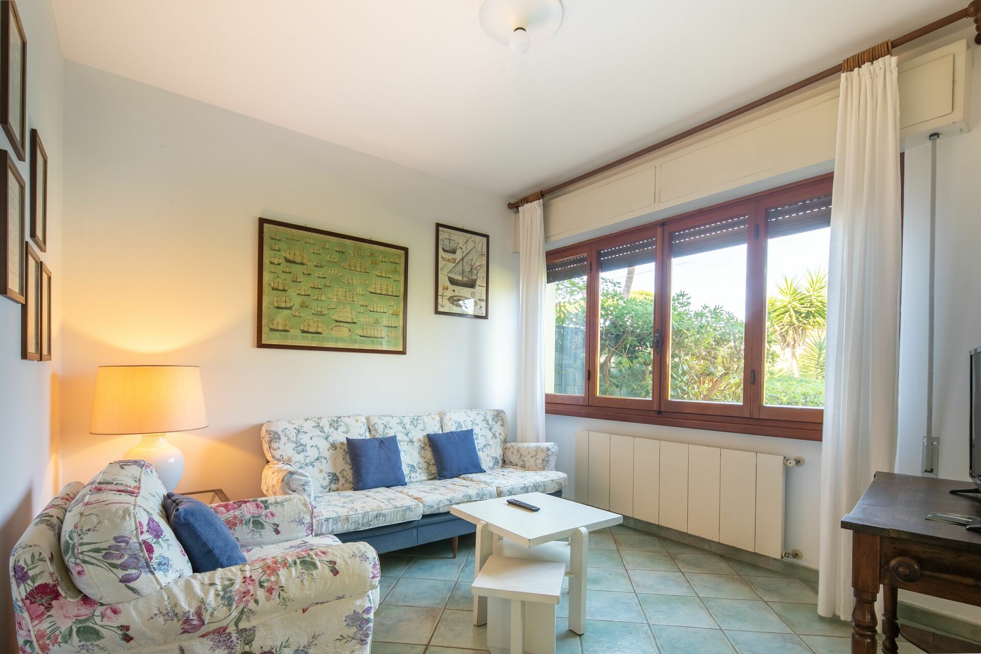 Woonkamer: bank, fauteuil, tv, uitgang naar het terras.