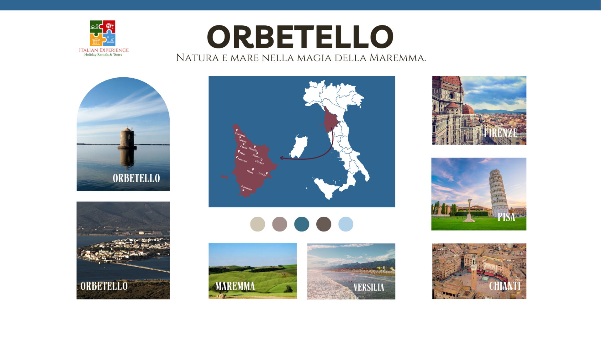 Een aantal andere belangrijke toeristische bestemmingen zijn: Florence 182 km, Viareggio 216 km, Forte Dei Marmi 230 km, Rome 160 km, Venetië 433 km en Milaan 472 km.