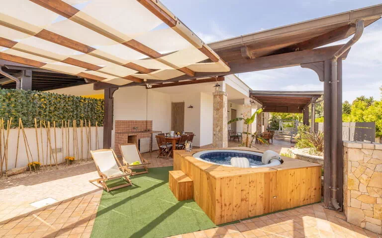 "Amleto", halfvrijstaand huis 3-kamers 70 m2. Comfortabel en gezellig ingericht: woon-/eetkamer met 1 2-pers divanbed en TV. Uitgang naar het terras. 1 2-pers. kamer. 1 kamer met 2 bedden. Uitgang naar het terras. Keuken (oven, 4 kookpitten (vlammen), magnetron, diepvriezer). Uitgang naar het terras. 2 douche/bidet/WC's, hydro massage bad (privé). Air-conditioning. Geen stookmogelijkheid. Groot terras gedeeltelijk overdekt. Terrasmeubelen, zitgelegenheid. Ter beschikking: wasmachine, kluis, strijkijzer, klamboe, kinderbed tot 2 jaar, haardroger. Parkeerplaats (omheind, 1 Auto). Geschikt voor families. 1 huisdier/hond toegestaan. LE07508591000001992