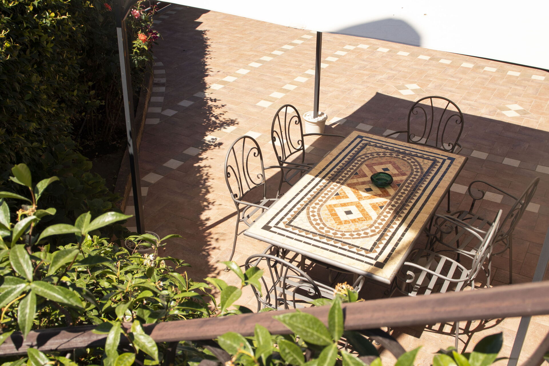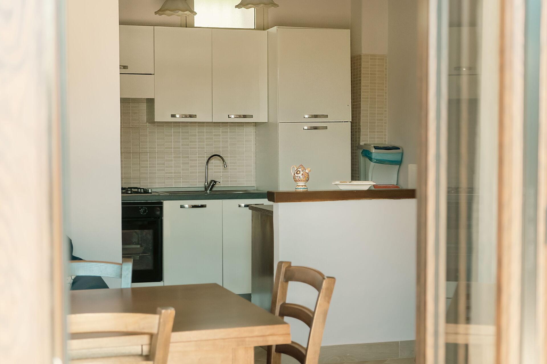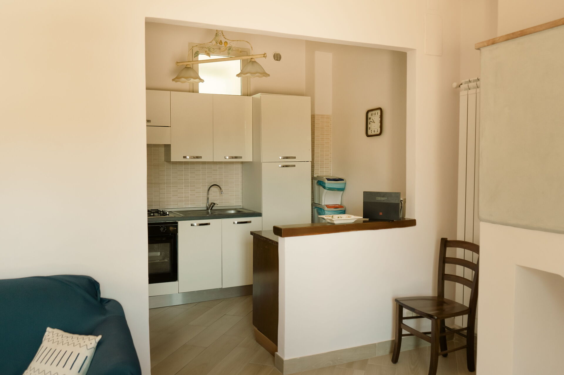 Keuken – woonkamer (60 m2): goed uitgeruste keuken, eettafel (personen: 7), ijskast, diepvriezer, kookplaat, oven, bank, airconditioning, tv, uitgang naar de patio.