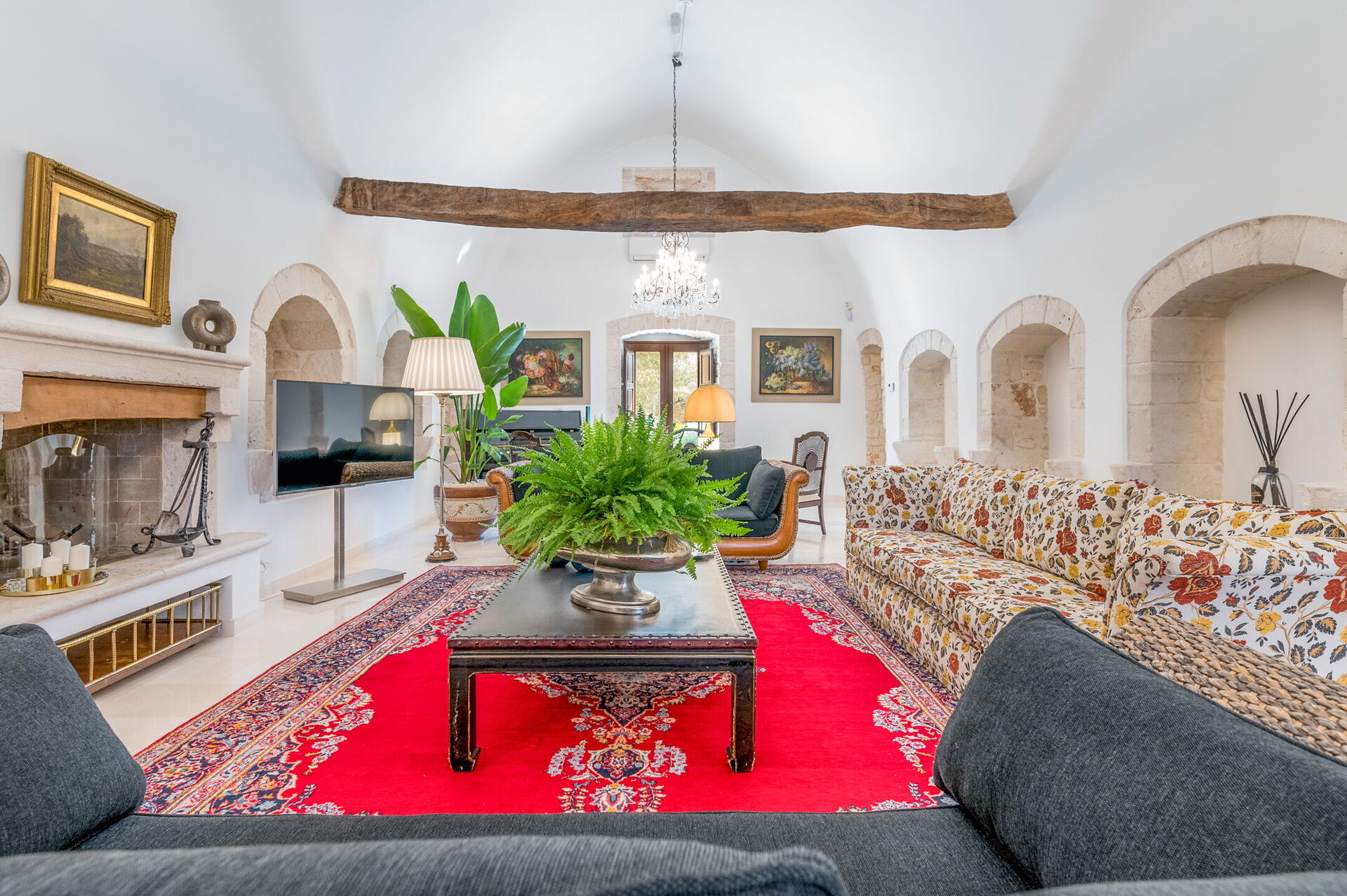 The entrance opens to the large and bright living room with three sofas, a fireplace and a spacious table, which leads to the kitchen, already equipped with dishes and appliances. Here, on the ground floor, there is the first of the four bedrooms, which inside houses a Jacuzzi, next to which there is a bathroom with shower. In addition, you can enjoy a bright and classic relaxation/reading room.