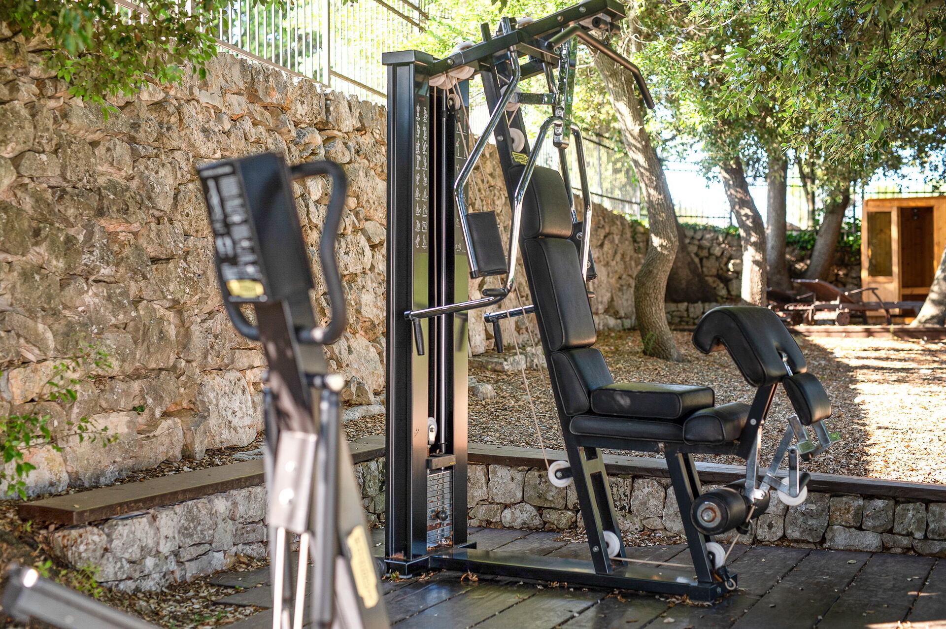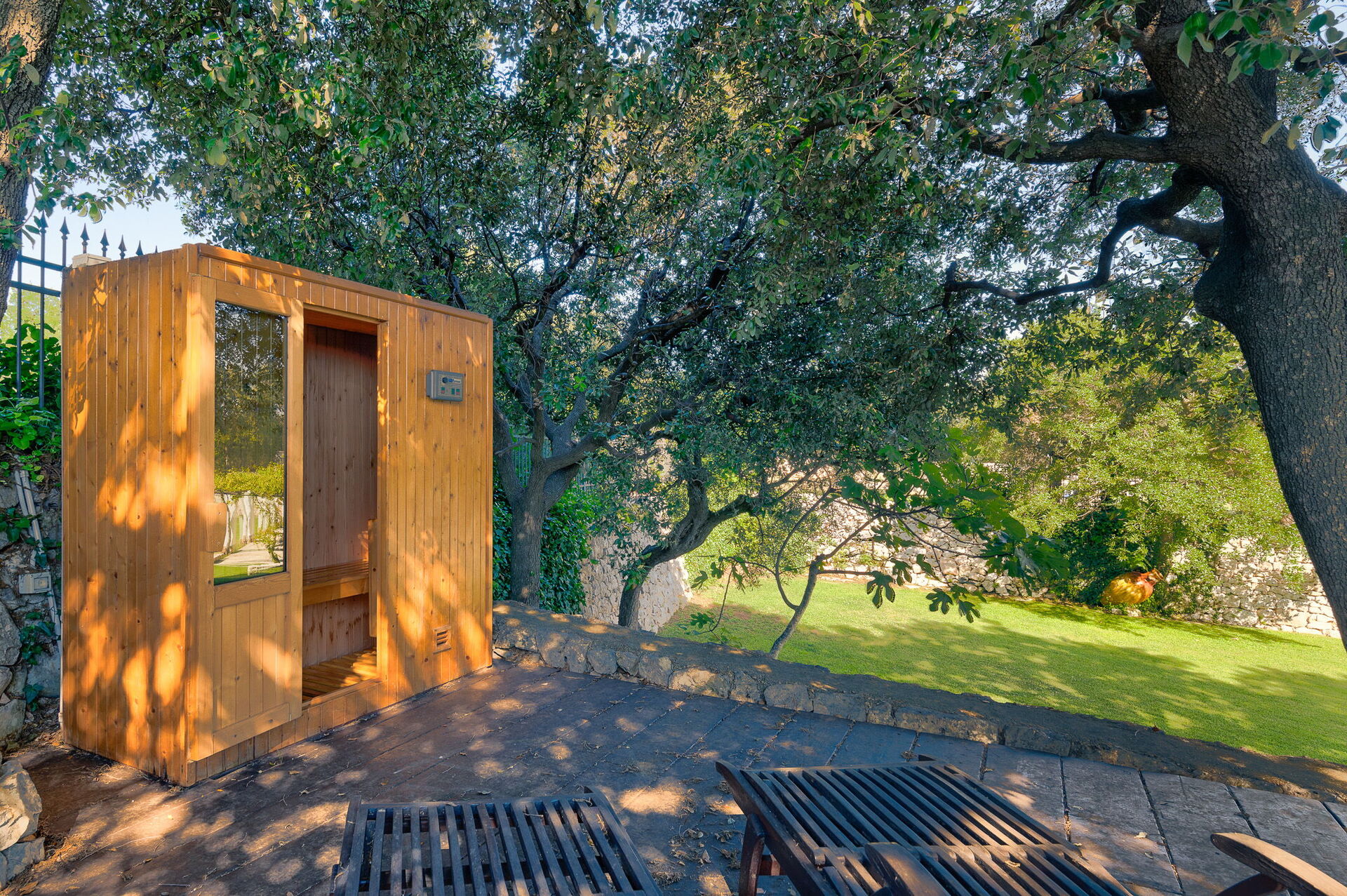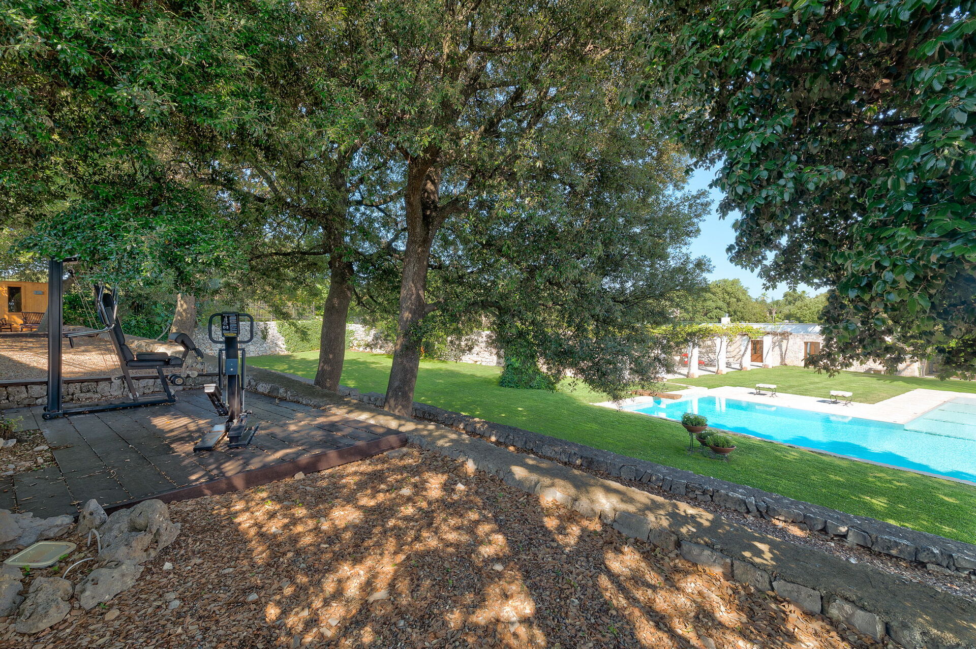 The outdoor spaces are essentially divided into two environments. On one side there is the swimming pool, surrounded by green lawn, fitness area and outdoor sauna. Through a gate leads to the second external environment: a large patio surrounded by a pergola under which you can organize lunches and dinners, facilitated by the presence of an outdoor kitchen, a wood-burning oven and a barbecue.