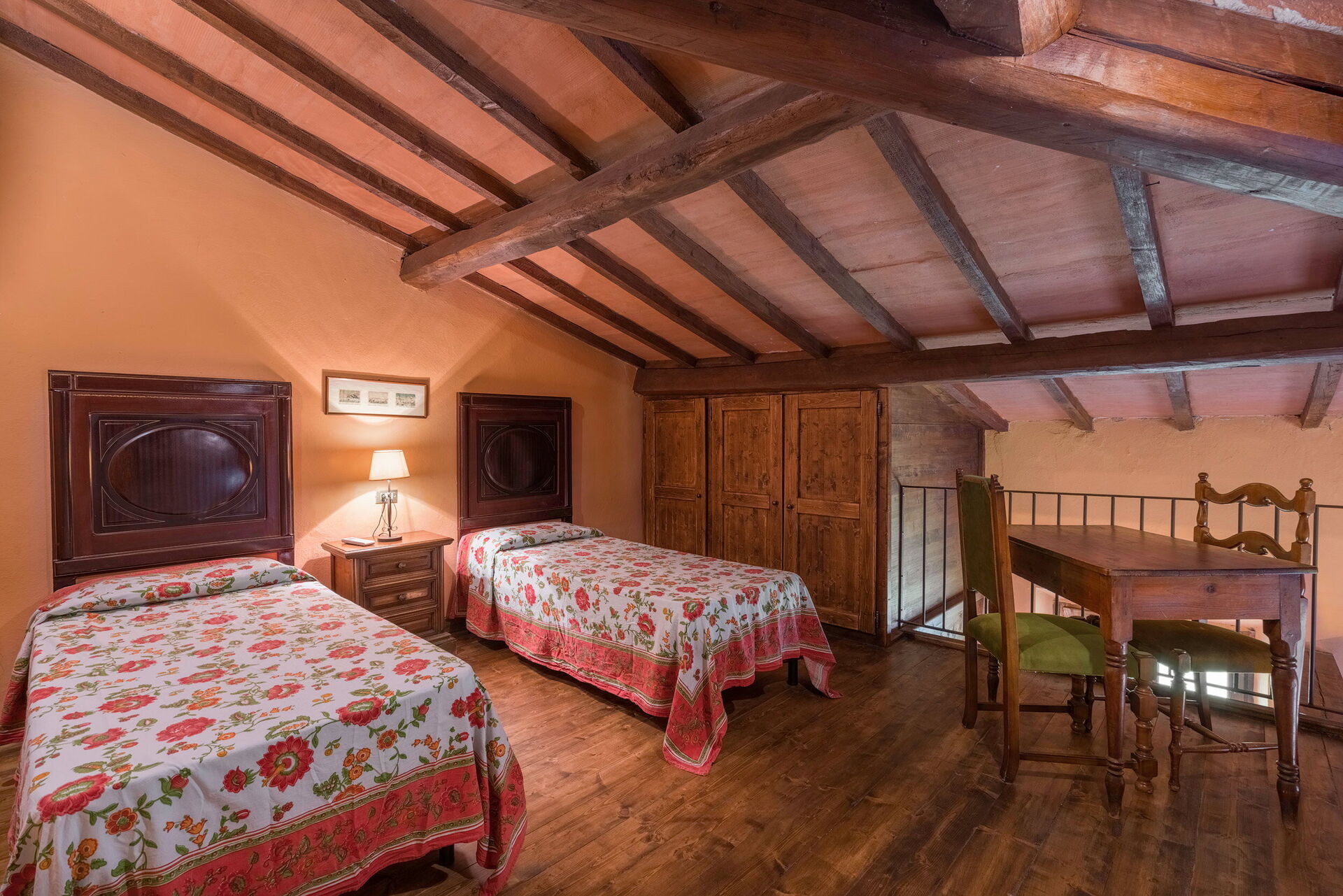 Slaapkamer met badkamer 1: tweepersoonsbed, twee eenpersoonsbedden, WIFI internet, airconditioning, twee fauteuils, open haard, wastafel, toilet , bidet, douche, vide.
